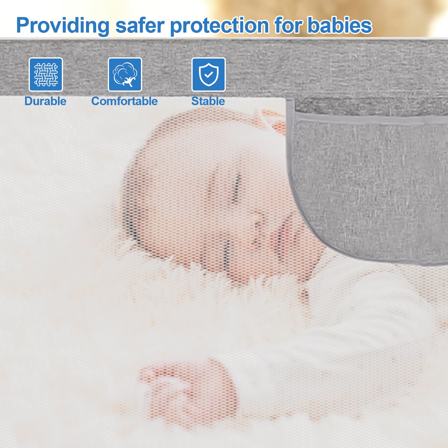 ["Prevents trapping and suffocation hazard: The bed rail design ensures a seamless connection and prevents trapping of the baby's head or limbs. The breathable polyester mesh fabric cover is durable and breathable.","One-sided height adjustment and easy operation: In addition to the overall height adjustment, the bed guard rail can also be flexibly raised or lowered on one side. You can lower the guard rail on one side to easily access the bed or pick up the baby. Multiple bed rails can be connected together.","Adjustable height: Our bed guards have a minimum height of 70 cm and are available in lengths of 150 cm, 180 cm, and 200 cm. They fit 99% of beds. The two base supports of the baby bed guard rail offer 28 adjustable positions, allowing the guard rail to freely move up and down between 70 cm and 98 cm.","Safety and stability: Our bed guard rail is made of thick-walled steel tubing. The upper handle position is wrapped with high-density, strong rebound material. You can rely on it not deforming or wobbling.","Easy to clean: The bed guard mesh cover is washable and reusable, so you can wash it whenever you want. It can be disassembled when not in use to save space. The entire bed rail can be folded down and secured under the mattress for easy access."]