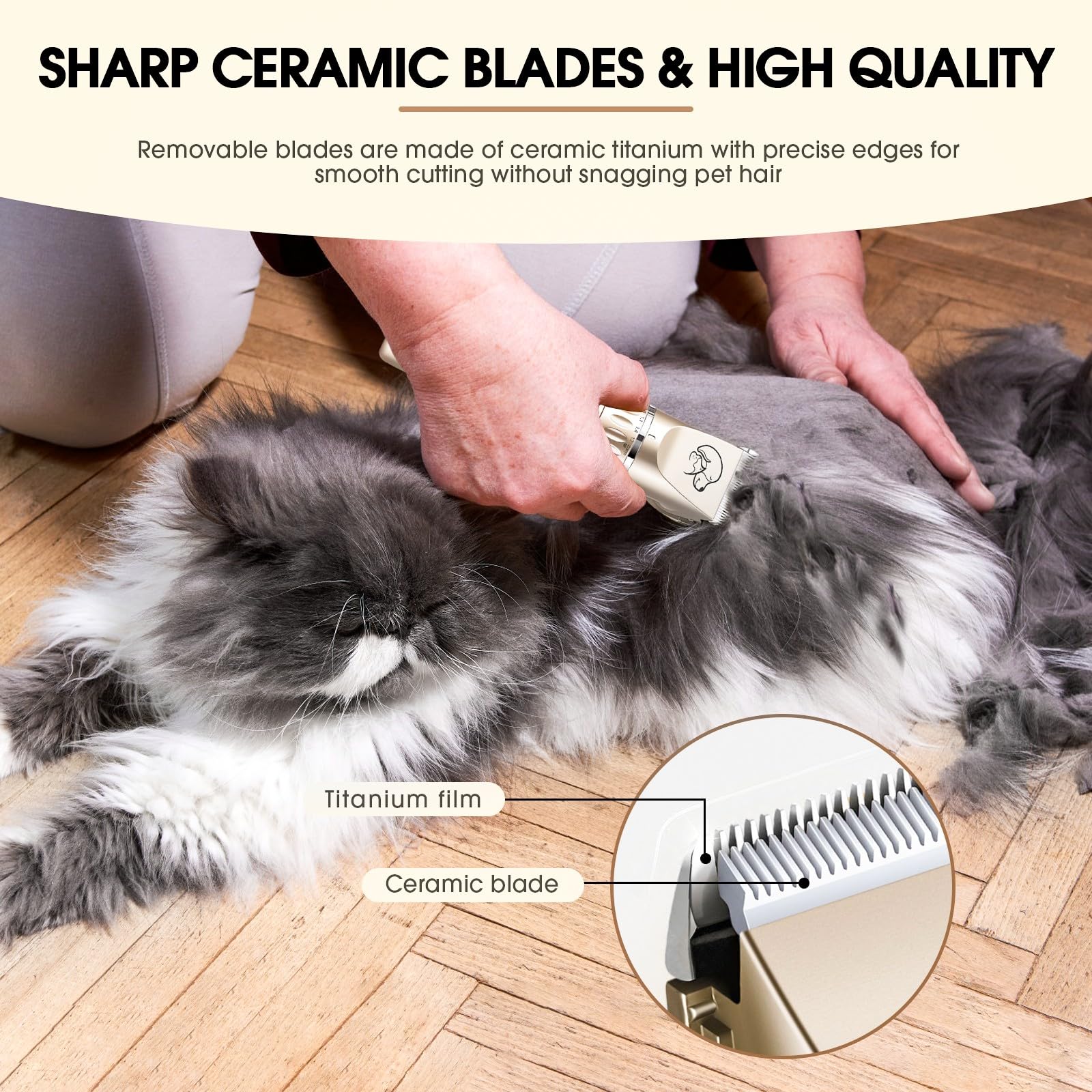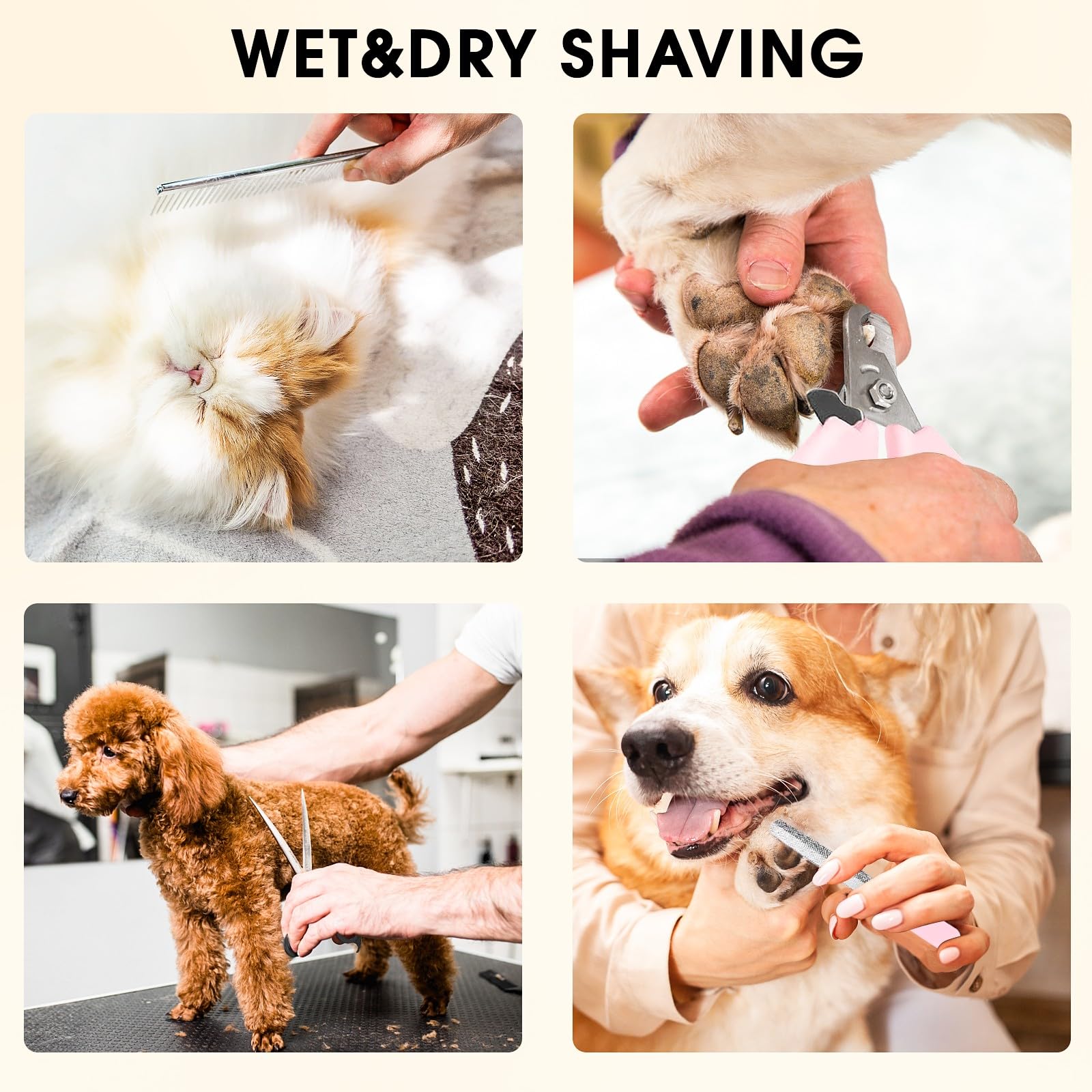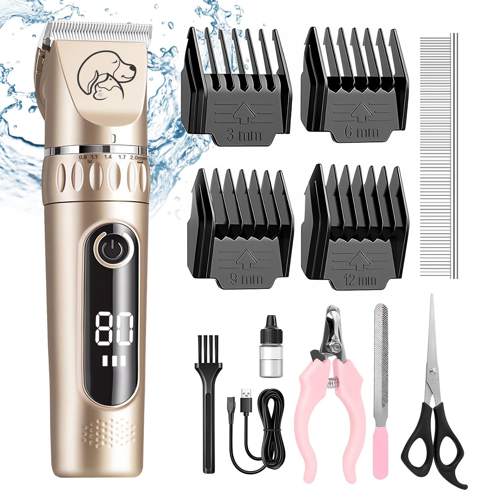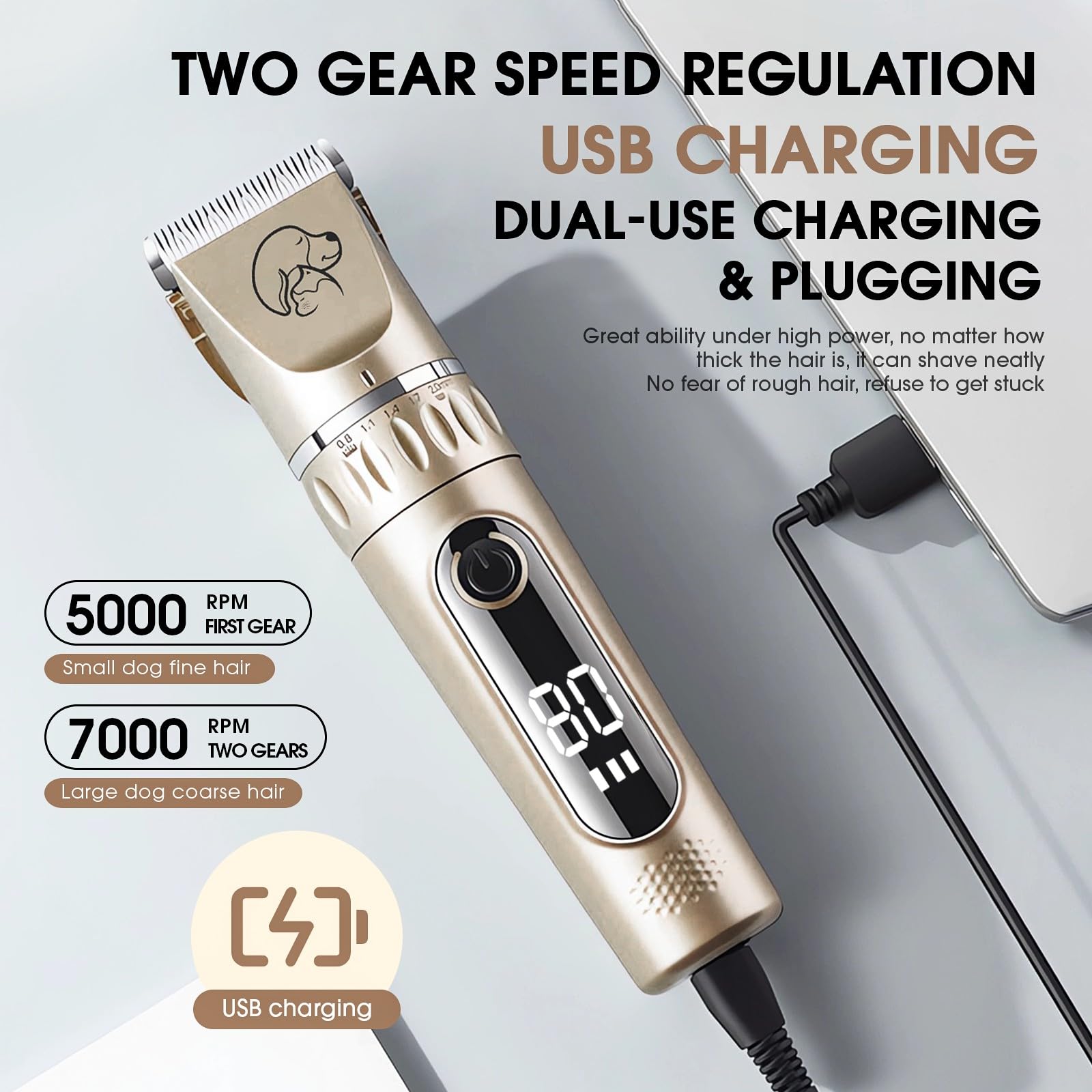["Durable Ceramic Blades: The dog grooming scissors feature 30-tooth titanium blades combined with movable ceramic blades that can easily cut thick animal hair, including curly and long hair. The cut is smoother, sharper, and more durable.","Sharp Ceramic Blades: The detachable blade is made of ceramic titanium for a precise edge and cuts smoothly without animal hair getting stuck. It is also durable and high quality to protect your pet from pulling and cutting. Also included are 4 positioning combs and a set of grooming accessories, making it easy to groom your pet at home.","Intelligent Mode: LED lights remind you of the scissor's power and prompt you to charge it in time. Dog clippers themselves have five gears to adjust the blade length. The comb density ranges from 0.8 mm to 2 mm. Dual-speed motor, capable of handling fine cat hair or coarse dog hair.","Washable and Cordless: This dog clipper has a 1500 mAh battery capacity, which can be charged and used anytime, anywhere with a USB cable. It can also be used cordlessly and can work continuously for 2 to 3 hours. It is recommended to remove the cutting head for cleaning and dry it before installation and use.","Why Choose Us?: Our dog grooming set provides 24-hour technical support. We hope that our products make the experience easier and happier for you and your pets. A user manual is included in the package. If you have any questions about the product's use, please contact us immediately."]