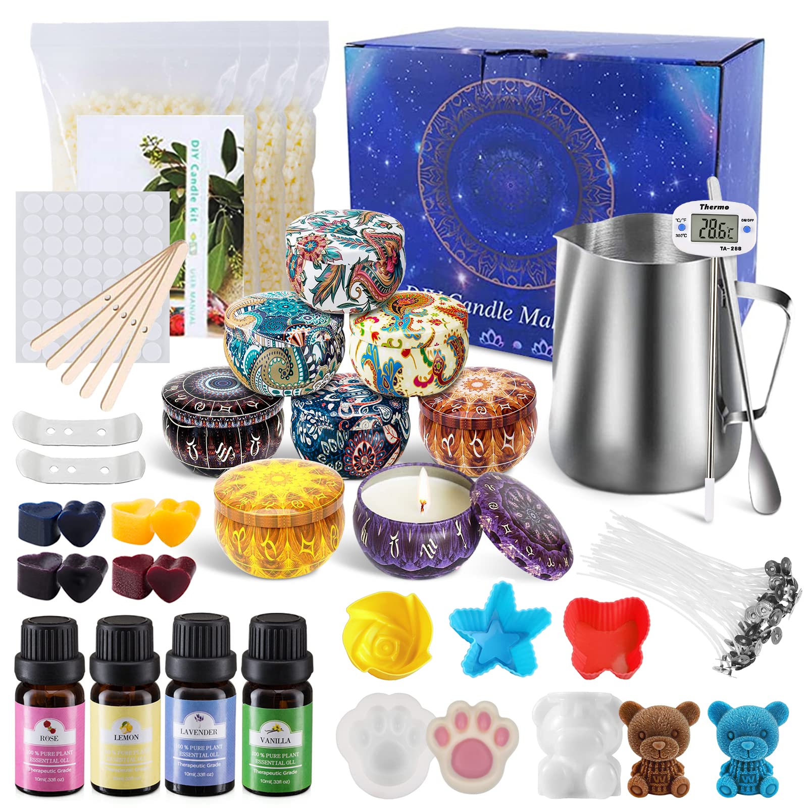 ["✨ Complete DIY Candle Making Kit】This candle making kit contains everything you need to make candles: 1*550ml melting pot, 1 stirring spoon, 1 temperature measurement, 4 bags of beeswax, 8 decorative candle tins with lids, 8 color blocks, 80 wax cores, 56 adhesive dots, 5 stirring sticks, 5 silicone molds, 2 candle wick holders, 1 instruction manual, 1 exquisite gift box. Perfect for beginners.