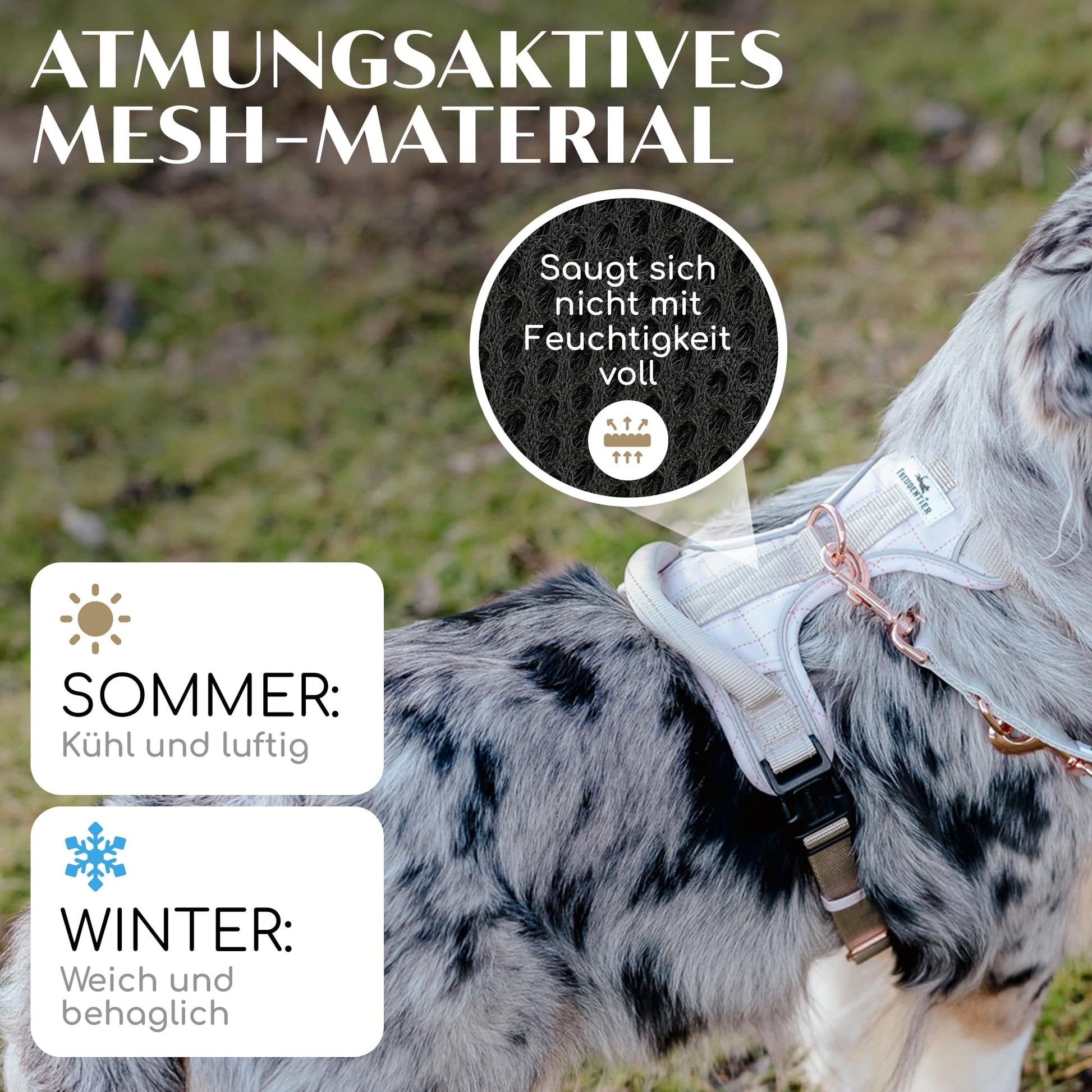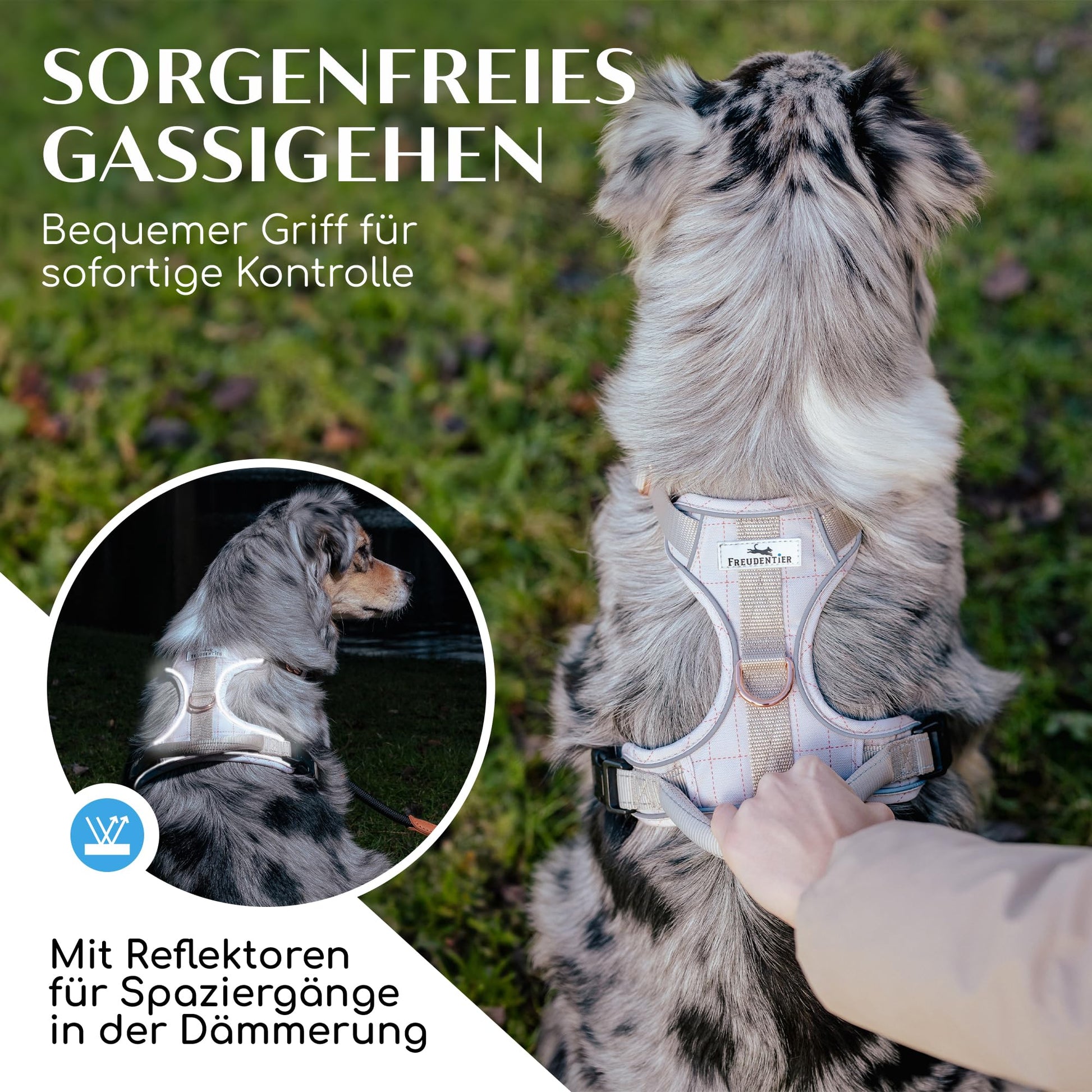ANTI-PULL FUNCTION: This no-pull dog harness is specially designed to reduce pulling on the leash. An additional ring on the front allows the leash to be attached to the dog's chest area. When your dog pulls, they are gently redirected to the side, naturally reducing pulling behavior. At the same time, the harness evenly distributes pressure on the chest and shoulders, preventing any discomfort. Ideal as a Y-harness or anti-pull harness for dogs that need to be guided safely and calmly.