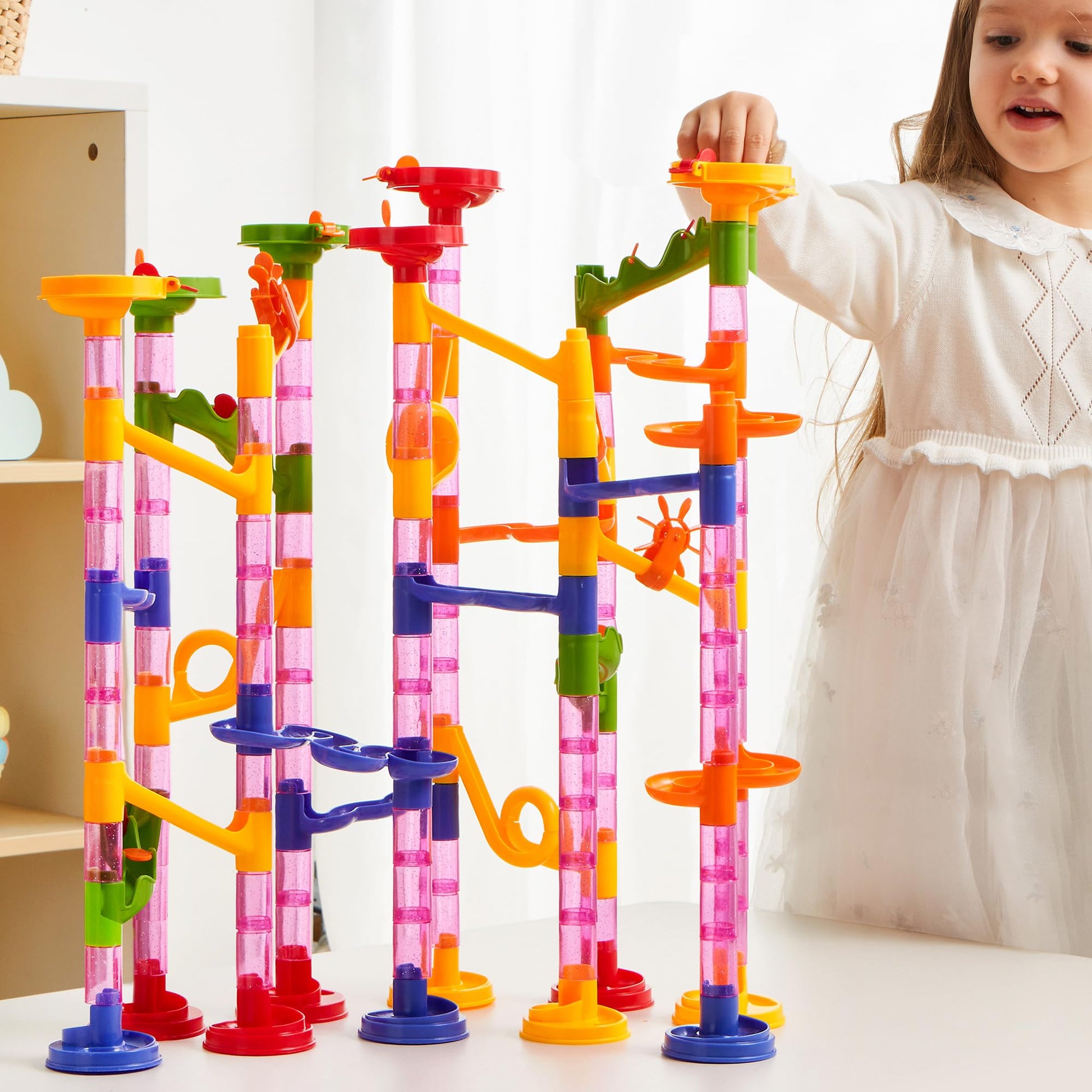 ["196-piece marble run set with transparent parts, endless fun for your child, watching marbles run on tracks.","The valuable toy set consists of 156 different colored parts and 40 small glass marbles.","All tracks easily snap together and the set is stable once built with our professionally designed shapes.","The marble run set comes with assembly instructions that help improve children's hand-eye coordination. Once they learn, they will have the ability to build different ball tracks through their imagination and logical reasoning. Perfect toy set for developing children's creativity, logical thinking, and hand-eye coordination. Play and gain patience and problem-solving skills. Excellent gifts for all children.","CHILD SAFETY: Meets EU toy standards. Safety tested, 100% non-toxic."]