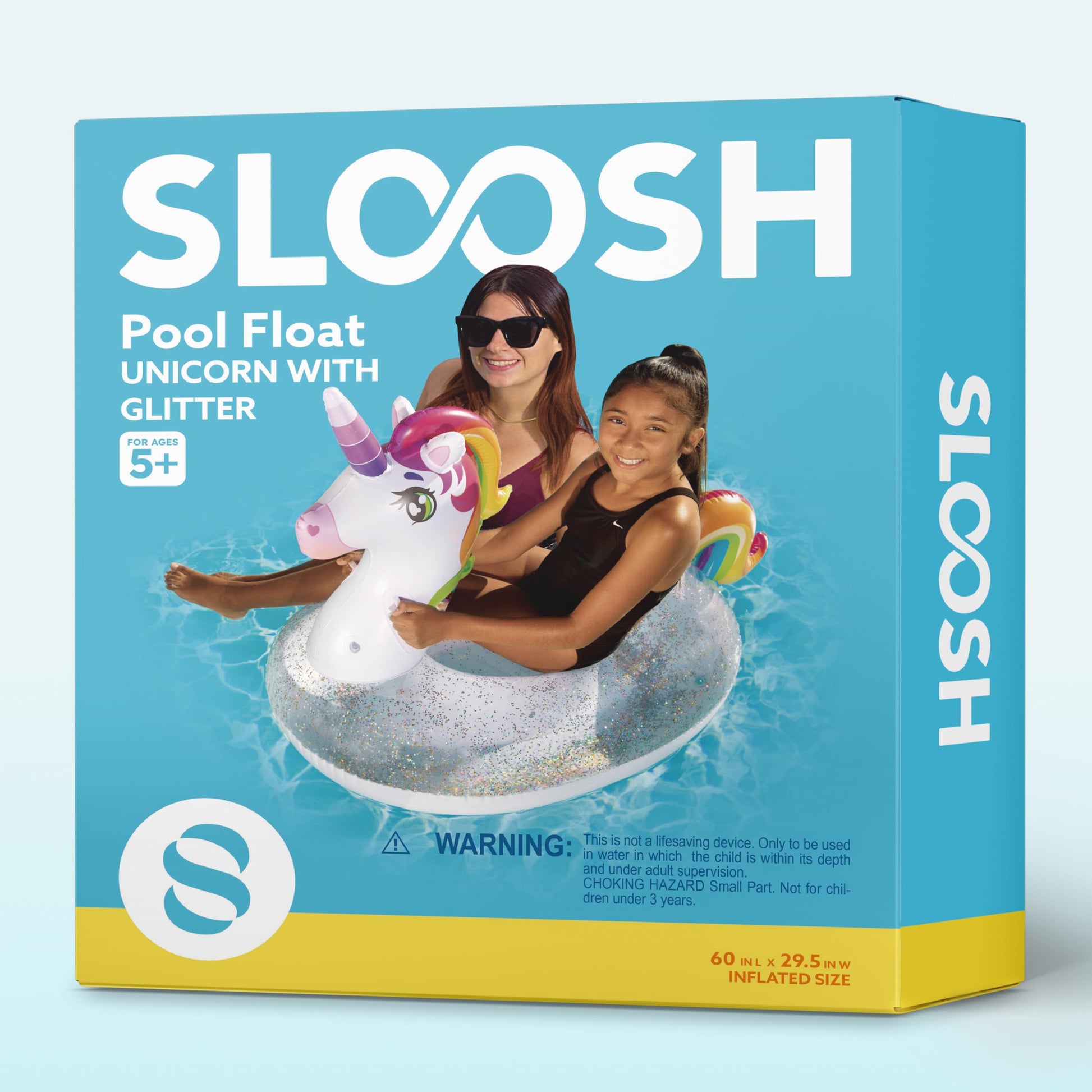 "POOL FUN: Add some joy and fun to your pool party. This sparkling unicorn floater will brighten up pool and beach activities with lots of smiles. Great pool toy for kids on hot summer days.",
