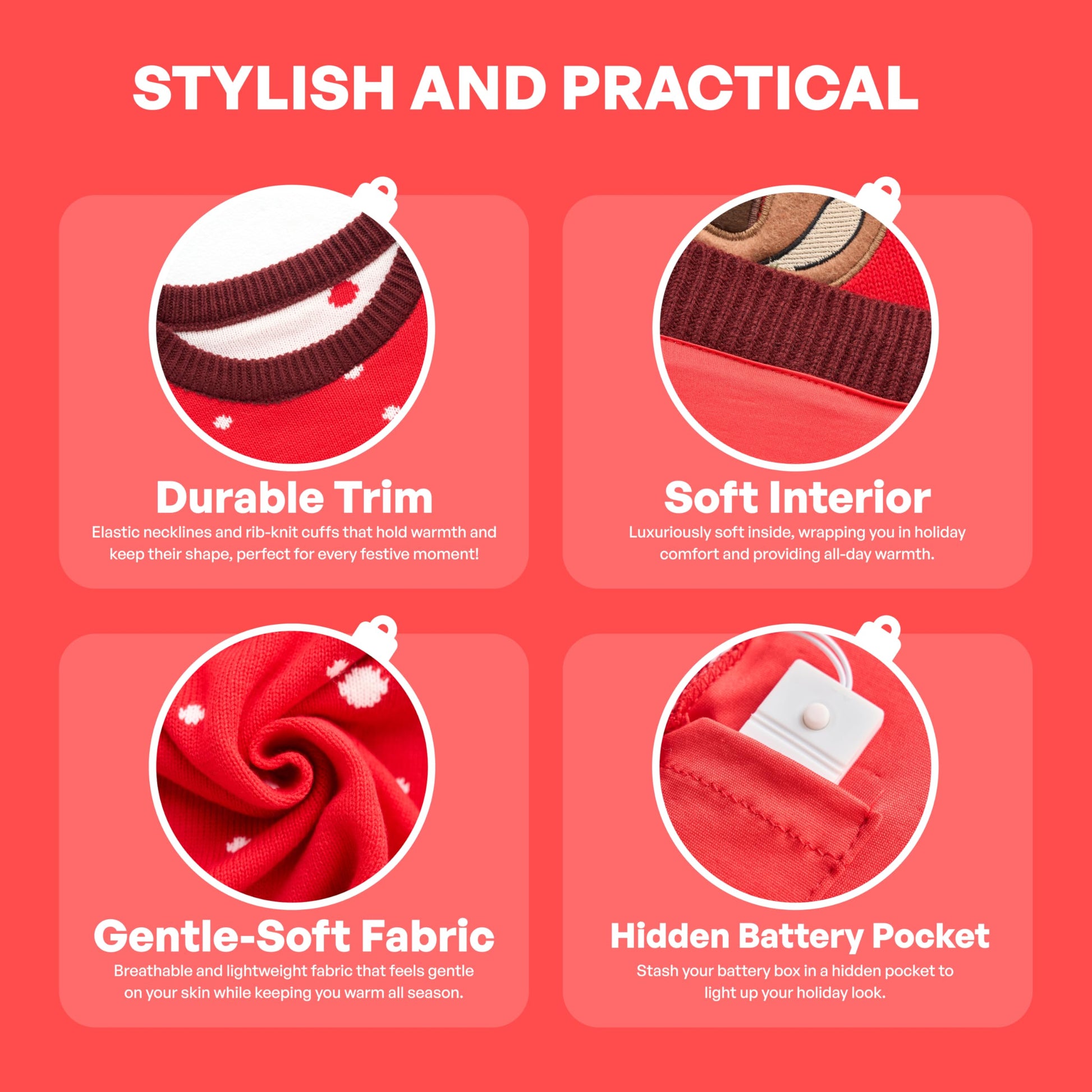 "Value pack. Our funny reindeer sweater has 6 different lighting modes to bring the Christmas spirit to your winter holiday party. Our battery box is located in a hidden pocket. Detailed instructions can be found in the included manual."