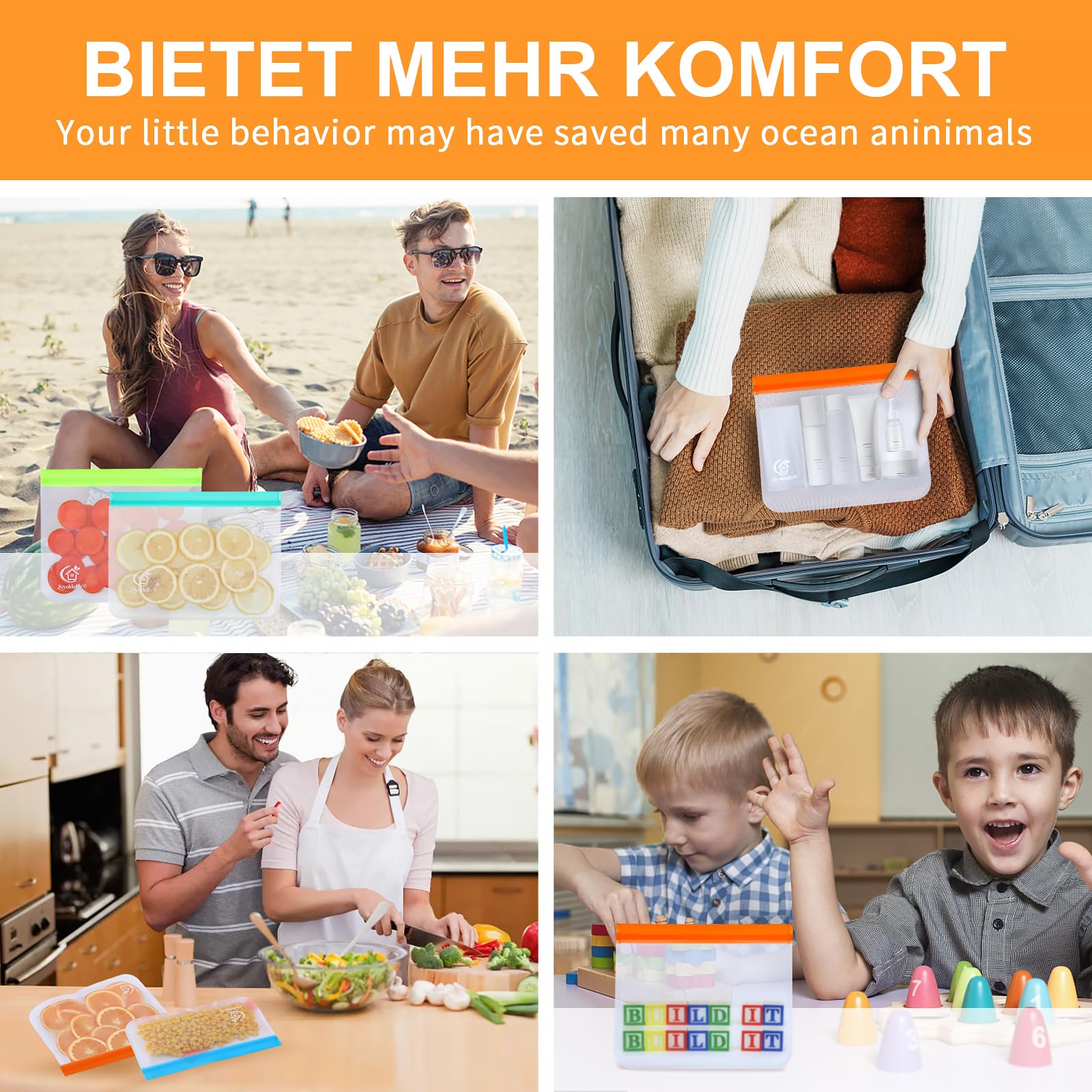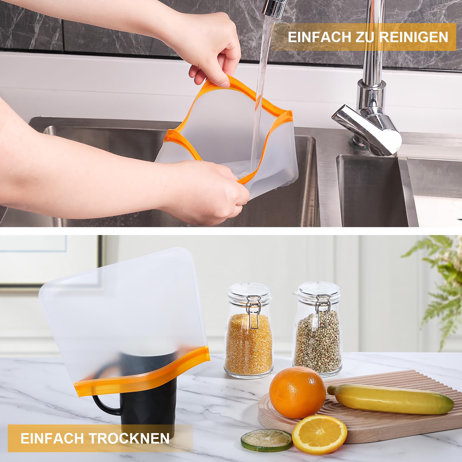 "🥝PEVA material in food grade: These reusable sandwich bags are made from biodegradable PEVA material and contain no PVC, lead, chloride, or BPA. Allows for safe storage and all kinds of food like sandwiches, fresh fruit, vegetables, snacks, cookies, fries." 🍓Waterproof design with double zipper: Thick material and improved design with double zipper seal, improved sealing, no water leakage, no air leakage, odor and antioxidant protection, ideal for transporting and storing food to keep food fresh; It can be safely used in the refrigerator to store frozen meat, chicken, fish, fruits and vegetables. 🍑Easy to clean and store: These reusable sandwich bags are very easy to clean. We recommend washing them by hand instead of putting them in the dishwasher as the dishwasher can deform the zipper. You can clean it with a simple dish brush and then hang the reusable food bag to dry on the glass. The transparent layout allows for intuitive navigation of the contents. 🥑Widely used: Our reusable food storage bags are available in 4 sizes (4 pieces: 26.8 x 28cm, 4 pieces: 26 x 20cm, 6 pieces: 22 x 16.5cm, 6 pieces: 22 x 12cm). The reusable storage bag can not only be used for storing solid or liquid food in the kitchen, but also for storing other small items to avoid loss. 🍇Environmentally friendly: Choose our reusable storage bags to reduce the use of plastic bags and minimize soil pollution. Your small act can save the planet. If you are not satisfied with the order or purchase, do not hesitate to contact us to find a solution."