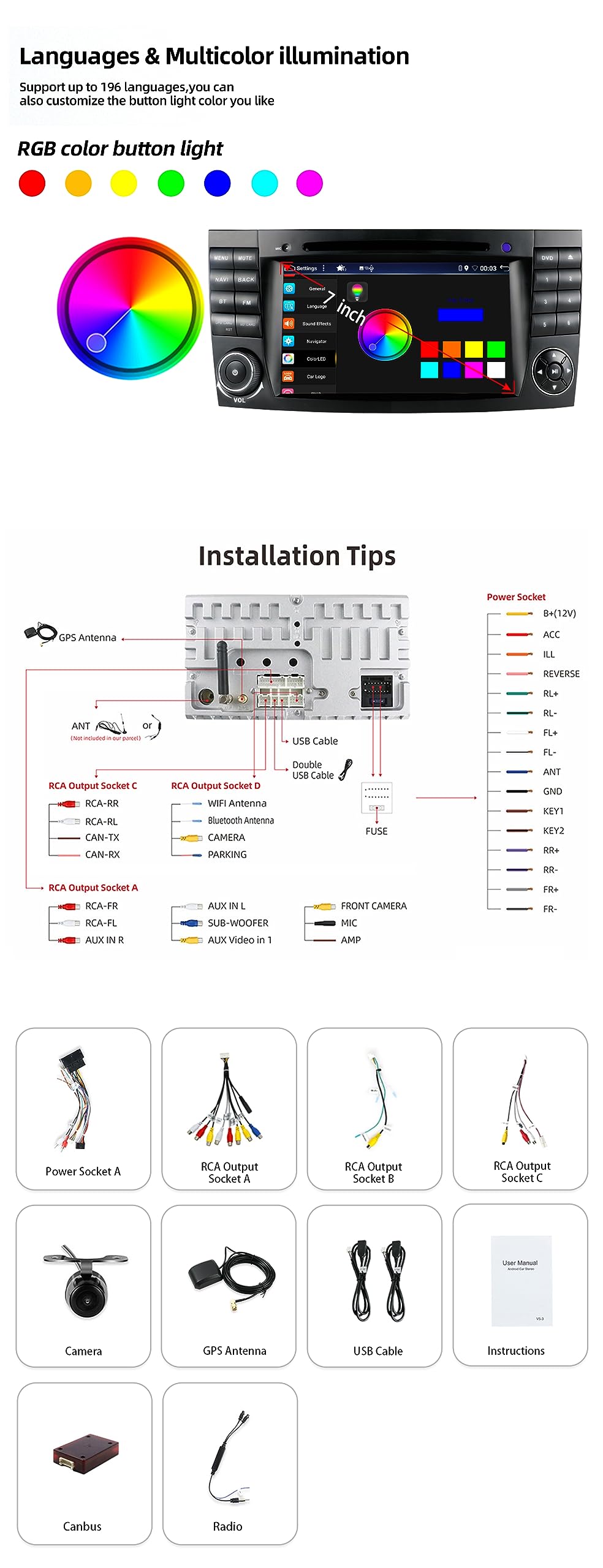 ["【ANDROID 14 , 2G + 32G】 Based on the Android 14 operating system, with (2 GB RAM / 32 GB Rom) | With the powerful Quad-Core Cortex A7 x 1.6 GHz processor, you can work faster and more stably, install more apps, and store files than with other standard car radios on the market. ▲ GIFT: Rearview camera.","【APPLICABLE CAR MODELS】Android 13 Car Radio Fit for Mercedes-Benz E-Class W211(E200/E220/E240/E270/E280)(2002-2008) | CLS Class W219(CLS-350/CLS-500/CLS-55)(2005-2006). If you are not sure if you are suitable or not, please contact us for help with pictures of the dashboard. Contact: joyx_techsupport@163.com","【WIRELESS CARPLAY - ANDROID AUTO】 Built-in Carplay and Android Auto, it is wireless Carplay and Android Auto (via Bluetooth or USB cable), making operation much easier, allowing you to access map navigation, phone contacts, notifications. Music, and more while focusing on the road. And much more fun.","【FAST-BOOT & SPLIT SCREEN】 Access the system in less than 2 seconds to speed up the boot time of the Android system from 25 to just 2 seconds, is never easy. ▲ Allows running two apps side by side. You can use Spotify or another app while navigating.","【MULTIFUCTION】 Bluetooth hands-free call / Multimedia streaming music | Split screen | Better WiFi | AM FM Radio reception RDS | DAB + Radio (ASIN:B083Q7YG4F) | USB storage and MicroSD memory card (up to 500GB) | Steering wheel control | Full HD 1080P video playback | AV output function | Carplay and Android Auto Supported (ASIN: B086W6ZD74) | Mirror Link (Smartphone screen mirroring) with iOS or Android."]