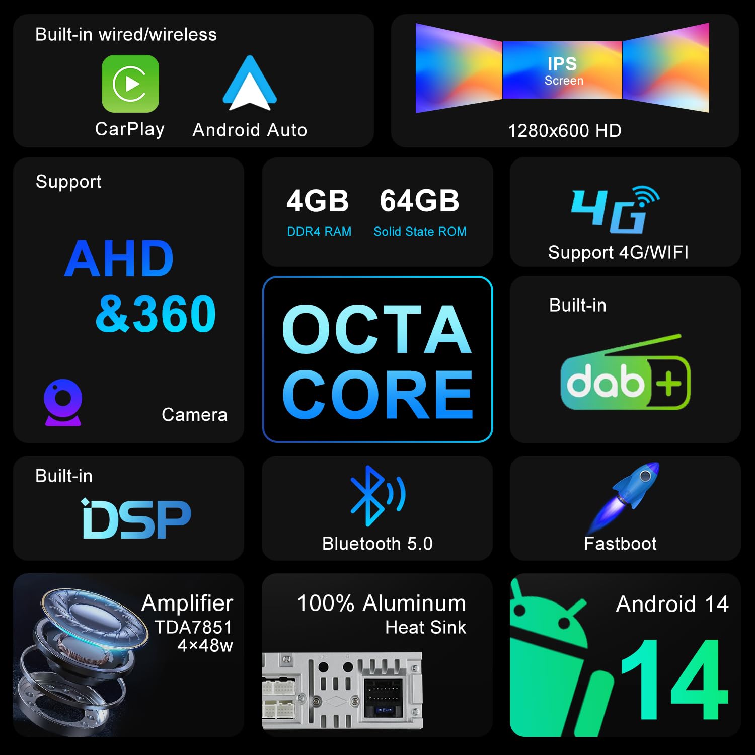 ["【4G + 64G , AC8257 - 8 Core】Android 14 system, ( 4GB RAM & 64GB ROM ) - TOP CPU: Rockchip AC8257 - Octa Core - 64-Bit Processor - 2.0 GHz - Radio IC: TDA7786 - Amplifier IC: TDA7851 - allowing you to enjoy faster and more stable performance. Deeply optimized, maximum capacity, no more \"deficit\" in memory, making data processing more efficient. ▲ GIFT: LED backup camera | External microphone.","【BUILT-IN DAB - FAST BOOT - 360 CAMERA】 The highly sensitive DAB+ tuner is built-in. You can enjoy better sound quality and a more powerful digital audio transmission channel. Access the system in less than 2 seconds to shorten system startup time. With the 360° panorama park function, you have a clear view of the surroundings of the car. (optional, 4 AHD cameras sold separately)","【CARPLAY - ANDROID AUTO - DSP】 Built-in Carplay and Android Auto (wireless or wired), simply connect your phone and access features such as phonebook, music, and navigation directly. Focus on the road to ensure safe driving. Built-in DSP sound effects to enhance flexibility, dynamics, and transients of the high and low tones of the original car amplifier, continuing to create your golden sound quality.","【 CAR MODELS 】 Perfectly compatible with Honda Accord 7th (2002-2007) . Please contact us for assistance with pictures of the dashboard at Contact: joyx_techsupport@163.com","【SPECIALTY】 4K video (3840 × 2160 pixels) / 1080P HD video / MirrorLink with iOS or Android phone / Built-in WiFi modem / Online and offline GPS navigation apps, support for 3D maps and voice guidance / AM FM radio reception RDS / USB and MicroSD memory card (up to 500 GB) / Steering wheel control."]