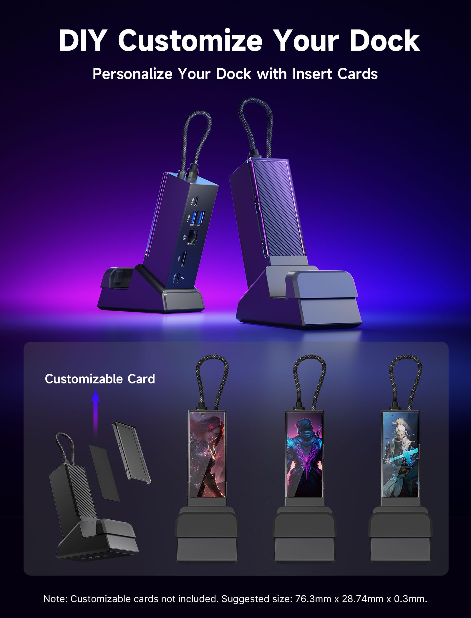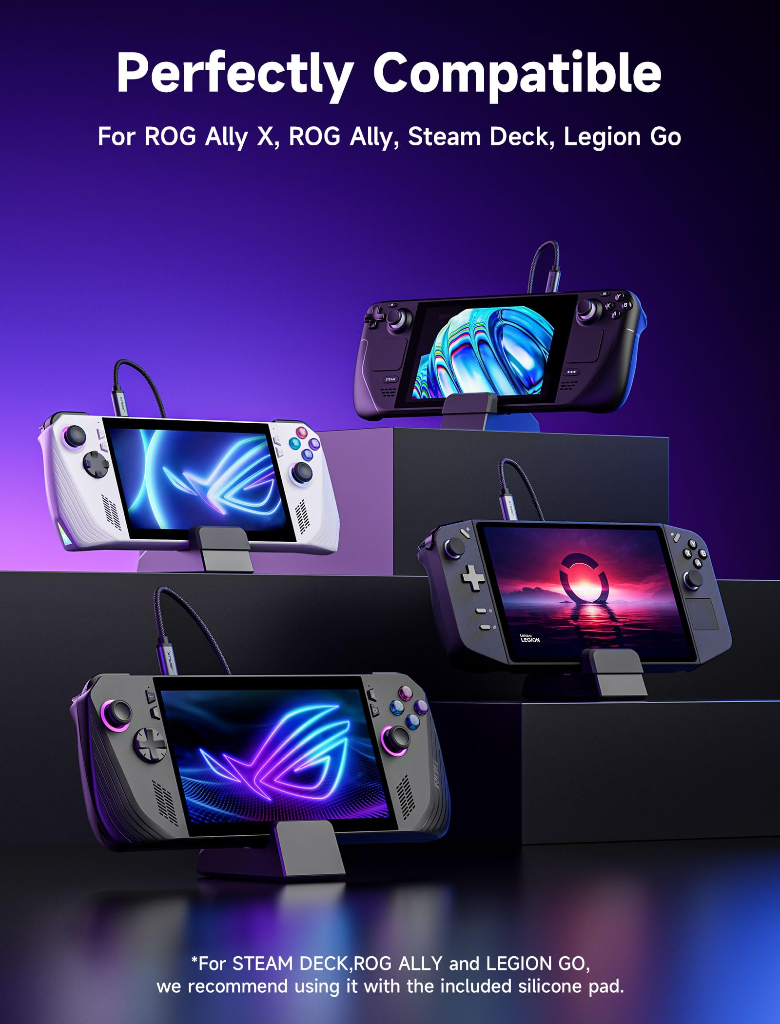 ["6-in-1 Docking Station for handhelds: Enhance your gaming experience with 4K@120Hz HDMI output, Gigabit Ethernet, USB C PD charging, USB C 3.2 Gen 1, and two USB A 3.2 Gen 1 ports.","Modular Docking Station & Flexible Dock: The JSAUX Docking Station offers two usage options. Use it directly with your gaming console on the dock or remove the base for standalone use as a stand. The additional silicone pad provides a perfect fit, more stability, non-slip grip, and optimized viewing angles for a better gaming experience.","Customize Your Dock: Easily customize your dock by inserting a custom card between the front cover and the docking station. Simply remove the cover, insert the card, and reattach the cover. Note: Recommended card size: 76 mm × 29 mm × 0.3 mm. Custom cards not included.","Perfect Compatibility: Compatible with ROG Ally X, ROG Ally, Steam Deck, Legion Go, Legion Go S, Razer Edge, AYA NEO, AYA ODIN, Logitech G Cloud, and ONEXPLAYER.","4K Visuals: Enjoy crisp 4K@120Hz or 1080@240Hz HDMI output for vibrant gaming images."]