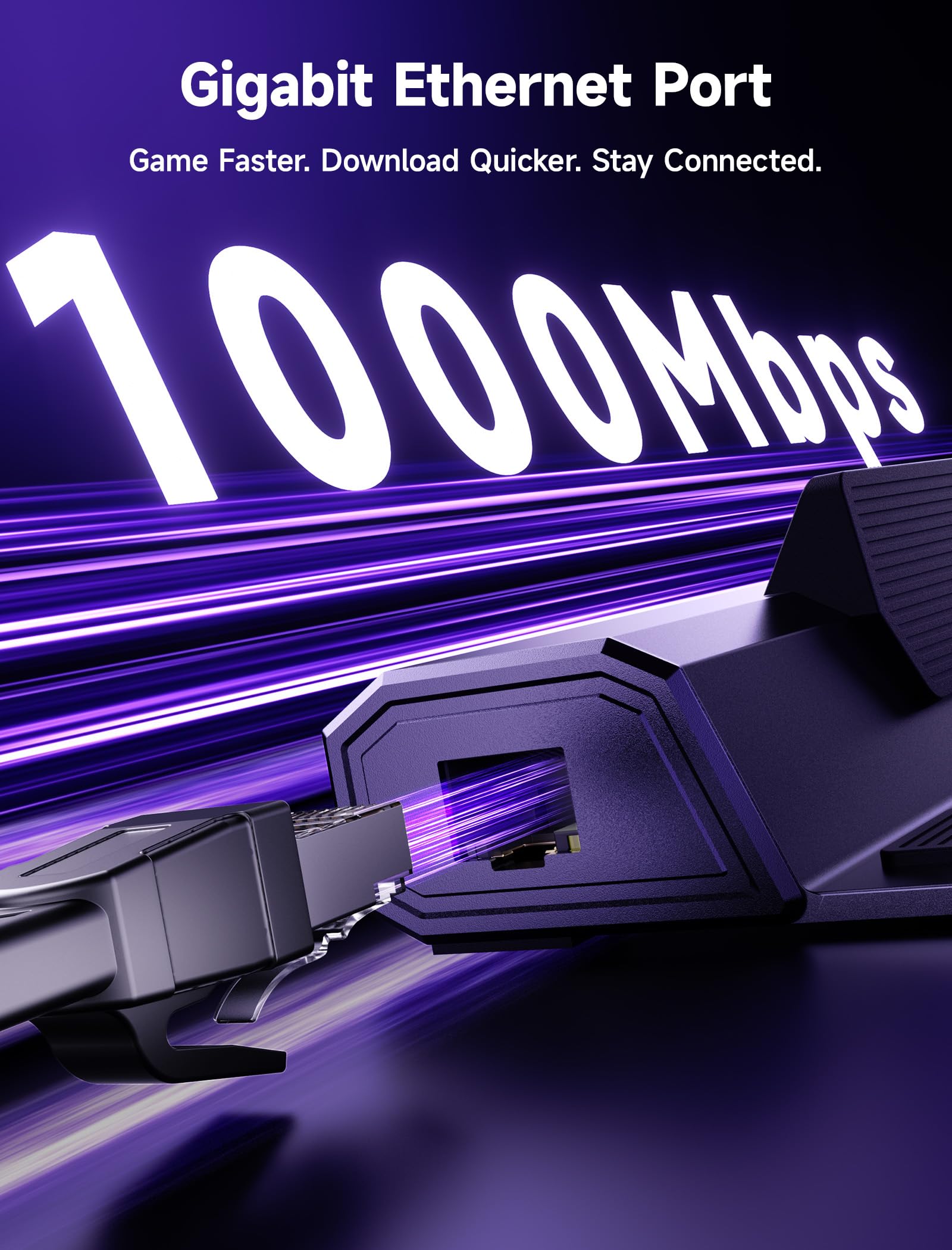 "Gigabit Ethernet: Enhance your gaming with Gigabit Ethernet for seamless online gaming, fast updates, and quick file transfers. Enjoy lightning-fast downloads and uploads, eliminating delays and latency for uninterrupted sessions"