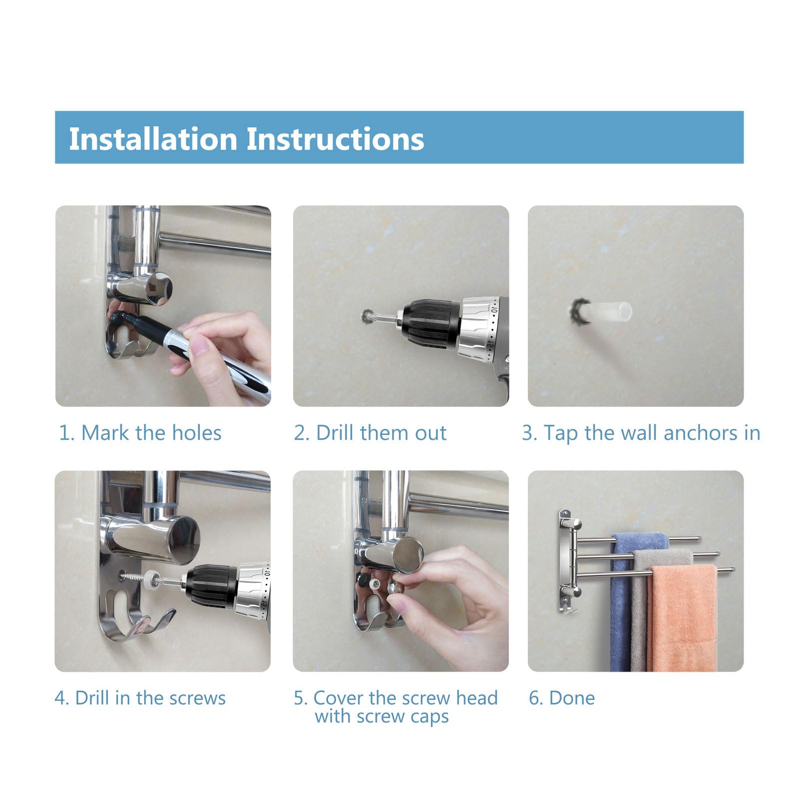 ["Robust and durable: Our wall-mounted towel holder is made of stainless materials and SUS304 stainless steel, it is corrosion-resistant, durable, and easy to clean.","Space-saving: This bathroom towel holder is a great solution for organizing towels in small spaces. With three sturdy arms, you have additional storage space for towels, washcloths, and more without taking up space.","180° rotatable: Multiple swivel arms of this towel holder allow you to spread out the desired arms for easy drying and swivel them back to the wall-saving position. The arms of this item are relatively short. Please measure before purchasing.","Stylish design: The stainless steel surface provides a stylish and clean appearance, as it resists corrosion, scratches, and rust. Mounting hardware is included.","More than a towel holder: Holds up to 23.1 lb/10.5 kg. Each arm carries 7.7 pounds/3.5 kg. Can be used in the bedroom, bathroom, closet, and kitchen; brings practical function to your space while adding some warmth and style to your decor."]