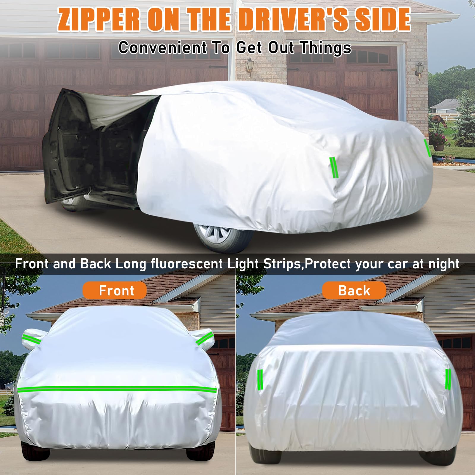 "Design Details: 1: With door zipper on the left side for easy access. 2. Windproof straps front and back to secure your car cover in strong winds. 3. Reflective strips to remind people at night. 4. Beautiful mirror pockets protect your mirror from damage. 5: Adjustable elastic hems at the bottom allow you to easily adjust the size. 6: Four tension straps help secure the cover to four wheels."