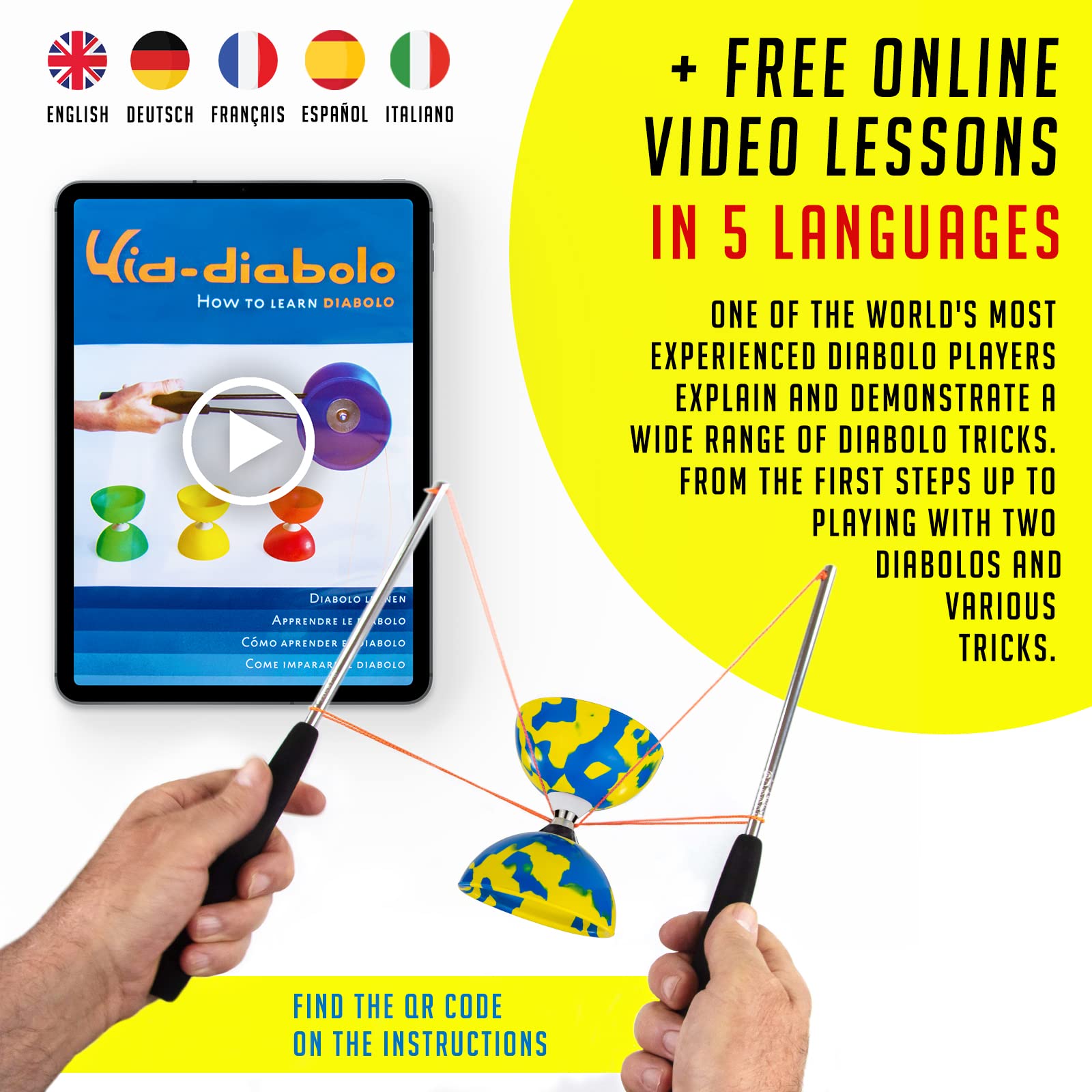 "The online video is the perfect complement to this diabolo set. World-class artists will guide you through 36 tricks on your journey to becoming a diabolo master. This clear, well-presented online instructional video was produced by a leading European circus school and is suitable for beginners of all ages. Narrated in English, French, German, Spanish, and Italian. Playtime: 40 minutes.",