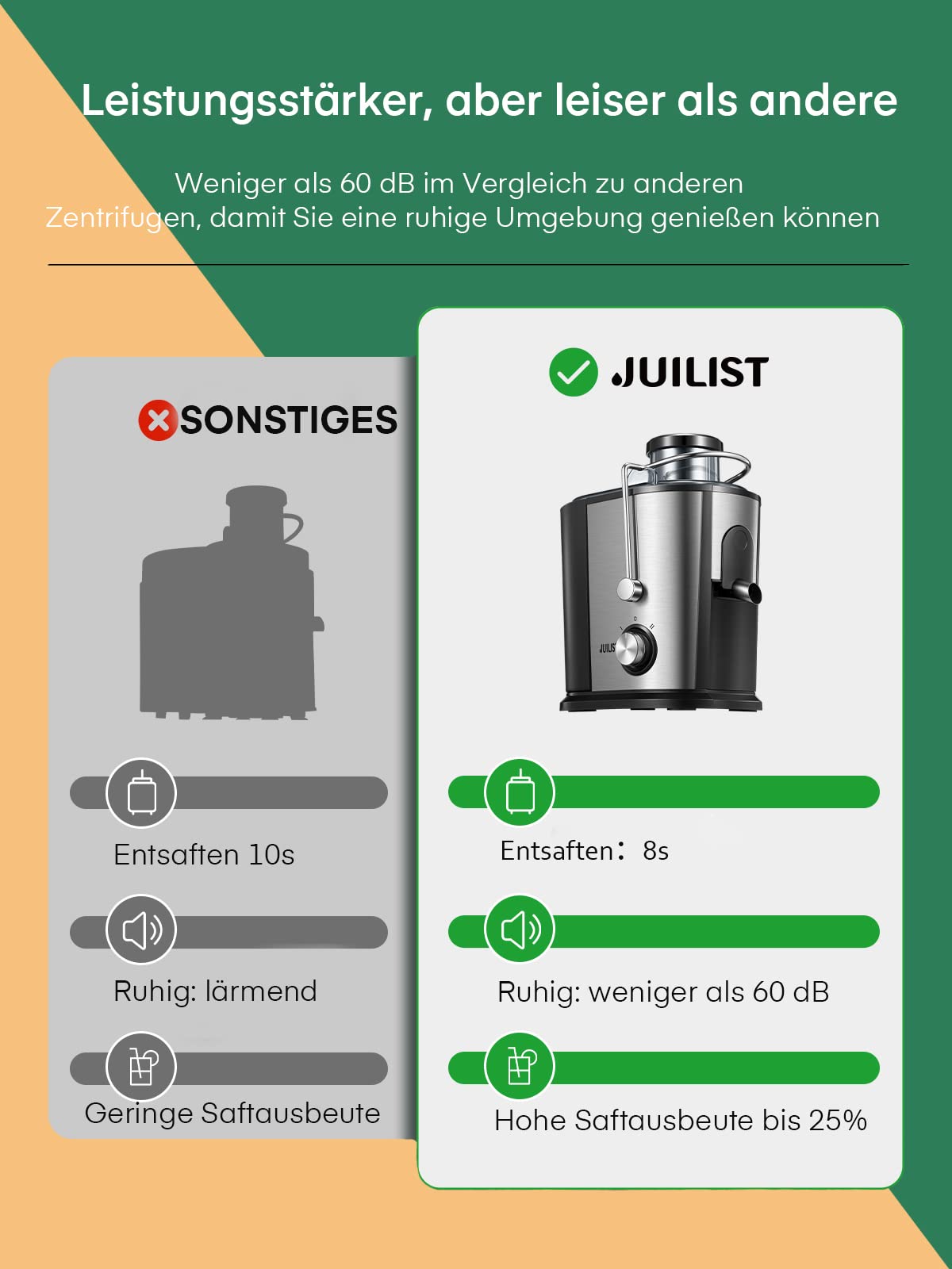 ["600W POWER & 8S FAST EXTRACTION"] The Juilist juicer is equipped with a 600-watt motor and sharp food-grade blades, capable of extracting juice from rapidly spinning pulp in just 8 seconds, increasing efficiency by 20%. It operates at a low noise level of less than 60 db, so you don't have to worry about annoying noise.