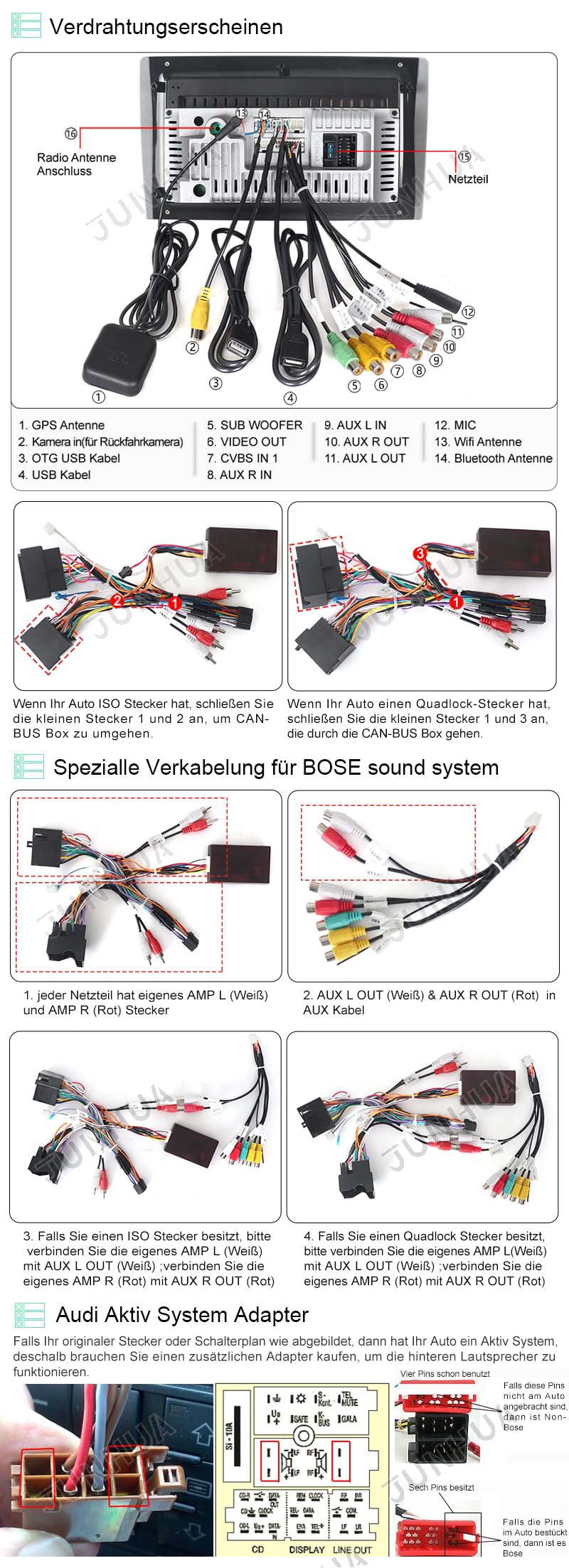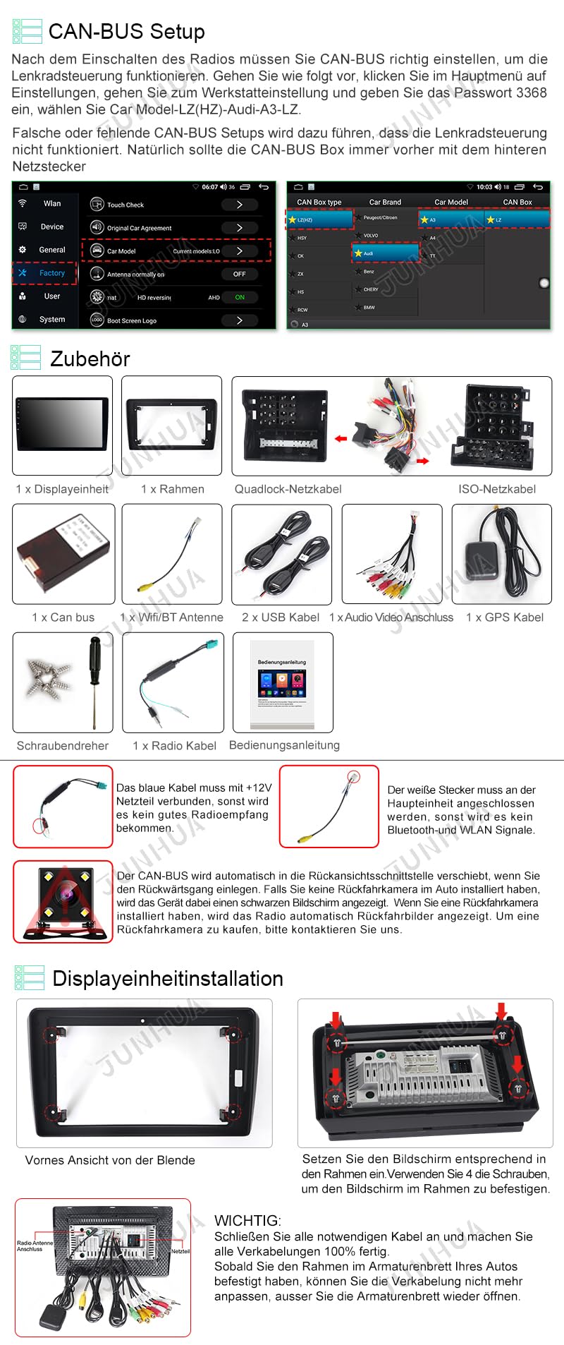 ["Compatibility"] The navigation device is compatible with Audi A3 8P1 2003-2012, Audi S3 II 8P 2006-2012, Audi A3 8V1, 8VK 2012-2019, Audi RS 3 Sportback (2011–2012), Audi A3 Cabriolet 8P7, 8V7 2010-2019, Audi A3 Limousine 8VS, 8VM 2013-2019, Audi A3 Sportback 8PA 2004-2013. ["System"] Operating System: Android 14, Main Processor (CPU): Quad Core Processor, Internal Storage (ROM): 64GB, RAM: 2GB, more storage for app installation. Display resolution is 1280*800 with a cool UI. ["Steering Wheel Control and Can-Bus Settings"] When turning on the radio, you must set CAN-BUS correctly for the steering wheel control to work. Incorrect or missing CAN-BUS setups will result in the steering wheel control not functioning. Normal Car: Settings>Factory>Password 3368>Car Model> XP>Audi>A3>XP. ["Highlight Functions"] Wireless Carplay and Android Auto are the smarter and safer way to use your smartphone in the car, allowing you to focus on the road. Integrated sound DSP processor with equalizer and time correction. ["Accessories"] DAB+, rearview camera, OBD, etc. are optional and must be purchased separately.