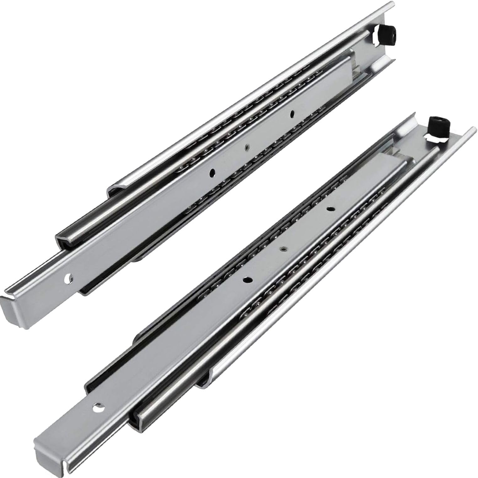 ["Full-extension KV1-80-H53-L900-NF 80 - 100kg by JUNKER","Material: High-gloss galvanized metal / Ball cage with hardened steel balls / Smooth and quiet guidance system / With unlocking function of the guide (for removing the drawer) / Load capacity: 176 - 220lbs (per pair)","Dimensions: Length: 35.4 inches (900 mm) (retracted, extended the length of the rail doubles +/- 0.3 cm) / Height: 2.1 inches / Width: approx. 0.8 inches / Material thickness: 0.08 inches","Applications: Drawers of different sizes / Industrial manufacturing / Furniture production / Vending machine construction / Vehicle construction / Mechanical engineering","Scope of delivery: 1 pair (2 pieces)"]