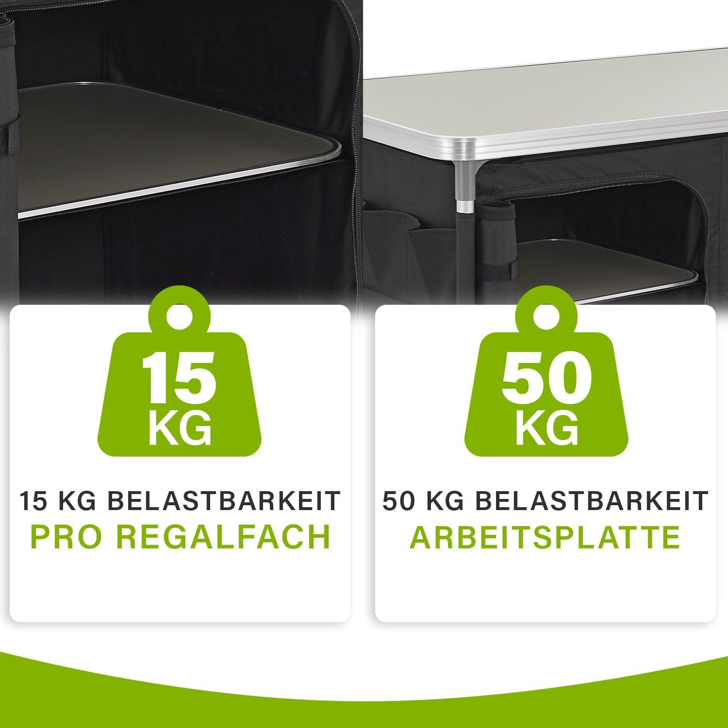 ["✅ Compact & lightweight: foldable camping kitchen with easy plug-in system; quickly and easily assembled and disassembled; particularly compact and handy when folded; with practical carrying bag","✅ Ample storage space: small camping cupboard with plenty of room for kitchen utensils such as pots, dishes, and cutlery; cabinet can be closed with a zipper; large work surface for food preparation","✅ Stable footing: kitchen suitable for outdoor leisure activities; adjustable feet for balancing small unevenness; for camping, hiking, picnicking, or gardening","✅ Durable material: camping cabinet made of high-quality and durable material; high load capacity of 15 kg per shelf and 50 kg work surface; high longevity","✅ Versatile use: universally usable kitchen cabinet; ideal for garden sheds, permanent campers, tents, awnings, or for extensive picnicking"]