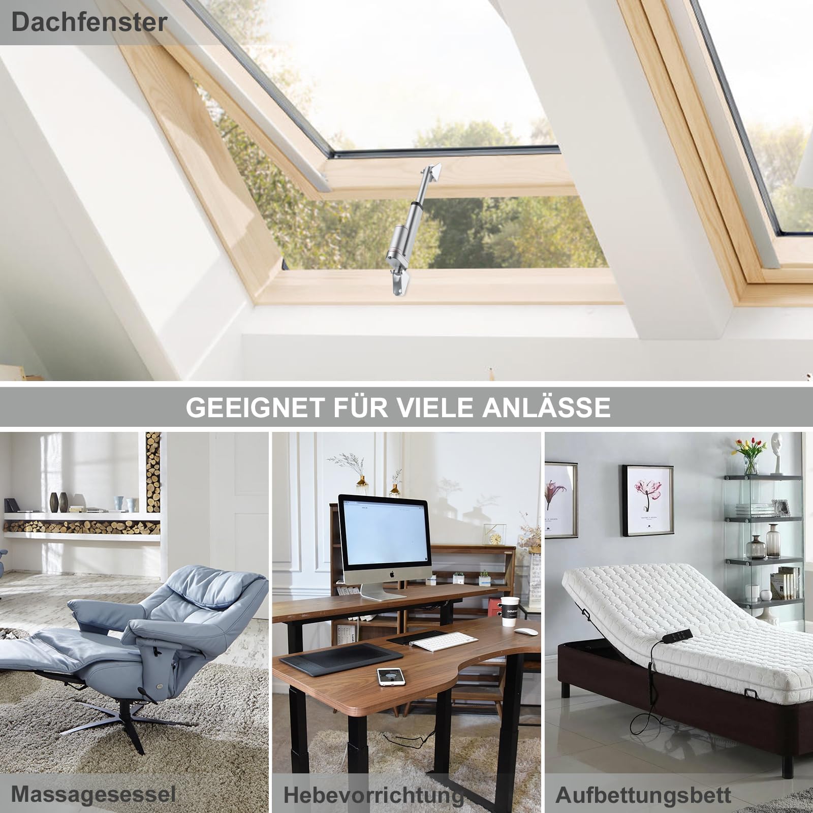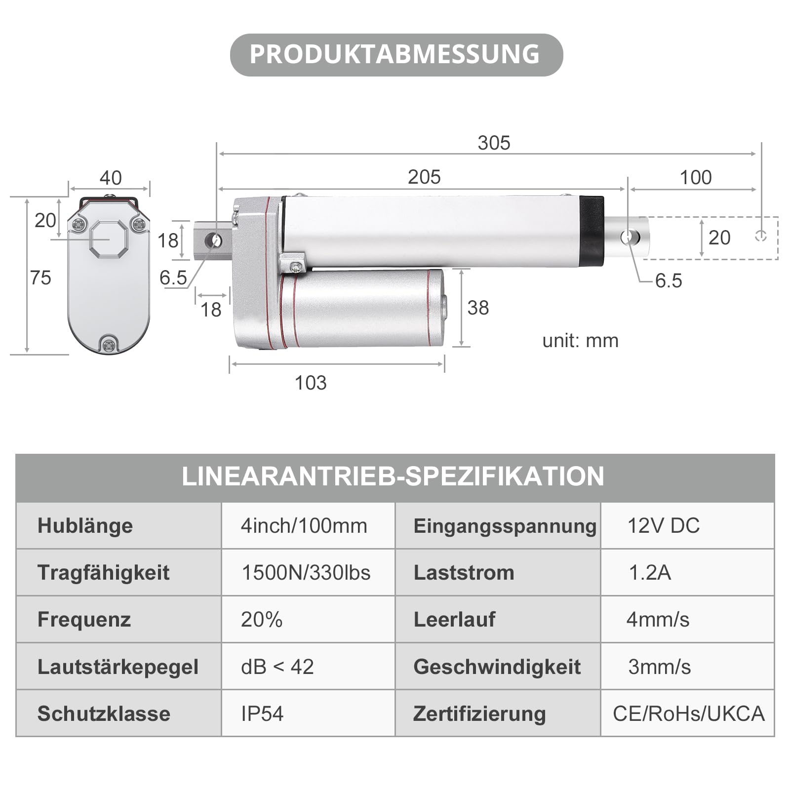 ["Product parameters: Load capacity: 1500N/320LBS; Speed: 4 mm/s; Stroke length: 50 mm/2 inches","Working principle: Sliding rod On each side there is a limit switch. When the telescopic rod runs up or down, the power supply is automatically cut off.","DC motor: The push rod is driven by a DC motor with spindle drive, the telescopic rod can only be retracted without rotation. Interrupt the power supply, it can be stopped at any position with self-locking.","Positive and negative: For example, if the positive electrode is stretched and the negative electrode is contracted, the telescopic direction of the rod can be changed by modifying it.","Suitable for: Low-noise design, noise level of less than 42 dB. Suitable for TV lift tables, massage beds, electric beds, medical chairs, electric devices, micro devices, electric sofas, camera rigs, cameras, and more."]