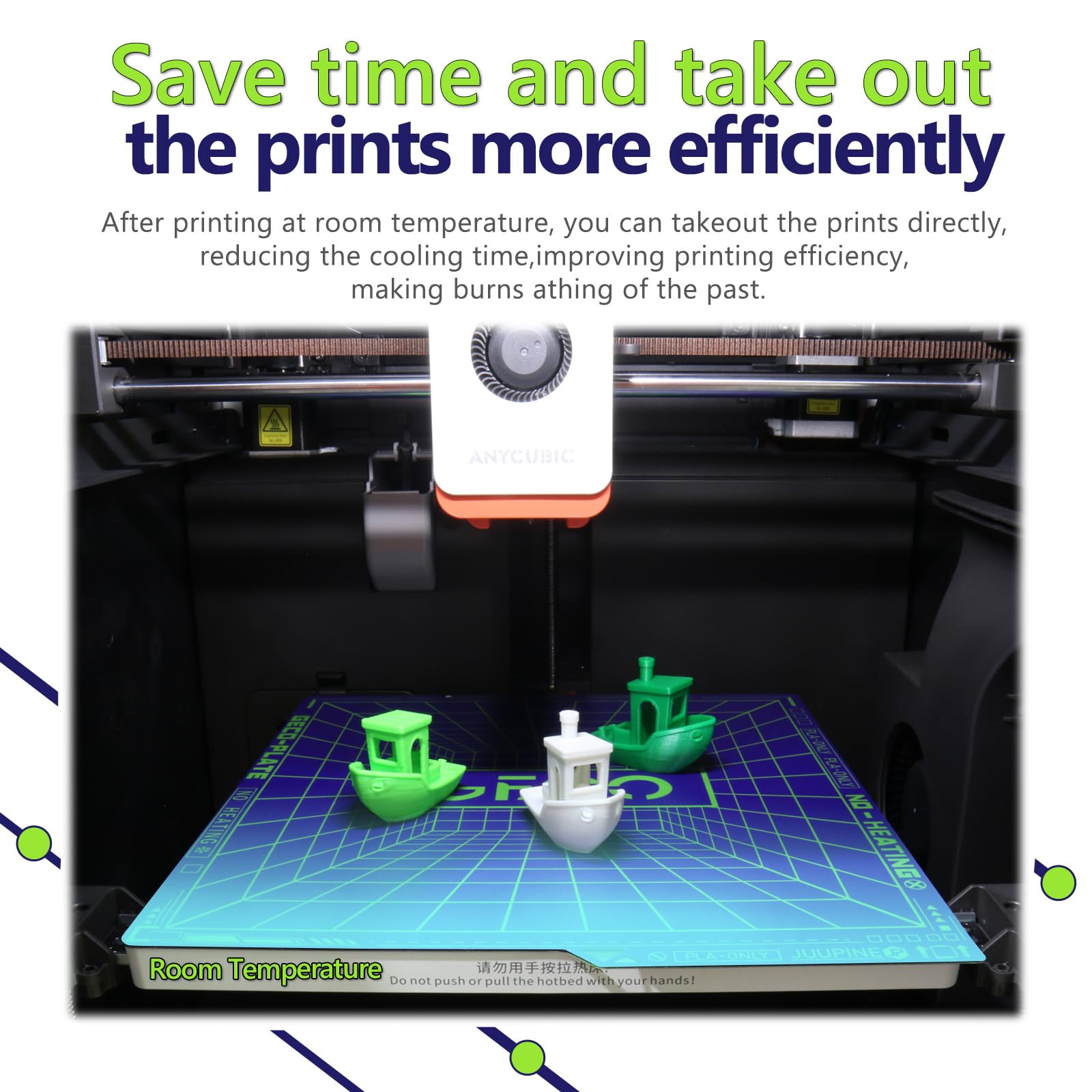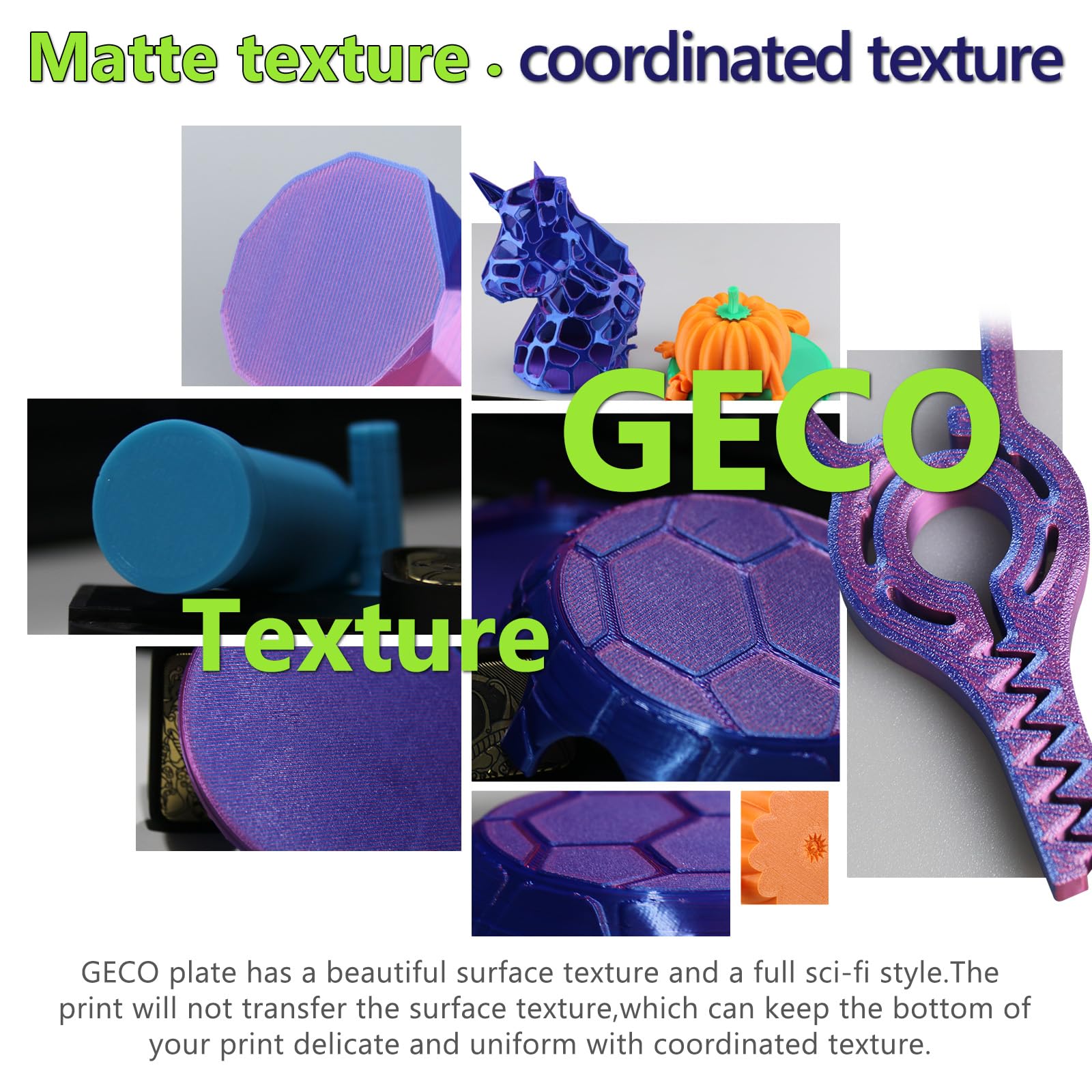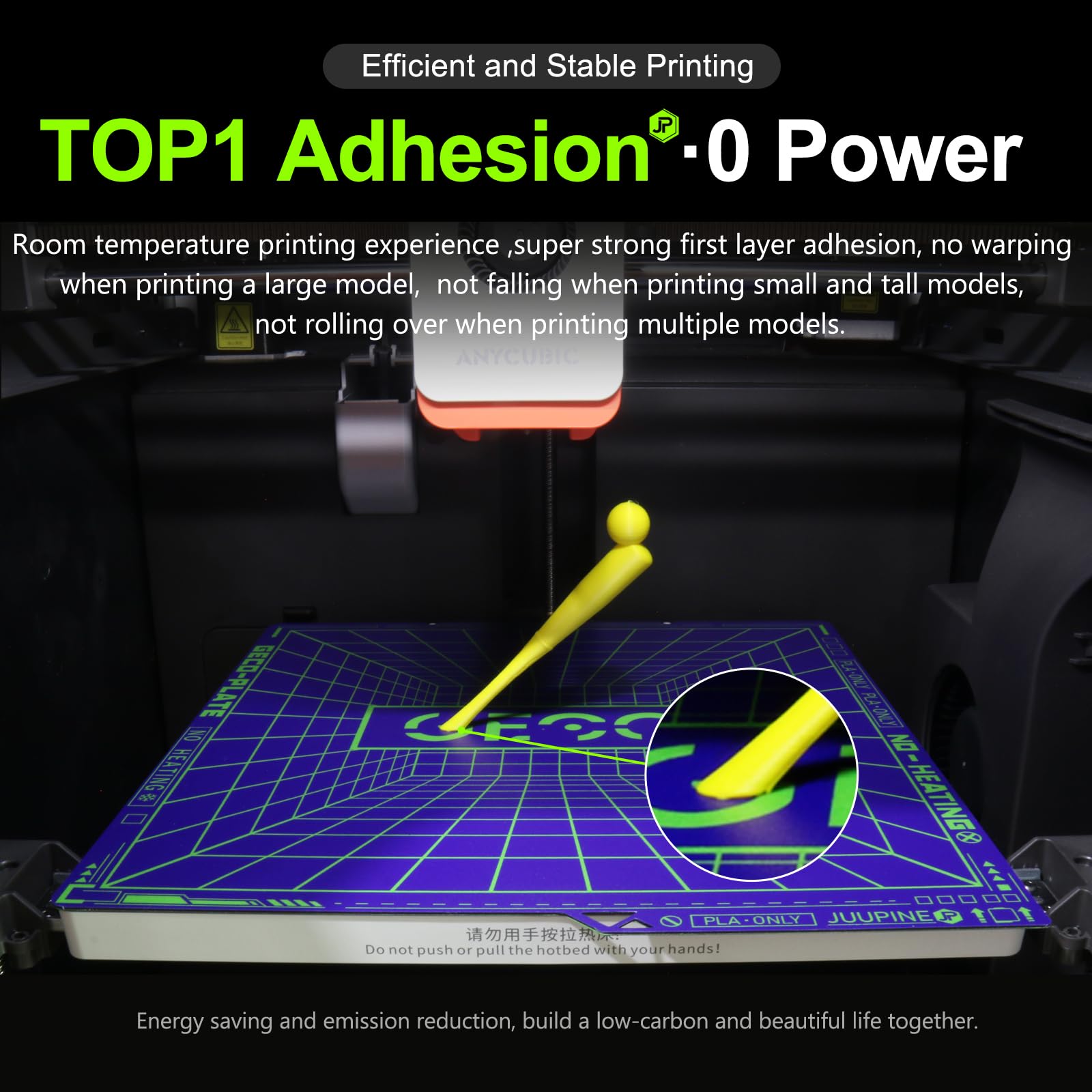 ["Double-sided cold-pressed GECO plate design: Double-sided textured GECO printing plate naming design: In 2025, JUUPINE launched a new cold bed specially designed for PLA printing and named it GECO. As the name suggests, it allows printed parts to cling to the printing plate like a gecko. The surface of GECO is specially made with a frosted texture. When the filament touches it, it makes full use of the subtle force between molecules-van der Waals force, to build countless stable microscopic connections, so that the printed parts are firmly formed and tightly \"adsorbed\" on it like a gecko.","Built-in QR code: The print bed (264x276mm) is adapted to the Kobra S1 printing platform. It comes with a QR code that can be automatically recognized by Anycubic Kobra S1 3D printer and automatically level the printing platform.","Thicker and heavier: Our Geco is thicker and heavier than ordinary PEI hot beds. Thick and magnetic, it prevents large prints from warping and small and tall prints from tipping over. Flexible, detachable, double-sided design. Durable and easy to use, place the print plate on the hot bed of the Anycubic Kobra S1/Kobra S1 Combo FDM 3D printer, and the print bed will automatically level after turning on the machine. The spring steel plate is bendable, and the model can be quickly removed without the help of other tools, and the plate can be flat again.","Excellent adhesion of the first layer of printing: The model can be firmly attached to the GECO surface, and even beginners can print easily. With excellent adhesion, you can complete the printing at room temperature or 5 degrees Celsius below room temperature, and still play an excellent stickiness without heating the platform. 0 power printing. Large pieces do not warp, and small pieces do not fall over. You only need less power to complete the printing task, say goodbye to glue and handwriting, and save the cumbersome printing process.","Daily maintenance and use are simpler:Before printing, the build plate can be cleaned with alcohol and soapy water, and after dusting and degreasing handprints, it can be used directly.","Exclusive for PLA use:The GECO surface is not resistant to high temperatures, and heating is prohibited during the printing process. Only PLA exclusive filament can be printed."]