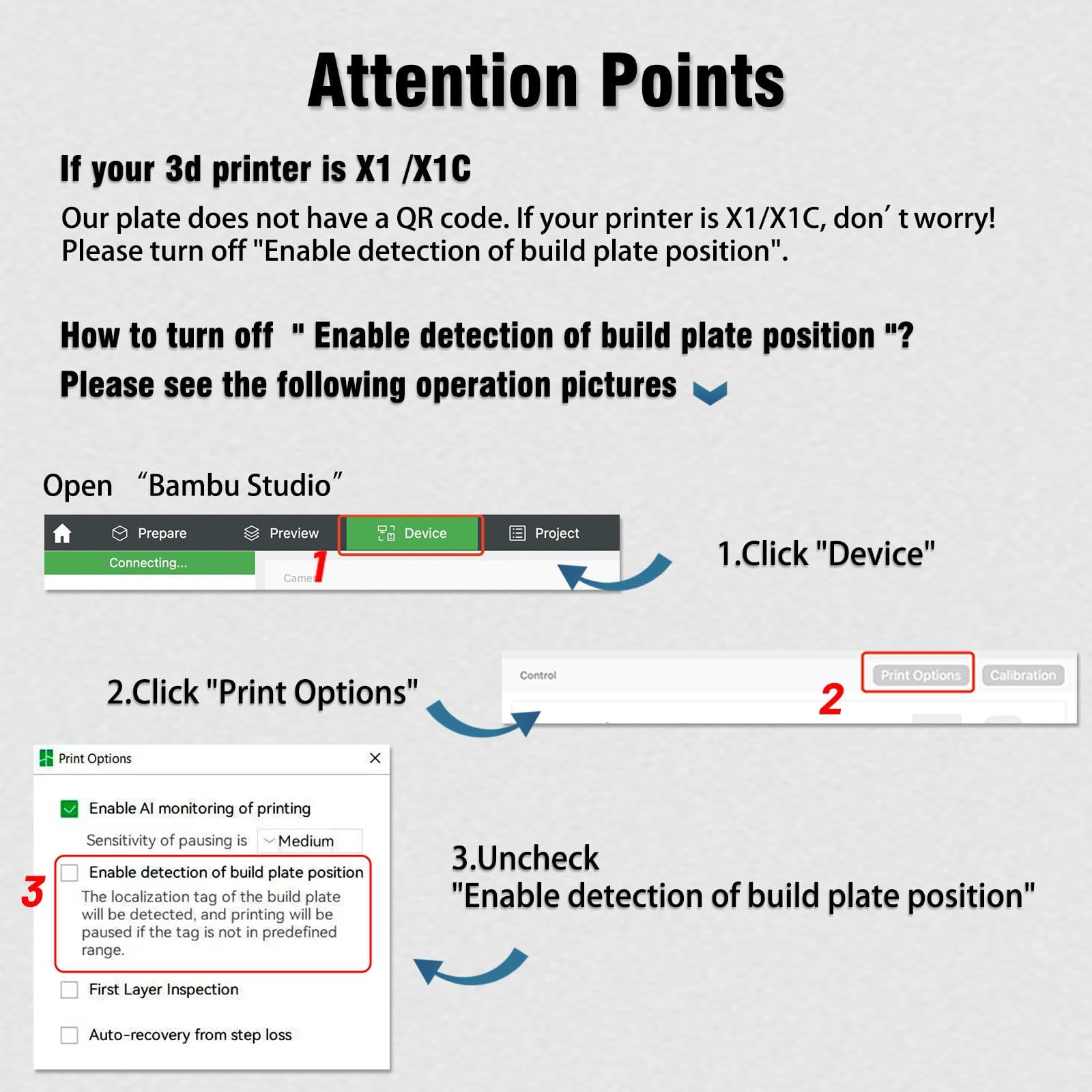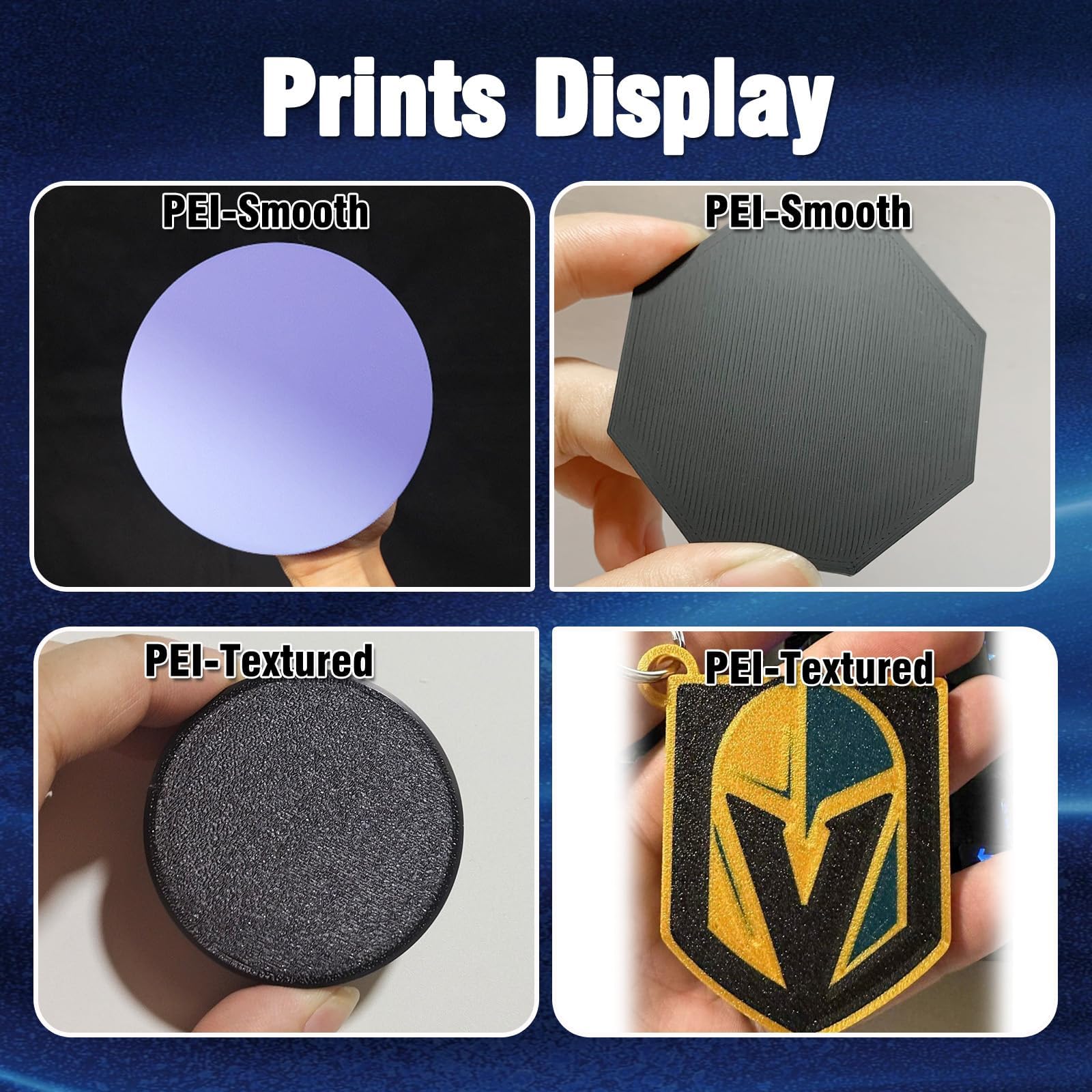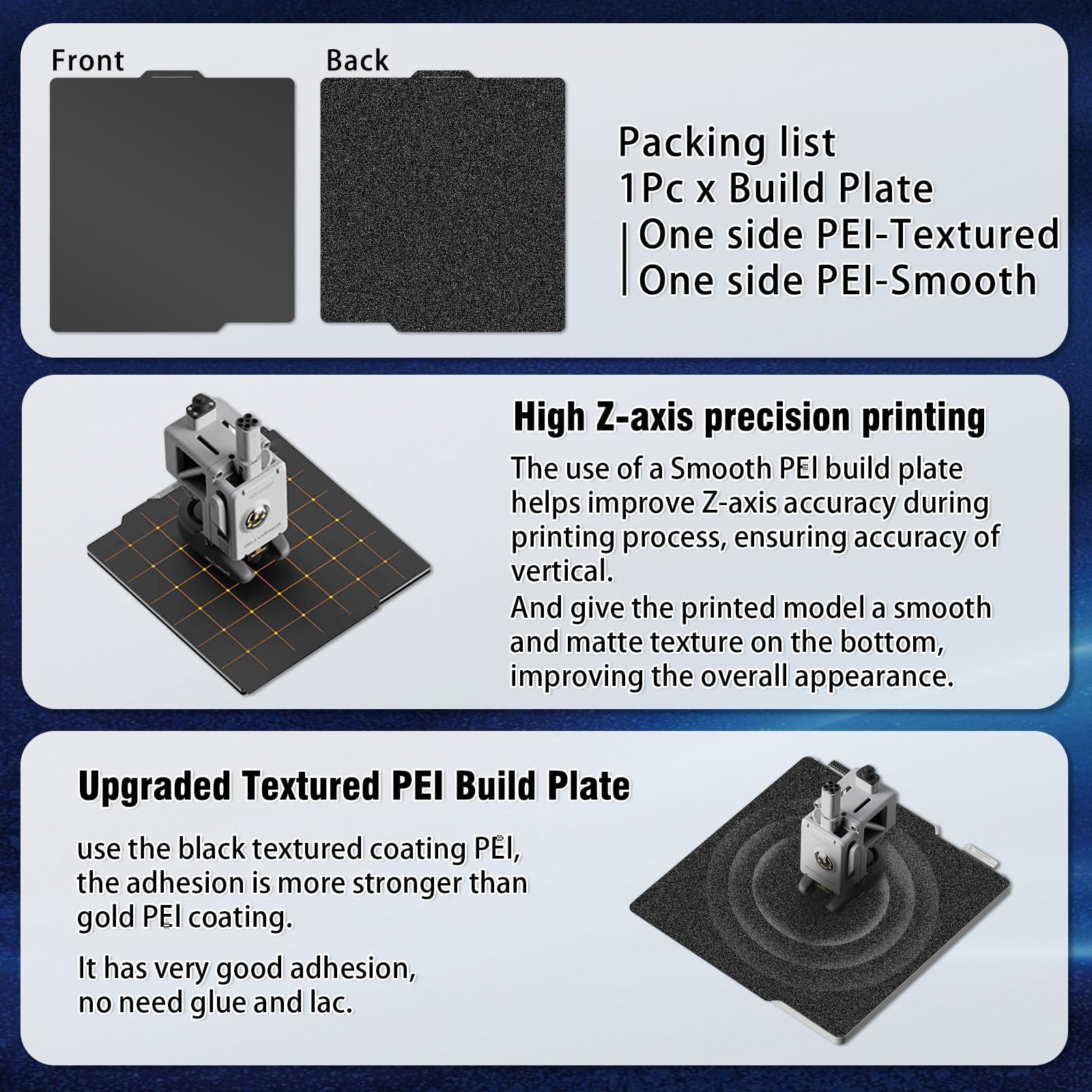 ["Improved PEI print bed】JUUPINE uses specially selected matte PEI plates to give the bottom of the printed object a smooth and matte texture, improving its overall appearance. After testing, the adhesion of black PEI is better than that of golden PEI. The model can be securely attached to the surface of the print bed. Even beginners can easily print without tape or adhesive.","【Reliable magnetic adsorption to prevent deformations】JUUPINE PEI Plate uses high-quality spring steel plates to improve magnetic adsorption. This helps prevent deformations and ensure the best print quality in 3D printing. It helps when printing larger models with materials prone to deformation, such as ABS, PC, and Nylon.","【High-precision printing on the Z-axis】The use of smooth PEI plates helps improve the accuracy of the Z-axis during printing and ensure higher accuracy and consistency in vertical dimensions. This advantage makes smooth PEI plates an excellent choice for printing parts that require high dimensional accuracy, where precise alignment and tight tolerances are critical.","【Compatible with various filaments】PEI not only supports printing with common materials like PLA, TPU, PETG, but also printing with materials that require high temperatures, such as ABS and Nylon. The maximum temperature of the textured PEI side is 300°C and the maximum temperature of the smooth PEI plate is 200°C.","【Easy to use and disassemble】It is easy to use, simply place this print plate on the Bambu printer's heated bed platform, select the plate type, cut it and select "bed leveling." In addition, the spring steel plate can be bent to quickly remove the model without the help of other tools. Then the plate becomes flat again.","【Easy to clean】For smooth surfaces, if you leave fingerprints on the plate, you can spray alcohol and wipe it with a dry cloth","【Note】If your printer is X1/X1C/X1E, please disable "enable build plate position detection" in the slicing software. This way, the radar does not scan and identify the "plate type"."]
