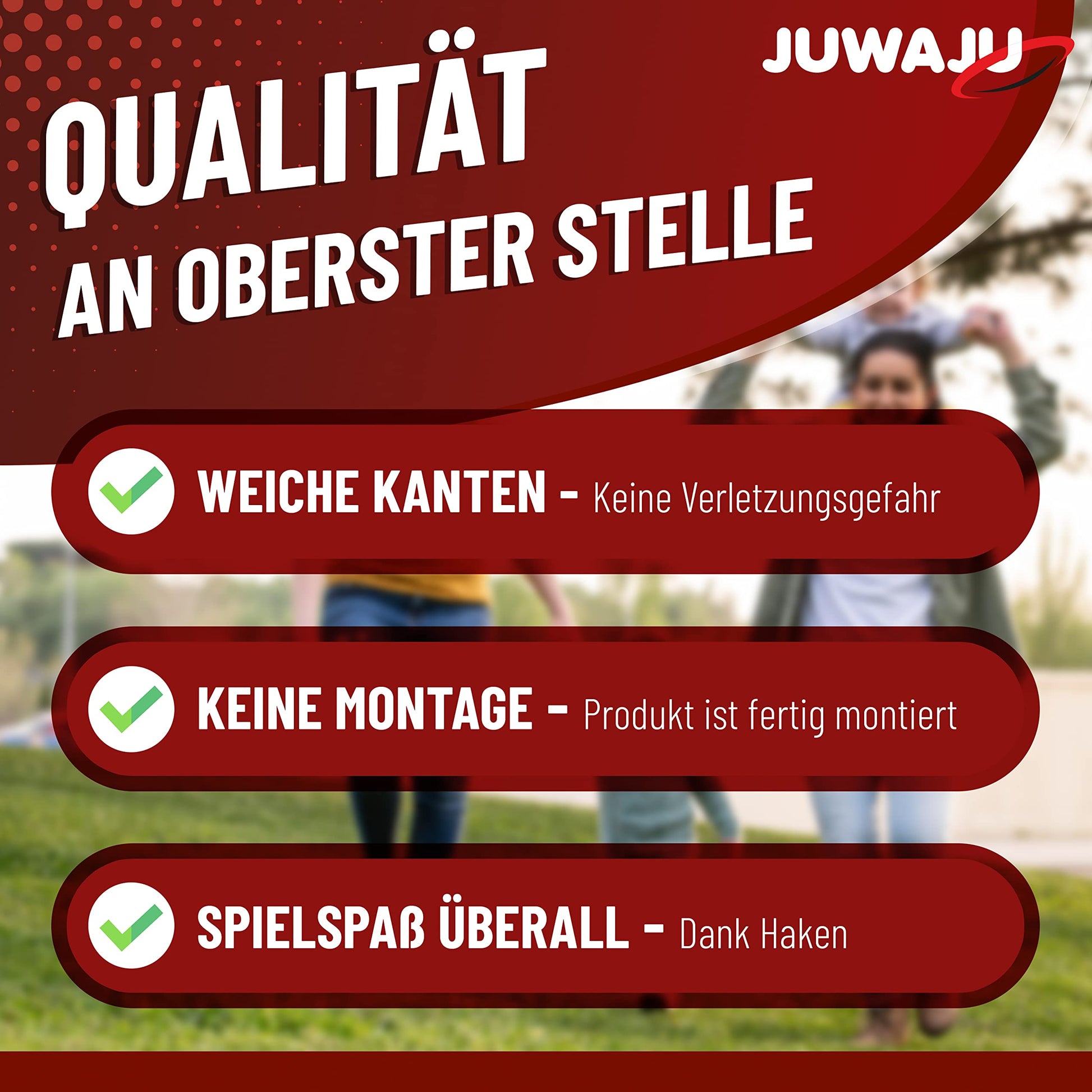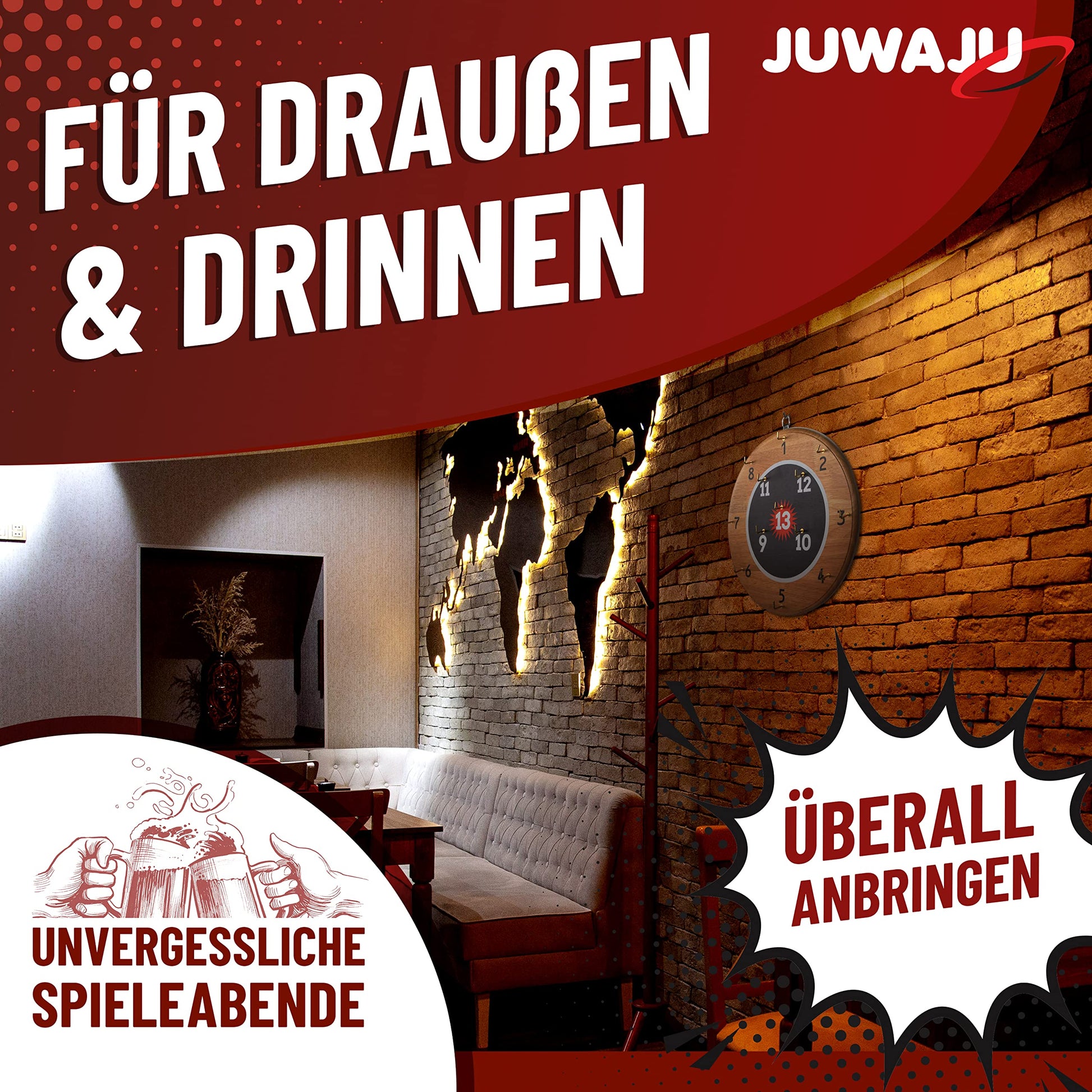 ["PERFECT DAY - Ring Toss Game made of wood - Indoor and outdoor movement game! Fun and entertainment for children and adults, ideal for children's birthdays and garden parties. "Great game set for children aged 3 and above."","Wow, the ring toss game from JUWAJU is fun for young and old, it consists of round wood with embedded metal hooks, is 30cm in size and weighs only 0.95kg, also includes 6 black, 6 red plastic rings.","READY TO USE - as the game is delivered fully assembled, you don't have to screw or glue the hooks in, as the hooks are already glued in, so you won't lose any hooks. Just unpack, hang up, indoors or outdoors, and the fun can begin.","YOU CAN HAVE THE BEST TIME - if you want to play darts with family or friends but can't because of bad weather outside, with the ring toss game you can play in your HOME without worrying about anything getting damaged, or you can let the kids play alone without worrying about them getting hurt. ISN'T THAT COOL.","FUN & FAMILY - enthuse family and friends with an unforgettable game night, the beauty of the game is that by adding up points, children unconsciously learn arithmetic and dexterity."]