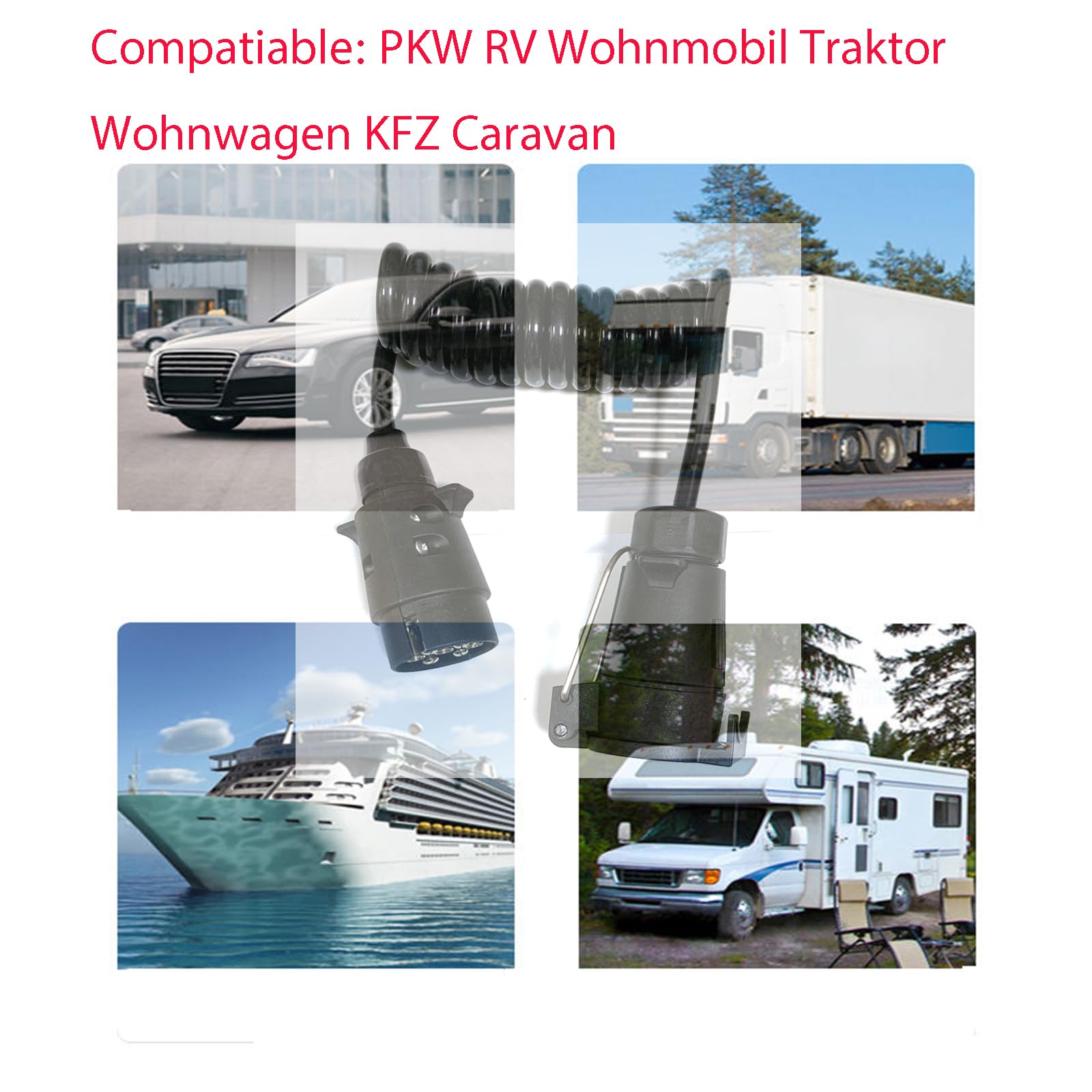 ["7-way spiral cable with 7-pin plug to 7-pin socket, suitable for connecting trailer and power supply, suitable for displaying trailer signal light","The 7-pin trailer cable is used to transfer electronic and 12V power from the vehicle to the trailer or caravan. Compatible with most European cars, trailers, motorhomes, bike carriers, trucks, tractors, and vans","Made of flexible TPU material, the 7-pin extension cable is characterized by high elasticity and good flexibility. The cable length can be extended up to 6.6ft max. recommended working length 4.9ft and automatically retracts","The durable 7-pin trailer extension cable is made of durable, waterproof, and corrosion-resistant material. Using pure copper wires enables stable and low-loss signal transmission."]