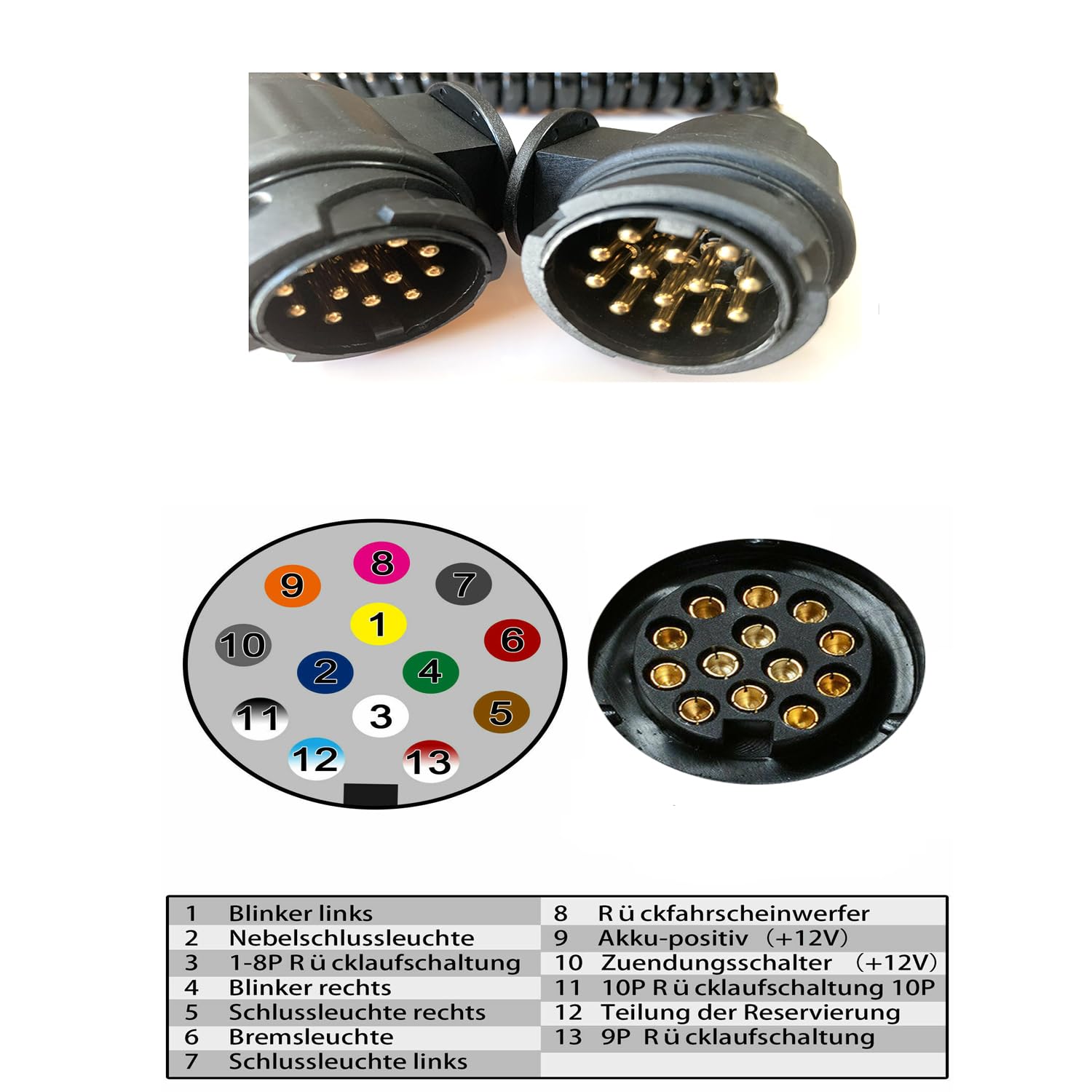 ["Versatile use ✔ Ideal for trailers, caravans, RVs & motorhomes ✔ Fits cars, trucks, tractors & commercial vehicles ✔ Robust automotive cable for reliable connections","2 plugs (male / male) 13-pin to 13-pin – full compatibility with standard trailer sockets Spiral design – stretches up to 10 feet, ideal for tight maneuvers & uneven terrain Weatherproof & durable – impact-resistant housing & corrosion-resistant contacts","13-pin plug to plug trailer cable is used to transmit the electronic light signal from the motorhome or caravan to the car/vehicle with 12V power. For both vehicles with 13-pin trailer socket. Suitable for most European cars, trailers, caravans, motorhomes, bike carriers, trucks, tractors, vans.","🚛 Perfect for leisure & commercial use! Whether camping, transportation or agriculture – this 13-pin trailer cable ensures a safe & reliable connection."]