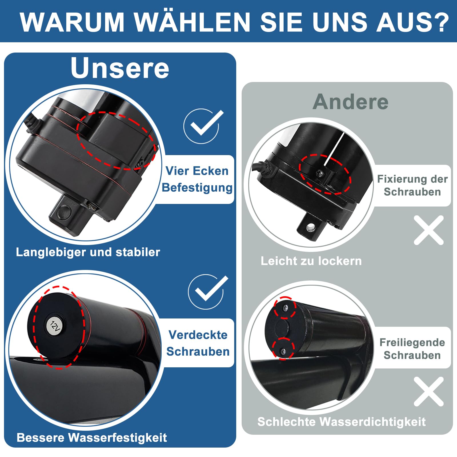 "Quiet and stable: The linear actuator adopts plastic gears, quieter and more durable, not easy to oxidize, noise below 50dB. High-quality aluminum alloy and four corner fixing base design make the linear actuator more stable and sturdy.",