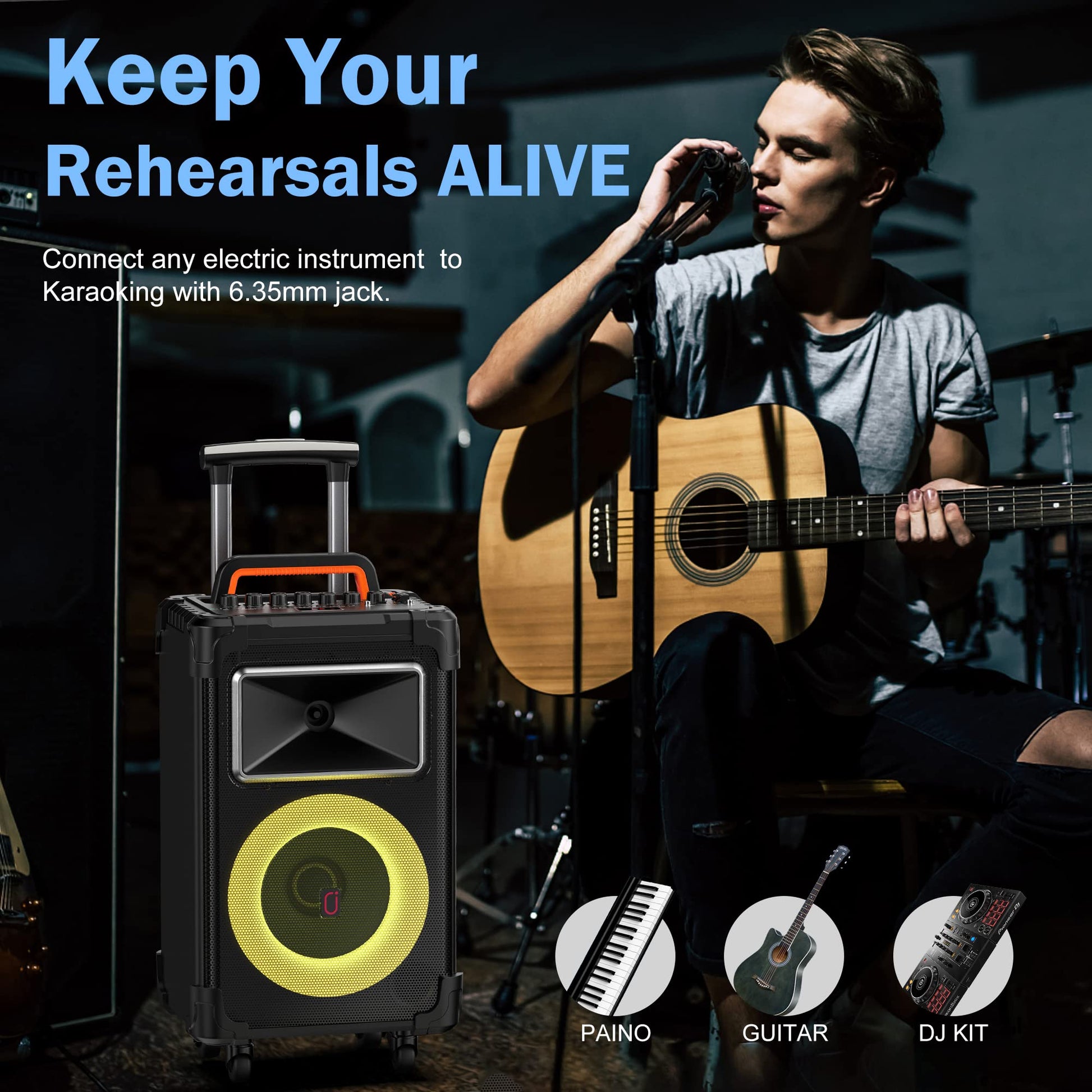 ["Portable and fun Partybox】JYX Karaoke system is designed for entertainment, its carrying handle and bottom gimbals design allow you to easily carry it to different places, you can enjoy your favorite music anytime, anywhere.","【Powerful Bass & Enhanced Bluetooth 5.0 Technology】Our speakers use DSP digital electronic frequency division, high resolution, the highs are not sharp, the sound is balanced and loud, with a powerful subwoofer and Bluetooth 5.0 technology can easily transmit a rich stereo effect.","【2 wireless Anti-Whistle Microphones】Equipped with 2 self-coupling and whistle-proof wireless microphones (wireless range: 30 m) the sound is enough to cover a football field, and the speaker is equipped with MIC jacks that can be connected to wired or wireless microphones, and 5 microphones can be used simultaneously. The microphone uses a UHF chip, audio transmission is more stable and free from interference.","【Rhythm-controlled shocking Disco Light Show】The Partybox features a very impressive disco lighting. The lights change in sync with the music, and you can switch to a variety of light effects to create a cool and dynamic atmosphere for any party or gathering, with 8 adjustable light modes. You can listen to music while enjoying the light show, and have an unforgettable karaoke experience.","【Easy Operation and Long Lifetime】This karaoke speaker is versatile, easy to use, and comes with everything you need. The playback time is up to 8 hours. You don't have to worry about running out of power during a party, as this device will keep the music playing all night long!","【TWS Stereo Surround Sound System】Connect up to 2 AN20 speakers, and enjoy 360° surround sound with downward-facing full-range speakers and a unique cavity structure that allows the music to fill the entire room of your house, even if you are not in the same room, for a magical 360° sound and immersive experience.","【The Perfect Gift Choice】Speakers are great gifts for people of all ages, whether they love music, like to party, or just want to enjoy music at home. If you are looking for a gift, the JYX speakers are a good choice."]