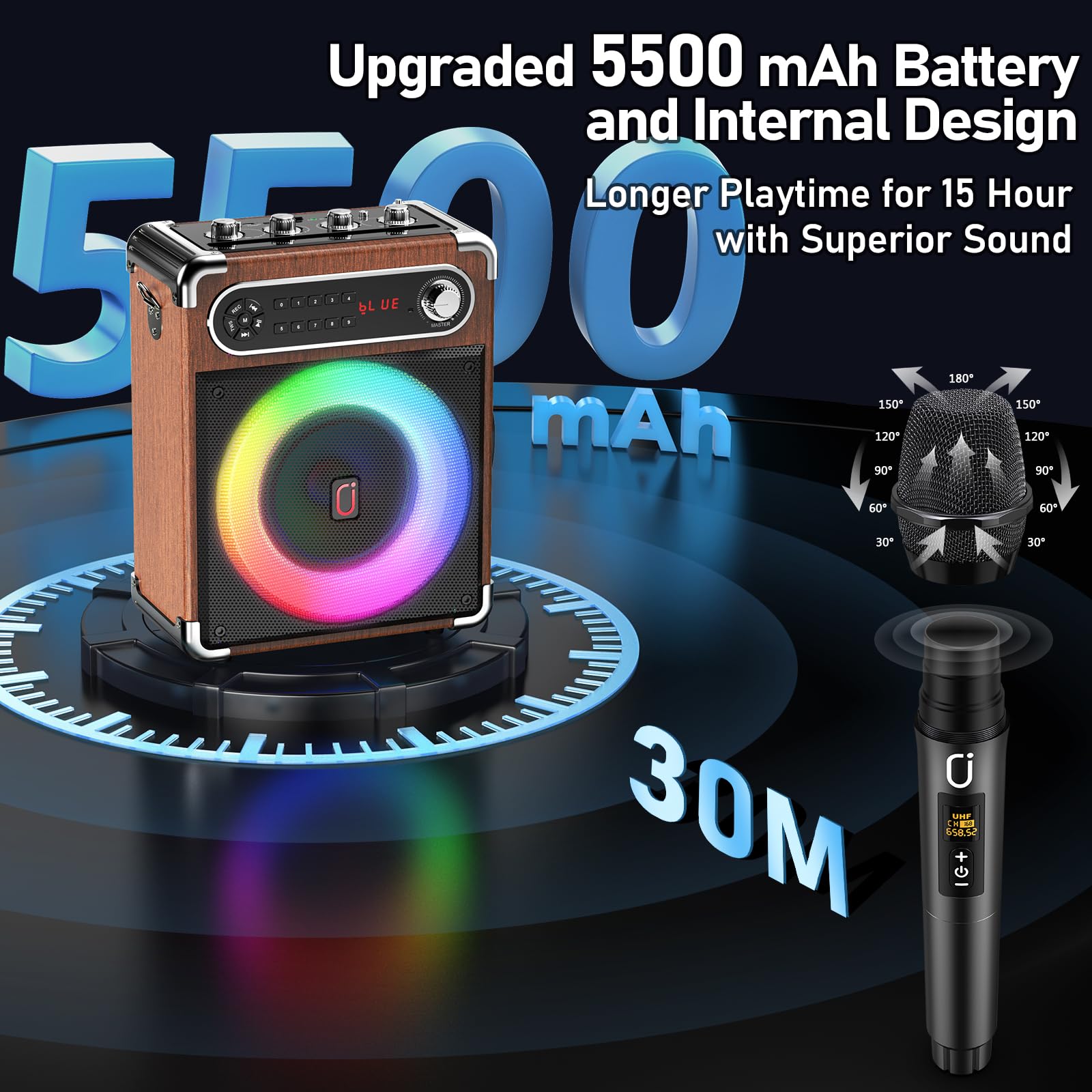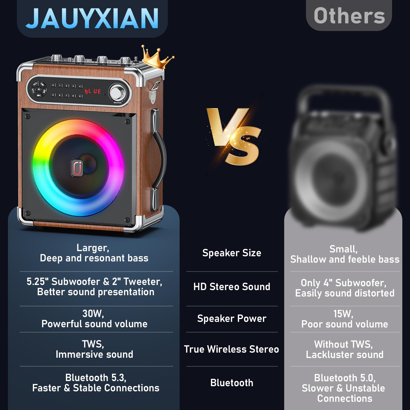 ["【Powerful immersive sound and deep bass】5.25” woofer + 2” tweeter, traditional speakers often require complex and huge speakers to achieve wonderful bass effects. However, our speakers use the advantages of digital electronic DSP crossovers to break through traditional technology and simply transmit rich stereo effects. The bass is rich and powerful without distortion. High resolution and balanced sound.","【TWS stereo surround, stunning LIVE listening experience】JYX karaoke system dual stereo pairing playback, living room into theater, wireless stereo surround experience in all directions, creating a sense of presence during LIVE listening experience. Let the picture overflow with sound, full of emotions.","【Splash-proof IPX4 speaker with RGB lights】DJ lights transform any room into a rock concert, a nightclub, and a karaoke room. Create a dynamic stage lighting effect with your music. Splash-proof IPX4 design, whether you are meeting friends on the terrace or drinking by the pool, do not worry about your stereo getting wet.","【2 wireless UHF microphones+infrared sensor remote control】two rechargeable wireless UHF anti-whistle and noiseless microphones (Enjoy a karaoke party with multiple people without buying additional microphones). Freedom from wired. The infrared sensor remote control makes it easy for you to operate, you can control all functions of the karaoke machine through the remote control.","【Rechargeable speaker with spinner wheels and pull handle】Built-in large capacity battery, full charge can be used for 6-8 hours, if you want to use it longer, you can keep the power supply constant (supports charging during music playback). Enjoy good music non-stop. JYX karaoke machine for the needs"]