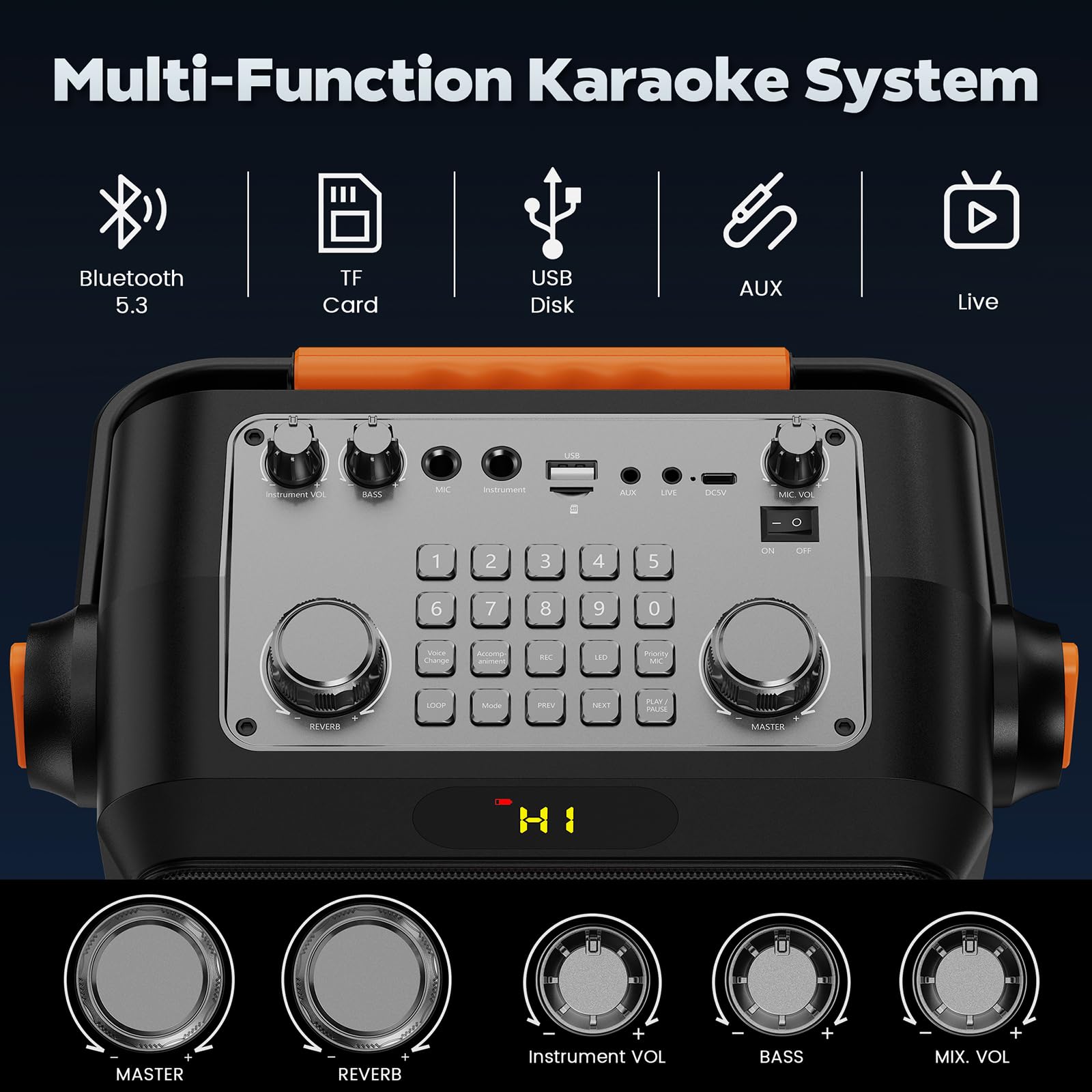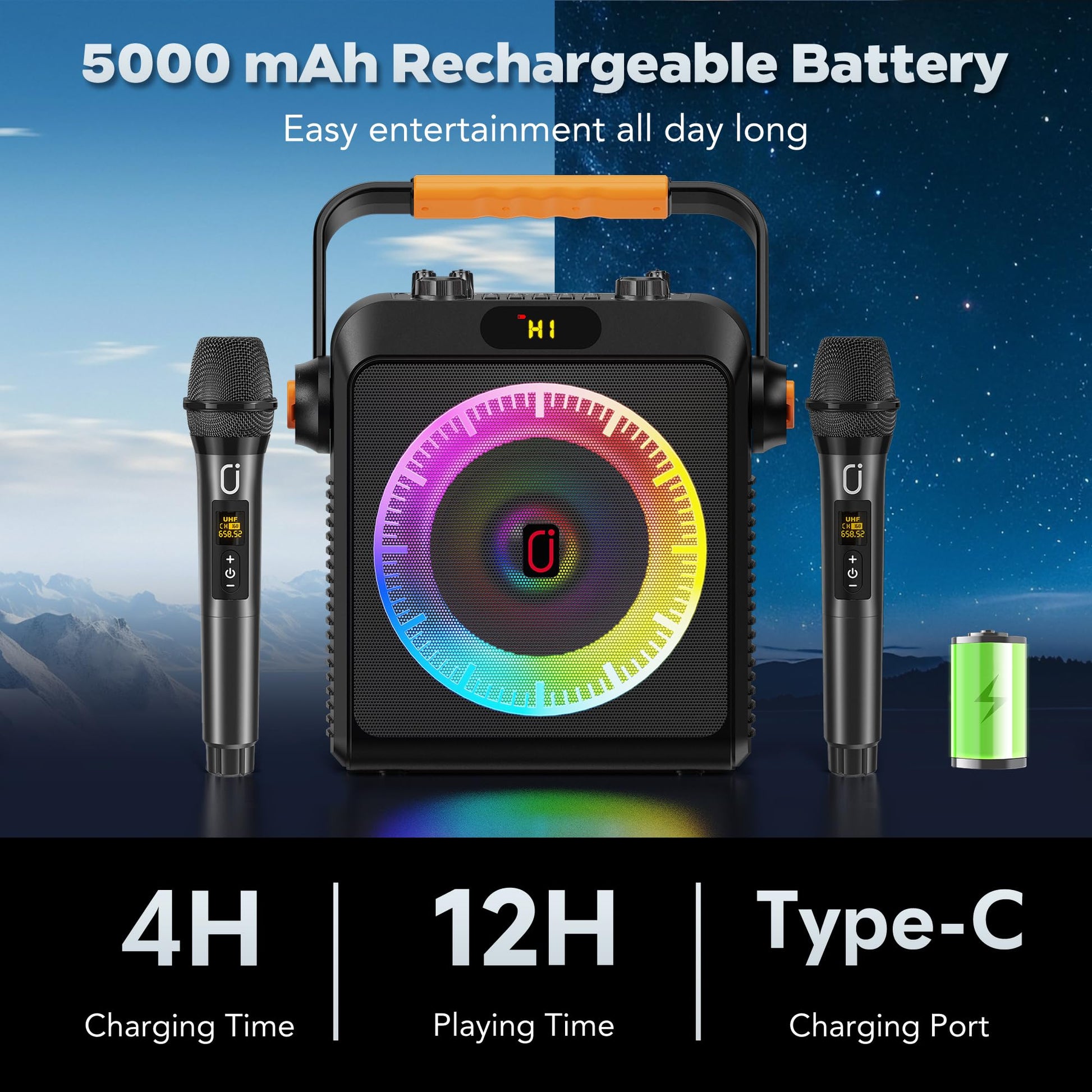 ["Portable Karaoke Speaker: Designed for parties, our karaoke device with 2 microphones is the ideal choice for endless fun. With a convenient portable handle and shoulder strap, as well as an impressive playtime of over 12 hours (and yes, you can use it while charging!), your party vibes will last all night long.","Powerful Bass and Bluetooth 5.0: Enjoy the atmosphere of a rock concert with our high-quality bass karaoke speaker, delivering powerful and crystal-clear sound. The incredible clarity and depth will surprise you. And with high-end Bluetooth 5.0 technology, you'll get stable and clear sound transmission that takes your audio experience to the next level.","Two Wireless Microphones without Noise: Sing with our two wireless karaoke microphones with feedback. Enjoy wireless freedom without noise from up to 30 meters away and keep your voices clear and authentic. Our professional anti-feedback technology ensures that your performance sounds as good as the pros.","Support for Wireless TWS Stereo System: Double the fun by connecting two karaoke speakers to get real stereo sound, providing an immersive audio experience. It's like a live concert, but better because you're in control.","DJ Ambient Lighting: Transform your space into a club with our colorful built-in LED strips that move in rhythm with the music. With various light effects to choose from, you can enjoy both a music and light show in your living room. No manual required here. The intuitive control panel of our karaoke speaker makes it extremely easy to use. In addition, you can play music your way with USB/TF card and AUX modes (and a recording function in USB and TF card modes)."]