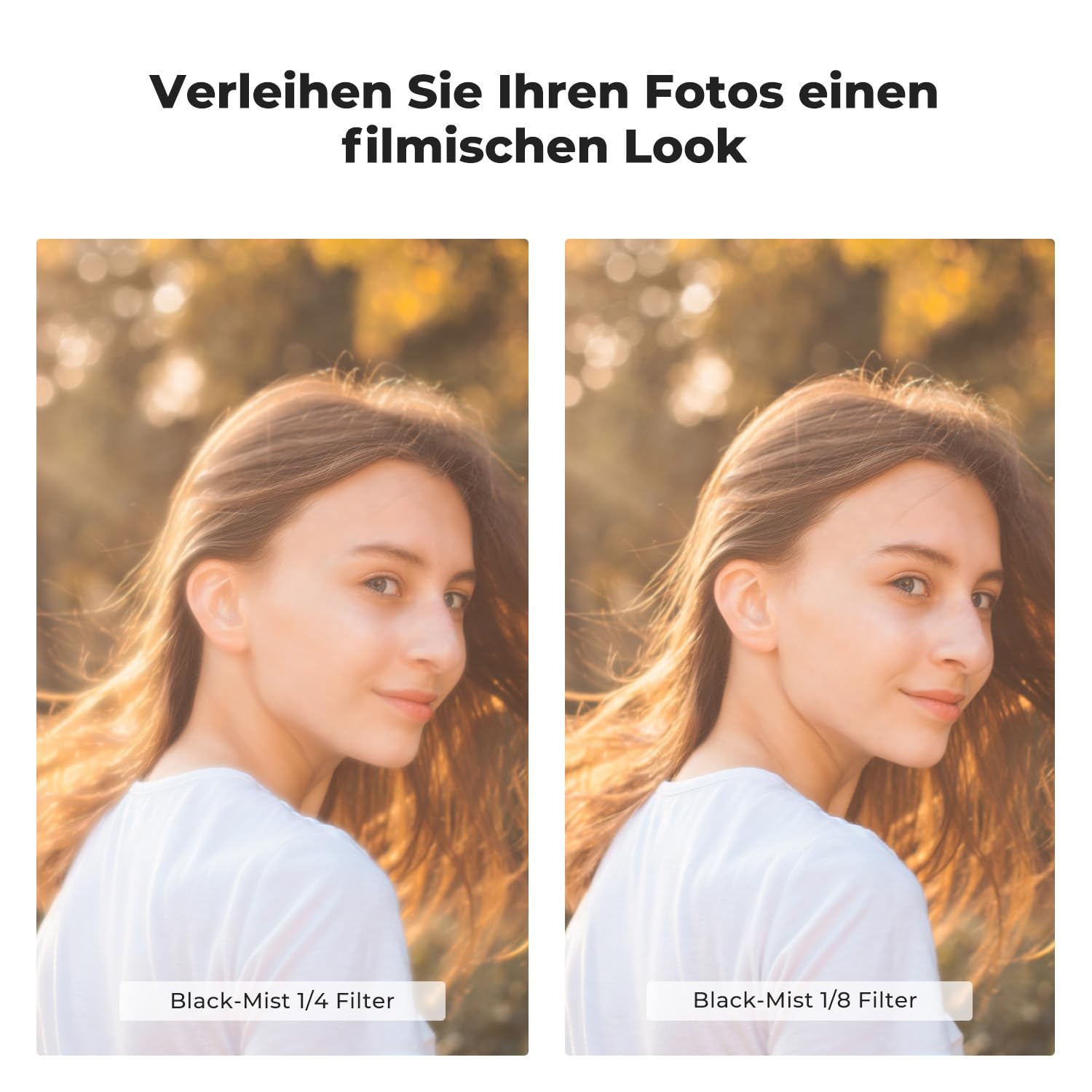 ["Filmlook】The Black-Mist Filter can soften the wrinkles, spots, pores, etc. of the human skin and better achieve the delicate, gentle, and beautiful film effect. The light transmittance of the Black-Mist 1/4 Filter is 84%, Black-Mist 1/8 Filter is 87%. (Note: New and old packaging will be randomly shipped.)"
