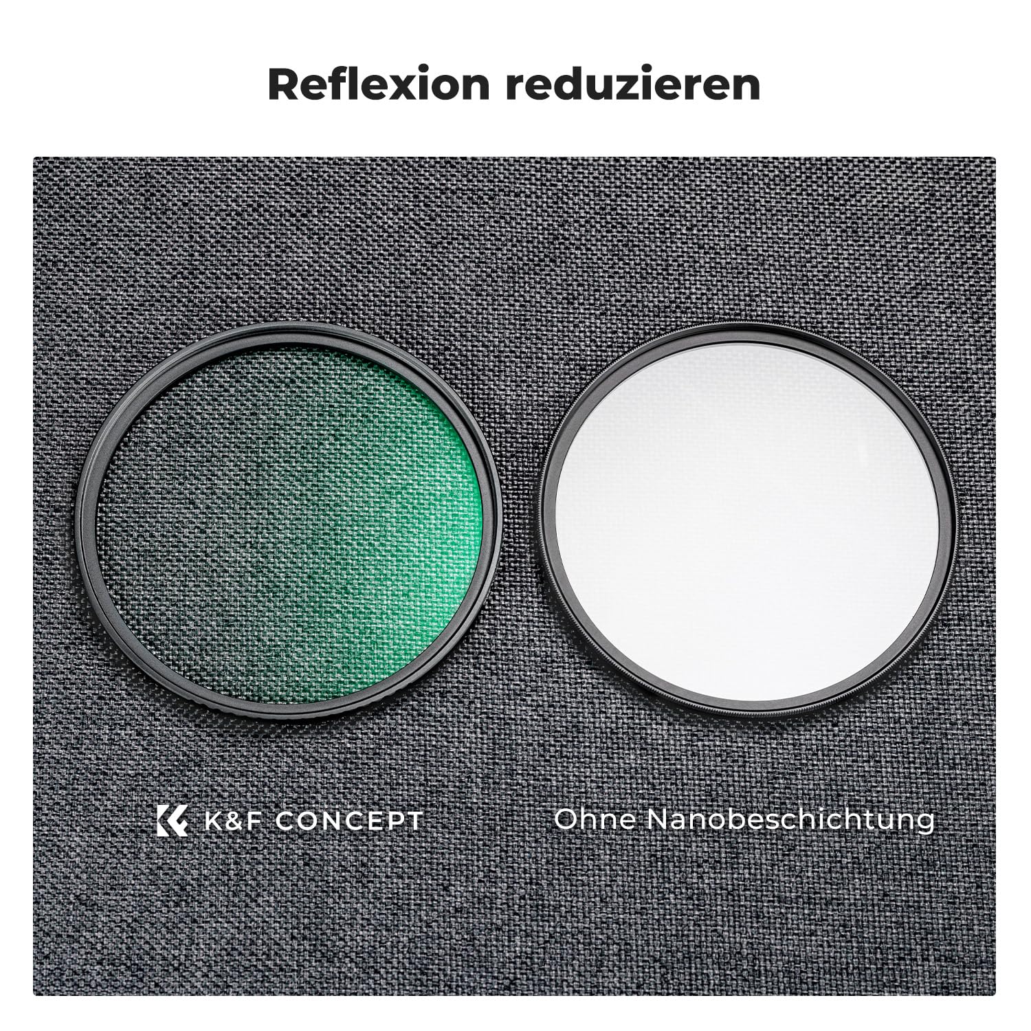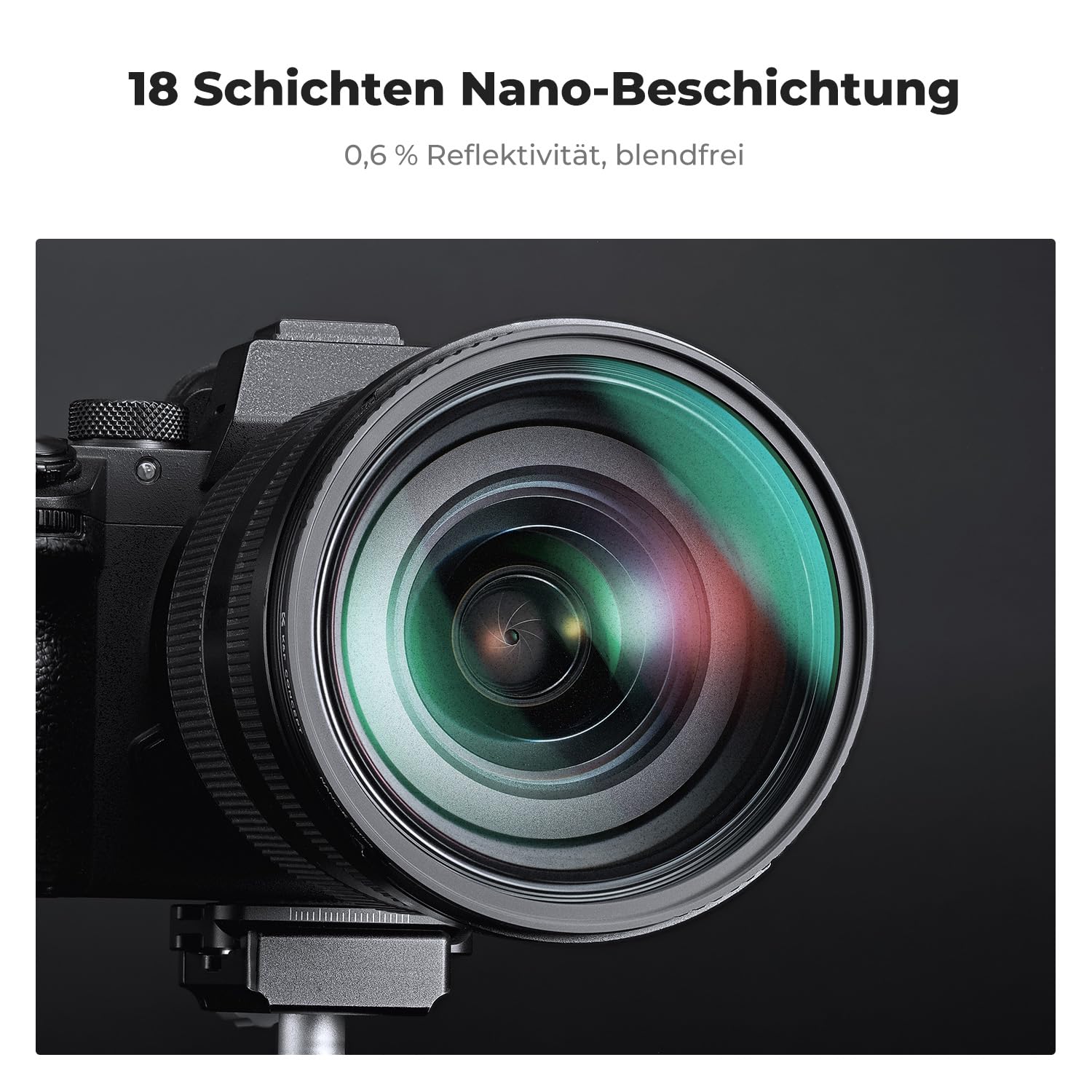"Multi-Nanocoating】The surface of the K&F Concept Filters is coated with 18 layers, which not only effectively reduces reflections on the filter surface and avoids problems such as glare, but also is anti-mold and waterproof."