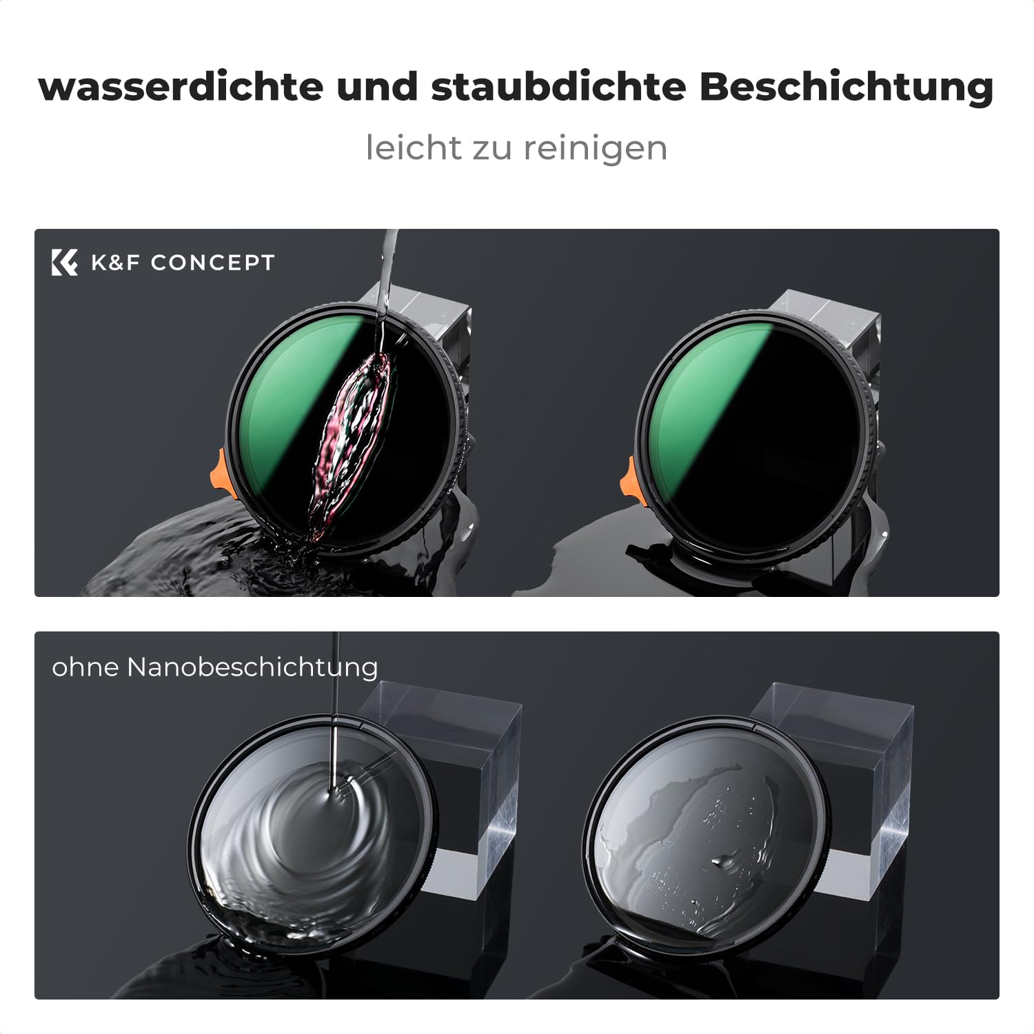 ["1-9 BLENDENSTUFEN - Nano-X Variable ND2-400 Filter is designed for long exposure and motion blur techniques in changing light conditions. Reduces light intake from 1 to 9 stops without affecting color balance. Great for landscape photos and video recording. Note: New and old packaging will be randomly shipped","NANO-COATING - The high-quality optical glass from Japan with 28-layer nano-coating ensures neutral color balance, reduces lens reflections, eliminates ghosting, and provides better protection against scratches and dirt.","CONVENIENT LEVER - This ND2-400 also features an adjustable lever, making operation much easier compared to most Vario ND filters that do not have this handle.","VERSATILE - Suitable for digital/analog photo, system, and video cameras. Ideal for portrait photography in extreme brightness with large aperture, long exposure shots, reducing light with darkened lens","FILTER POCKET - Made of high-quality and durable PU leather, waterproof, wear-resistant, mold and corrosion resistant, also biodegradable and environmentally friendly. It offers perfect protection for the ND2-400 filter.","* K&F CONCEPT is the world's No.1 brand in terms of lens filter online sales volume among camera-accessory-focused brands. Source: Euromonitor, 2024 data."]