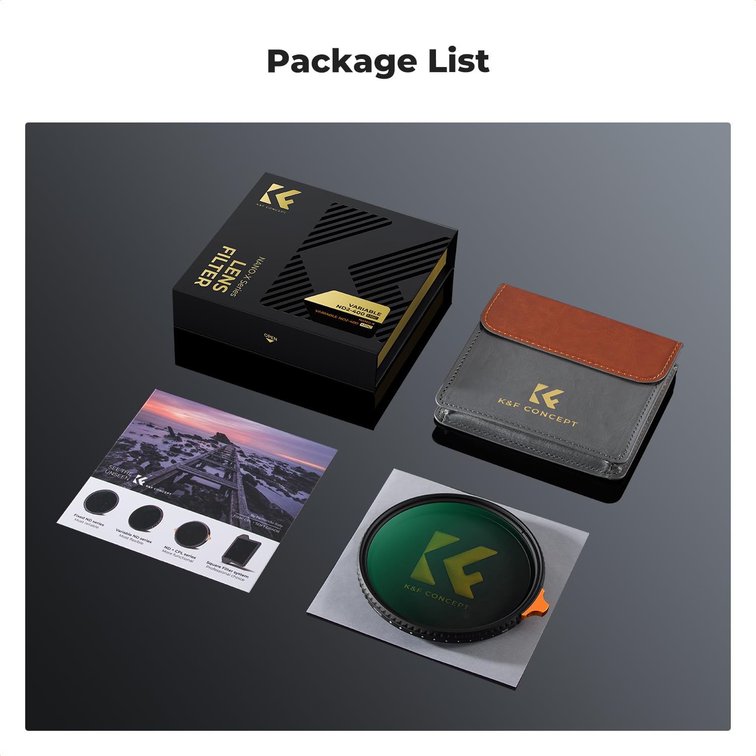 ["1-9 BLENDENSTUFEN - Nano-X Variable ND2-400 Filter is designed for long exposure and motion blur techniques in changing light conditions. Reduces light intake by 1 to 9 stops without affecting color balance. Great for landscape photos and video recordings. (Old and new packaging will be sent randomly). Note: New and old packaging will be sent randomly.","NANO COATING - The high-quality optical glass from Japan with 28-layer nano coating ensures neutral color balance, reduces lens reflections, eliminates ghosting, and provides better protection against scratches and dirt.","CONVENIENT LEVER - This ND2-400 also has an adjustable lever, making operation much easier compared to most Vario ND filters that do not have this handle.","VERSATILE - For digital/analog photo, system, and video cameras. Suitable for portrait shots in extreme brightness through wide aperture, for long exposure shots, reducing light amount through darkened lens","FILTER POCKET - Made of high-quality and durable PU leather, waterproof, wear-resistant, mold and corrosion-resistant, also biodegradable and environmentally friendly. It provides perfect protection for the ND2-400 filter.","* K&F CONCEPT is the world's No.1 brand in terms of lens filter online sales volume among camera-accessory-focused brands. (K&F CONCEPT is the world's best-selling photo accessory brand for lens filters on the entire internet) Source: Euromonitor, 2024 data."]