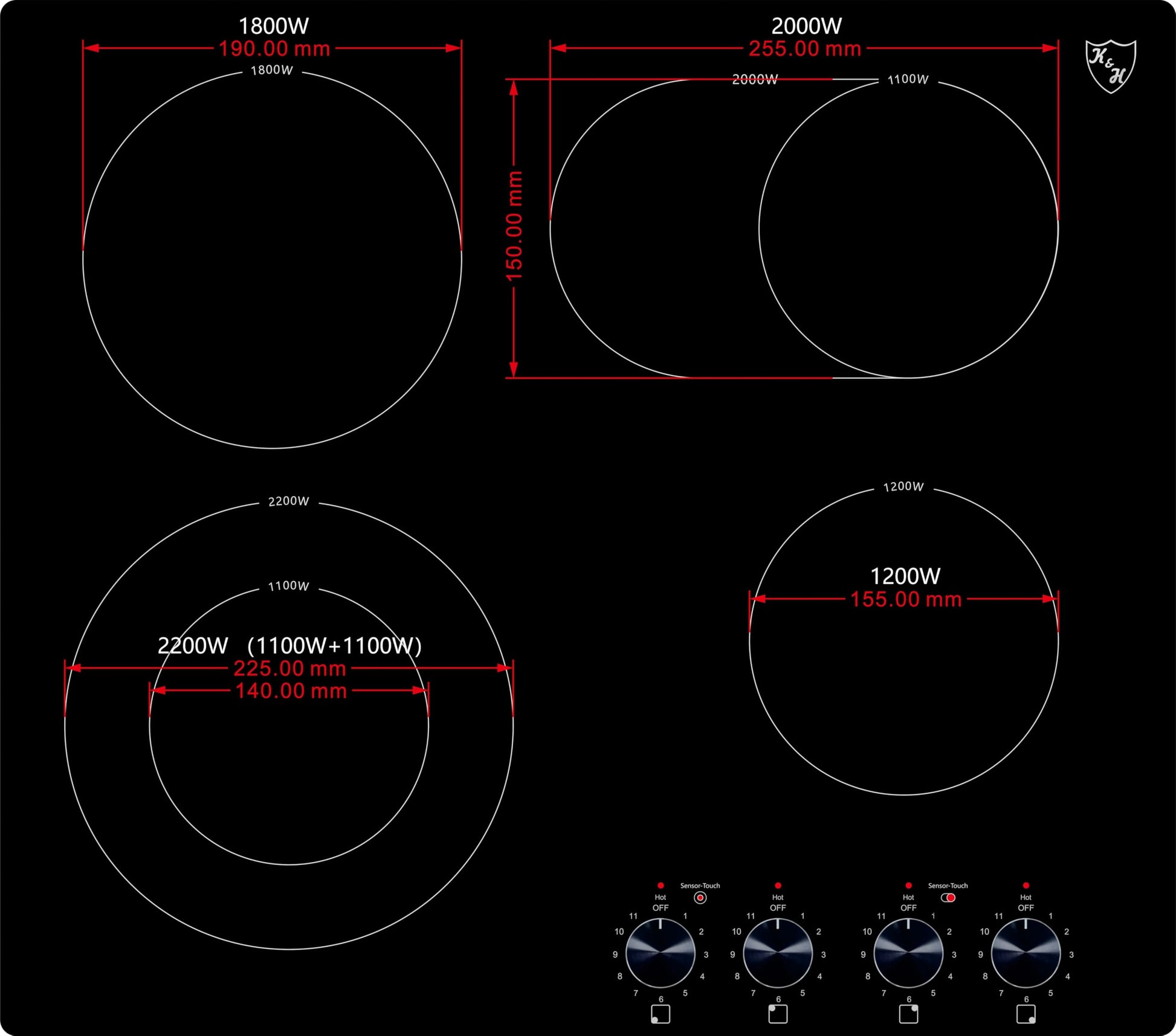 K&H Glass ceramic hob CK-7206K [4 ZONES] - 4 cooking zones with knob control - 4 zone hob Autark - 4 cooking zones - powerful connection - 59CM - 7200 Watt - 11 power levels