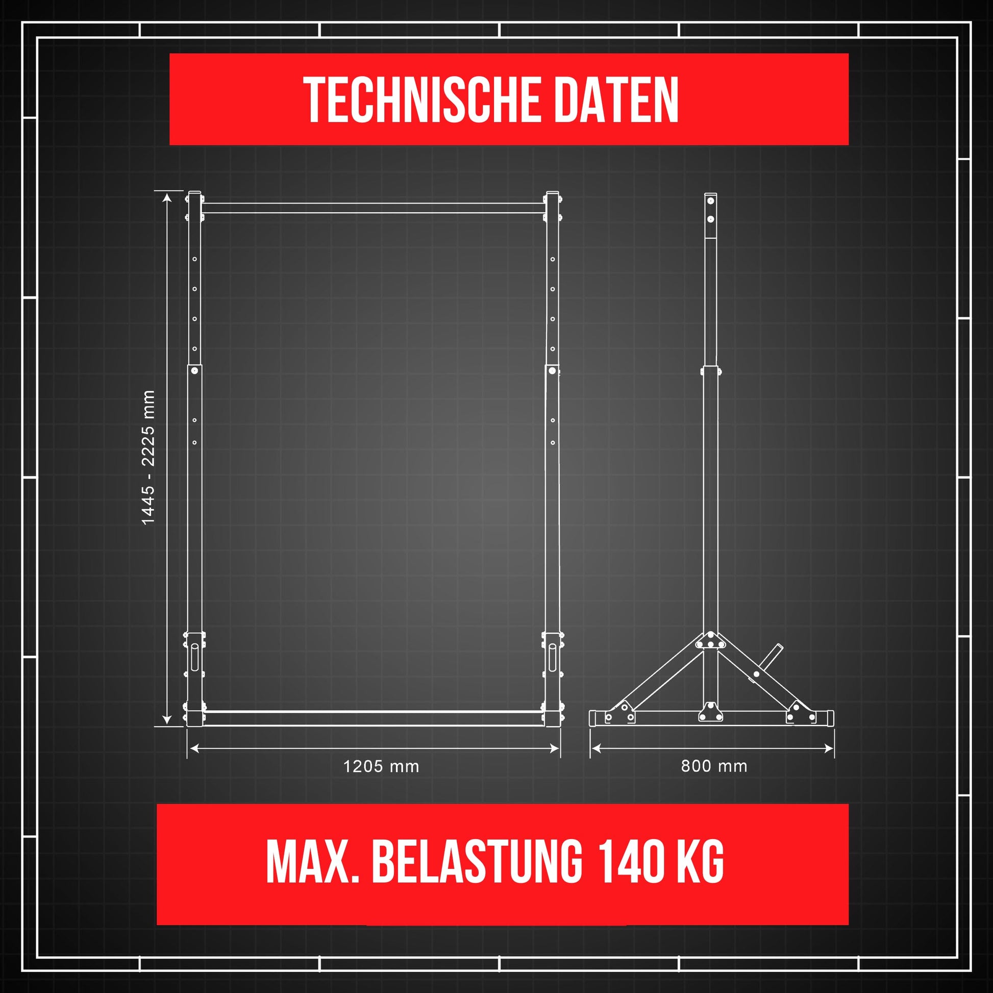 SPECIFICATIONS: Weight of fitness bar: 23kg. Load capacity: 140kg. Material: Steel, powder-coated. Dimensions: 57 to 87 x 47 x 31.5 inches. Profile 1.57 x 1.57 x 0.067 inches and 1.38 x 1.38 x 0.067 inches. Bar tube 47 inches wide.