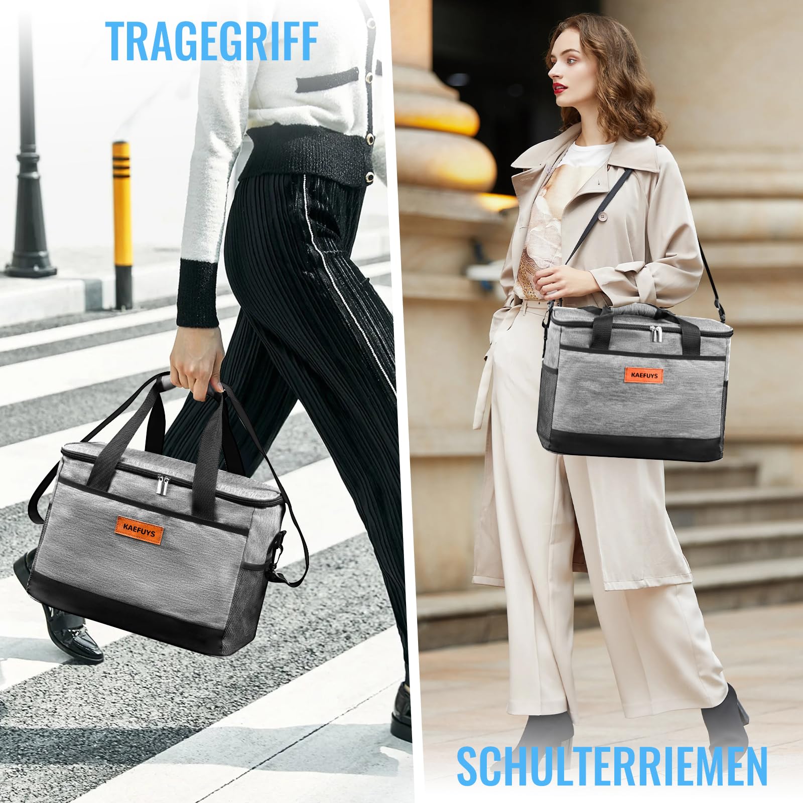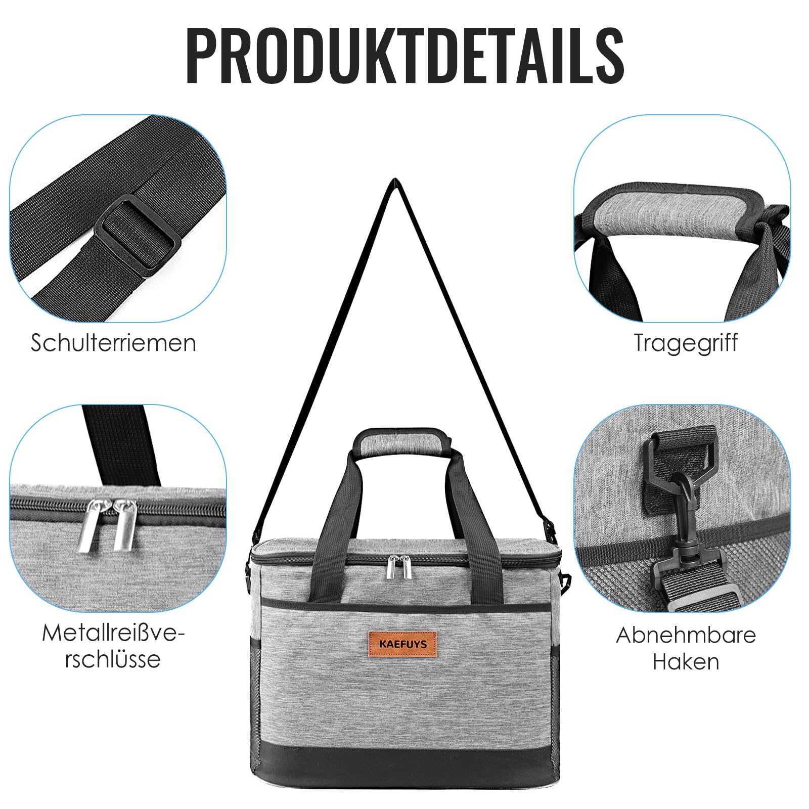 ["14h Cooling: The lunch bag consists of an 8mm thick EPE insulation layer and an inner PEVA layer, keeping food cold for up to 14 hours and hot for up to 10 hours, making it ideal for keeping drinks and food cold on hot summer days.","30L Picnic Bag: The cooler bag measures 45 x 29 x 25 cm and has a capacity of up to 30 liters. It can hold over 40 beverage cans, perfect for taking food with you or for weekend shopping. In addition, the large front pocket provides space for items such as magazines, cell phones, or keys. 2 side mesh pockets for drinking glasses or cutlery.","Waterproof and leakproof: The outer shell is made of 600D Oxford fabric, which is tear and abrasion resistant, ensuring a long service life of the thermal bag. The PEVA inner membrane ensures that the insulation bag is 100% waterproof. Even if something spills, the dirt can be wiped off with a damp cloth.","Portable: The cooler bag has a foldable shoulder strap that is detachable and adjustable. The handles are padded, so your hands won't get pinched even when lifting heavy items. The lunch bag is also foldable. When folded, its volume is only 1/3 of its original size, making it easy to store in any corner of a car trunk.","Multifunctional: The cooler bag is suitable for many everyday applications. It can be used as a portable cooler for camping trips or for transporting lunch to the office. With its large capacity of 30 liters, it is also suitable for weekend shopping at the supermarket or for grilling in the park."]