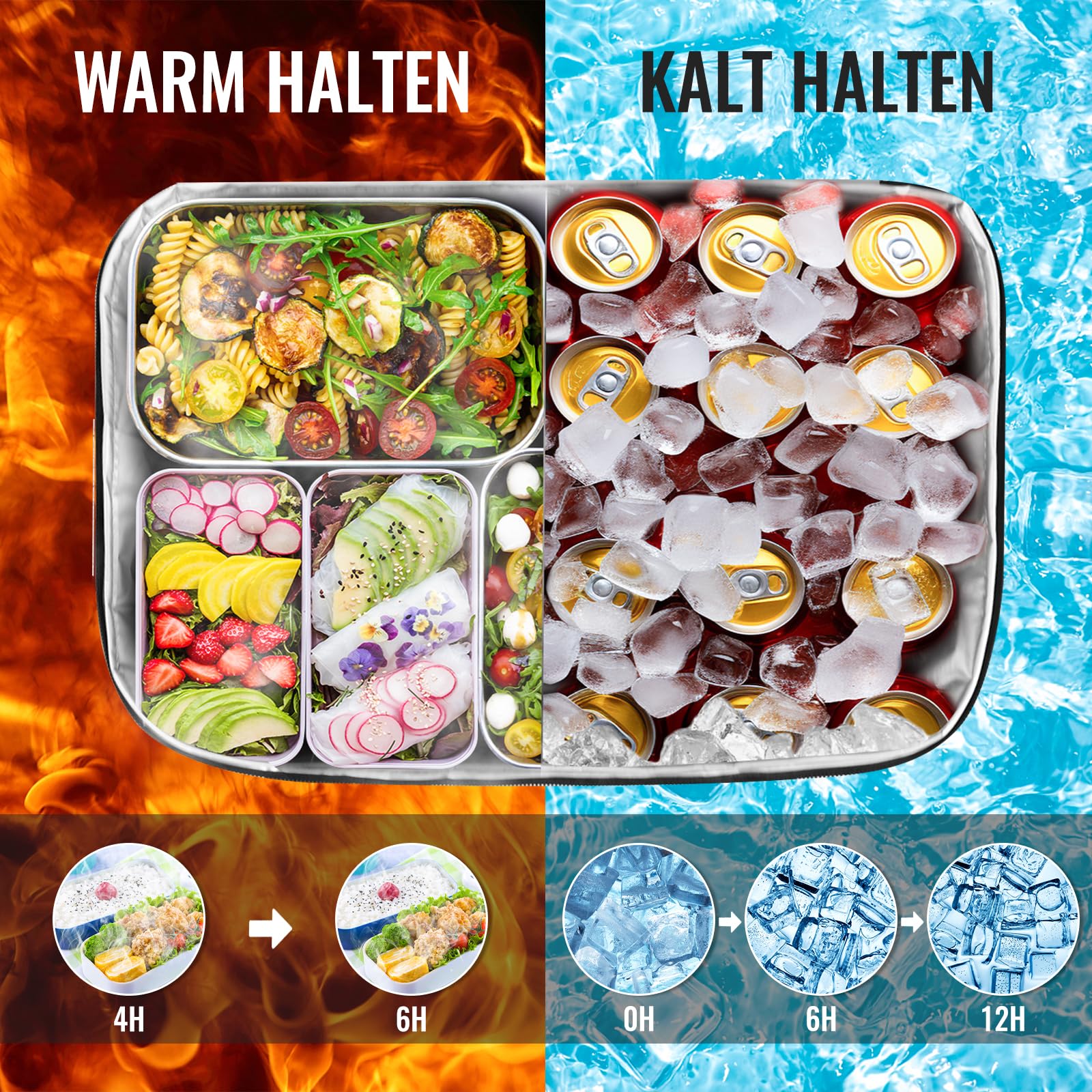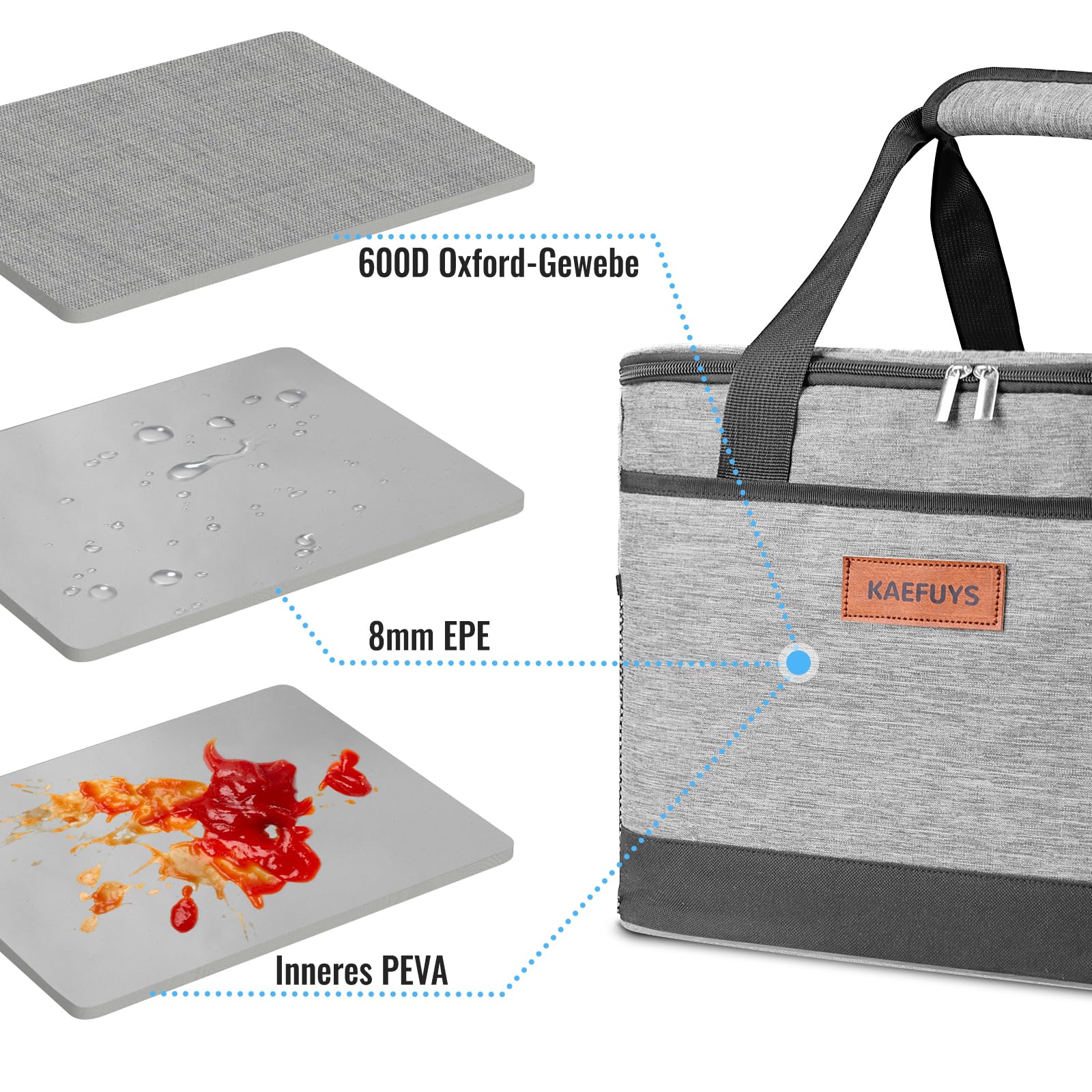 ["33 Liter capacity: Cooler bag dimensions (approximately) 17.7 x 9.8 x 11.4 inches, capacity 33 liters. The capacity is large and provides enough space for multiple sandwiches, apples, chips, juice, and other food and drinks. It perfectly meets the picnic needs of the whole family","Insulation and Cooling Function: The cooler box contains an 8mm thick EPE thermal insulation layer. High-quality insulation material ensures excellent thermal insulation performance of the cooler bag. The insulated bag can keep both cold and warm. And it stays cold for up to 12 hours","Waterproof and leakproof: The insulated bag is made of high-quality Oxford fabric on the outside, extremely durable. The inner lining is made of environmentally friendly PEVA material, waterproof, leakproof, and easy to clean. This ensures that you always have fresh and clean meals available","Portability: The cooler bag offers two carrying options: directly in hand or diagonally across the shoulder with the attached shoulder strap. It makes carrying easier and reduces the burden. In addition, the cooler bag can be folded to save space","Versatile: The Large Cooler Bag is designed for you with additional exterior pockets and 2 side pockets to store cutlery, napkins, drinks, magazines, and other small items. Ideal for picnics, festivals, BBQs, supermarket shopping, camping, or fishing trips"]