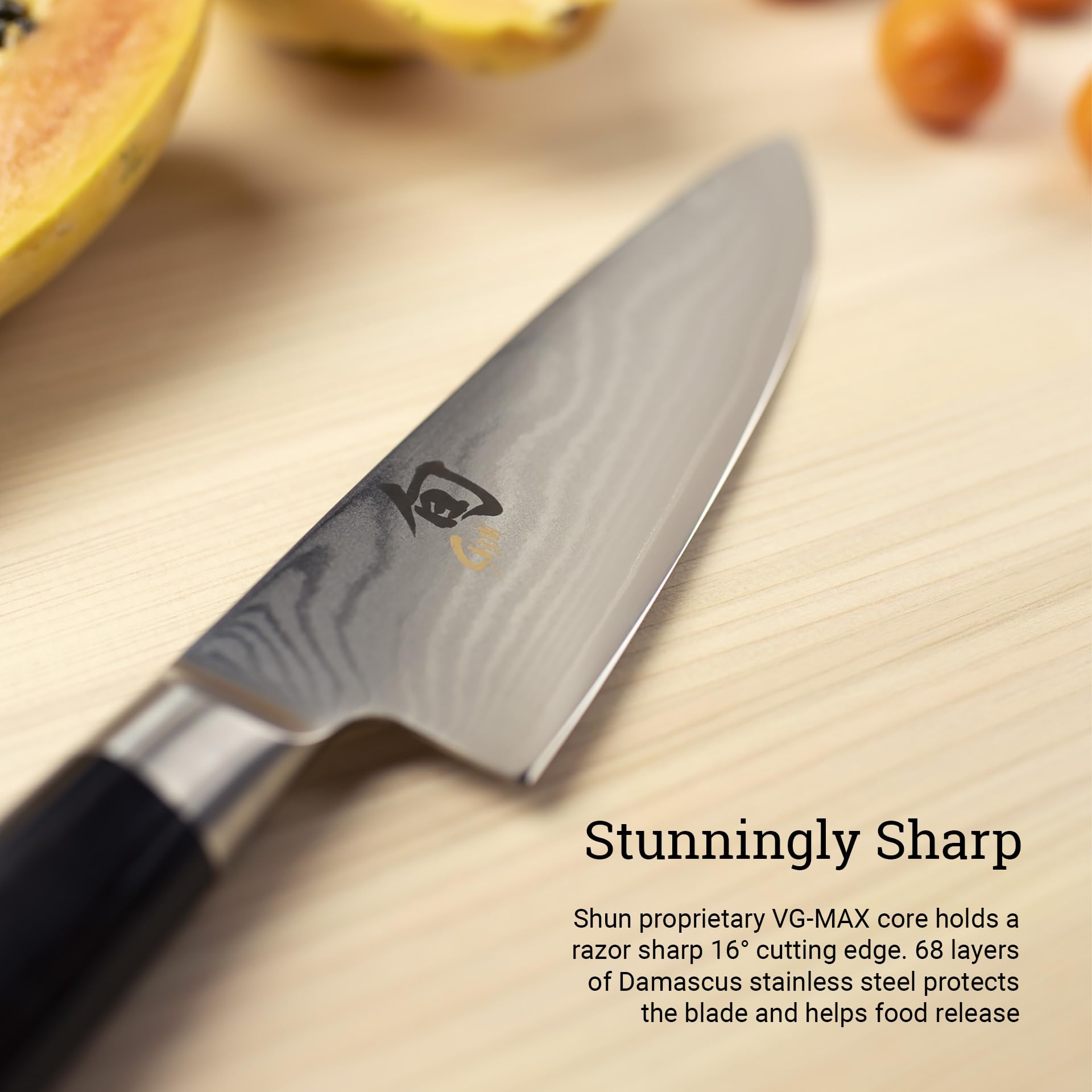 "Tradition in perfection: The KAI Shun Classic Japanese chef's knife with a 8-inch blade length combines traditional Samurai forging with modern technology for unparalleled sharpness. It is made of VG-MAX core steel and 32 layers of Damascus steel on each side.