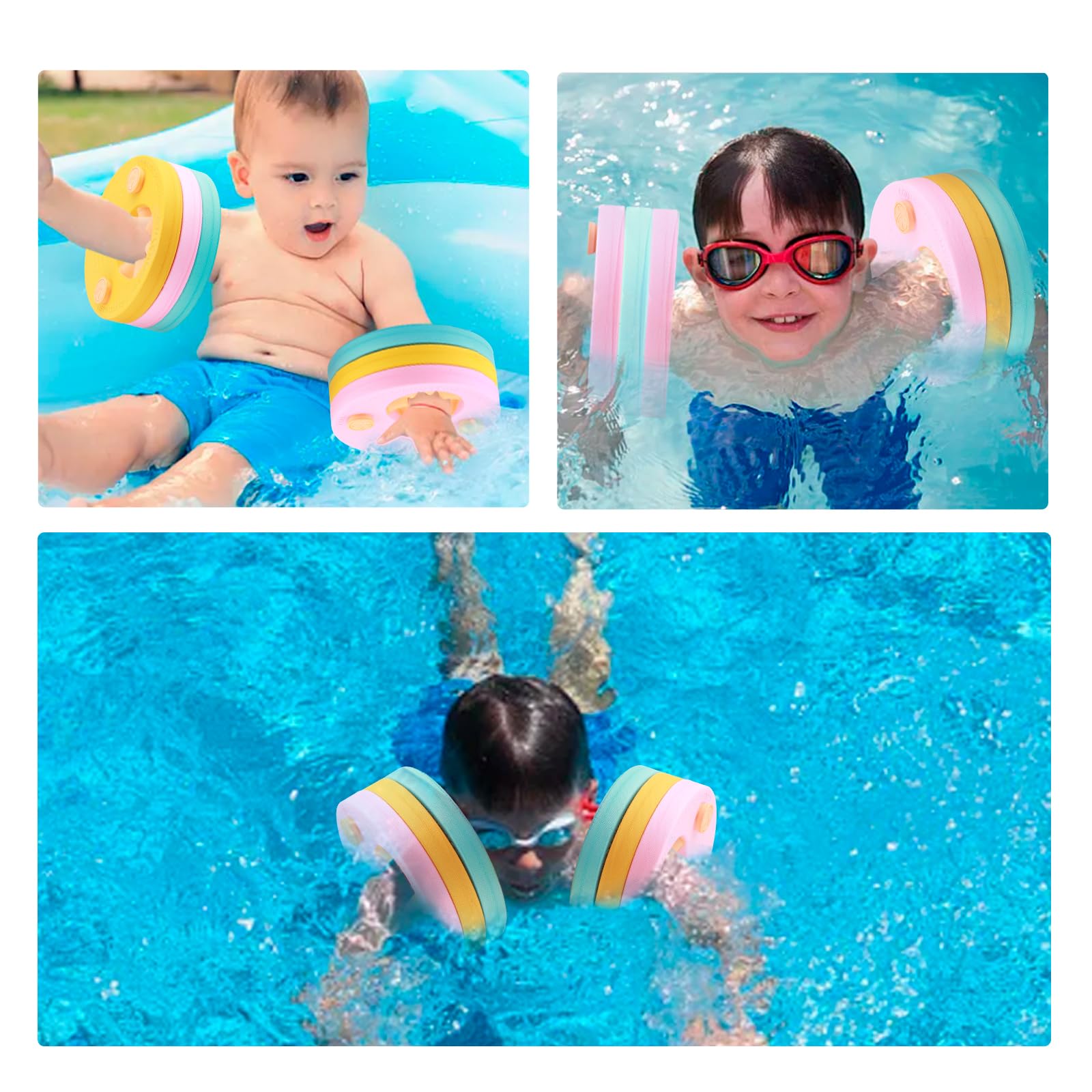 ["1. Material: Children's cuffs made of foaming EVA materials, the load capacity can reach 66 lbs, suitable for children to swim. Non-stick coating and non-absorbent, safer and more reliable than ordinary inflatable products. The skin-friendly material ensures the best comfort and prevents friction on the skin.","2. Product configuration: Baby cuffs with a single diameter of 7.36 inches, thickness 0.94 inches, consisting of three colors blue, red, and yellow, bright colors, very beautiful.","3. Suitable for the crowd: very suitable for children learning to swim with an arm circumference of less than 3.3 inches","4. Product features: No inflation required before use, easy to operate. The optimized position of the water increases the safety of children and toddlers in the water.","5. Warm reminder: This product is only suitable for children to learn how to swim and can only be used as a swimming aid."]