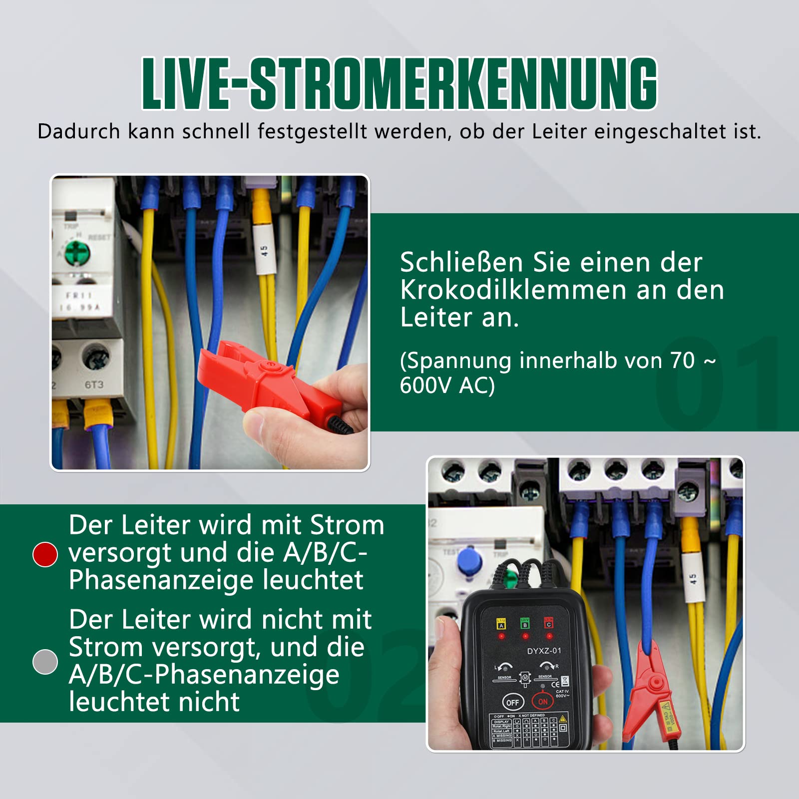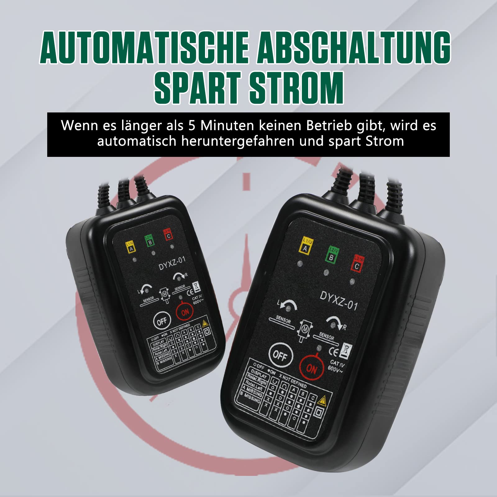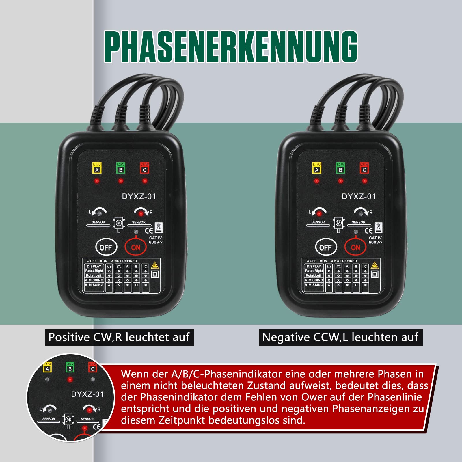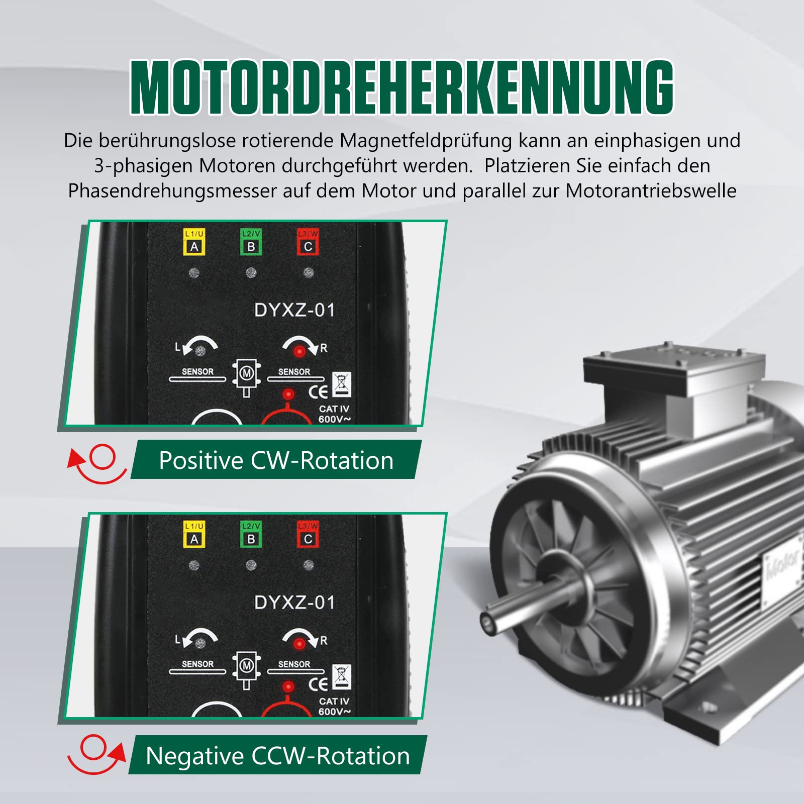 ["Multifunctional Rotary Field Meter 3 Phase: Our rotary field meter has various functions such as phase sequence detection, phase loss detection, detection of open circuits, voltage detection, and motor rotation detection. The phase meter can quickly and accurately detect the phase loss position of the line.","Sensor clip for contactless measurement: This rotary field meter 3 phase uses a clip for contactless inductive measurement, without removing phase wires or touching exposed live high voltage wires.","Check motor rotation direction contactlessly: Contactless detection of rotary magnetic fields for single-phase and three-phase motors possible. Simply place the phaser parallel to the motor drive shaft on the motor and measure the motor rotation.","Direction of rotation indicator: When phase indicators A, B, and C are all on, the R indicator lights up for positive phase and the L indicator for negative phase. If one or more of the phase indicators A, B, and C are off, the phase wire corresponding to that phase indicator is dead. Please check the respective phase for power failure.","Voltage and wire break detection: The rotary field meter can detect if the line is live, can also detect if the line is faulty, and quickly locate the position of the wire break.","Automatic shutdown and carrying case: When the rotary field indicator is inactive, the three-phase rotator automatically shuts off after about 5 minutes to save power and extend battery life. The three-phase rotary field meter comes with a carrying case for easy transportation and storage."]