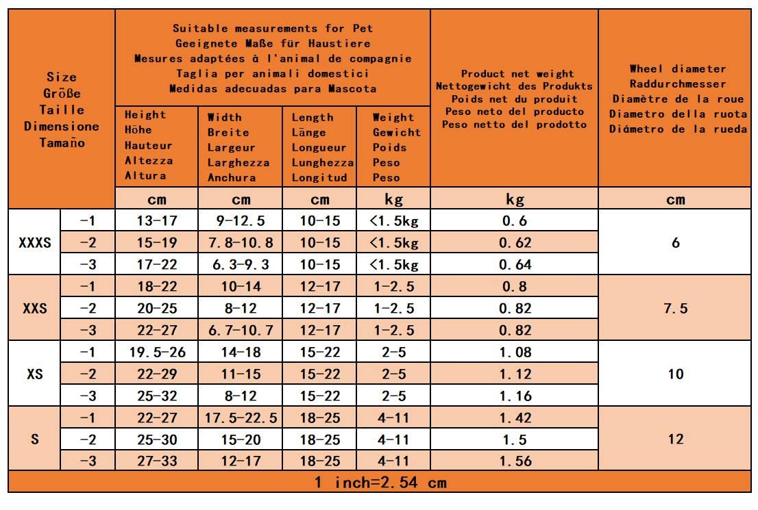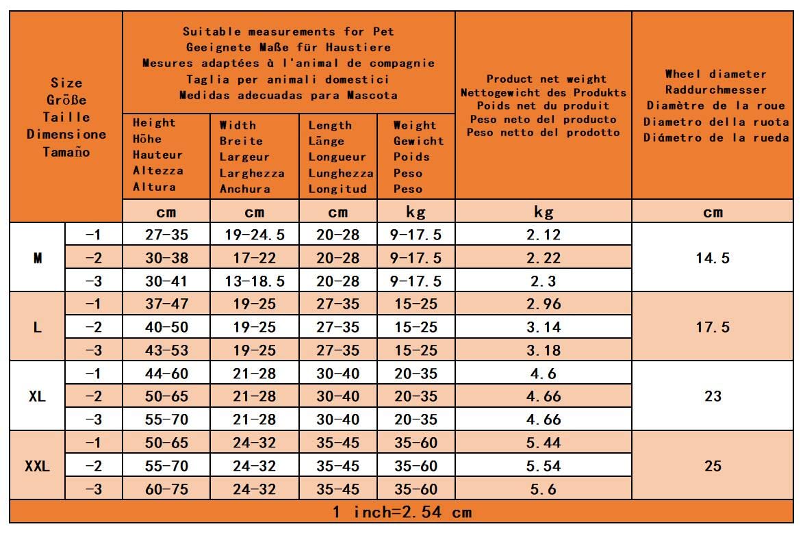 "Size: Please note the measurement method! (Measurement of height, width, length, and weight of the pet) Unit: inches; XL-1: Pet height 17-23, Pet width 8-11, Pet length 12-16, Pet weight 44-77lbs, Net weight of the product 10.14lbs; XL-2: Pet height 20-26, Pet width 8-11, Pet length 12-16, Pet weight 44-77lbs, Net weight of the product 10.28lbs;