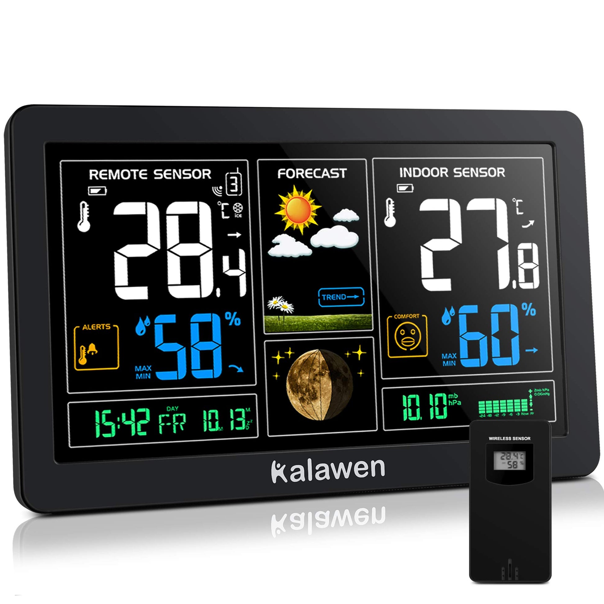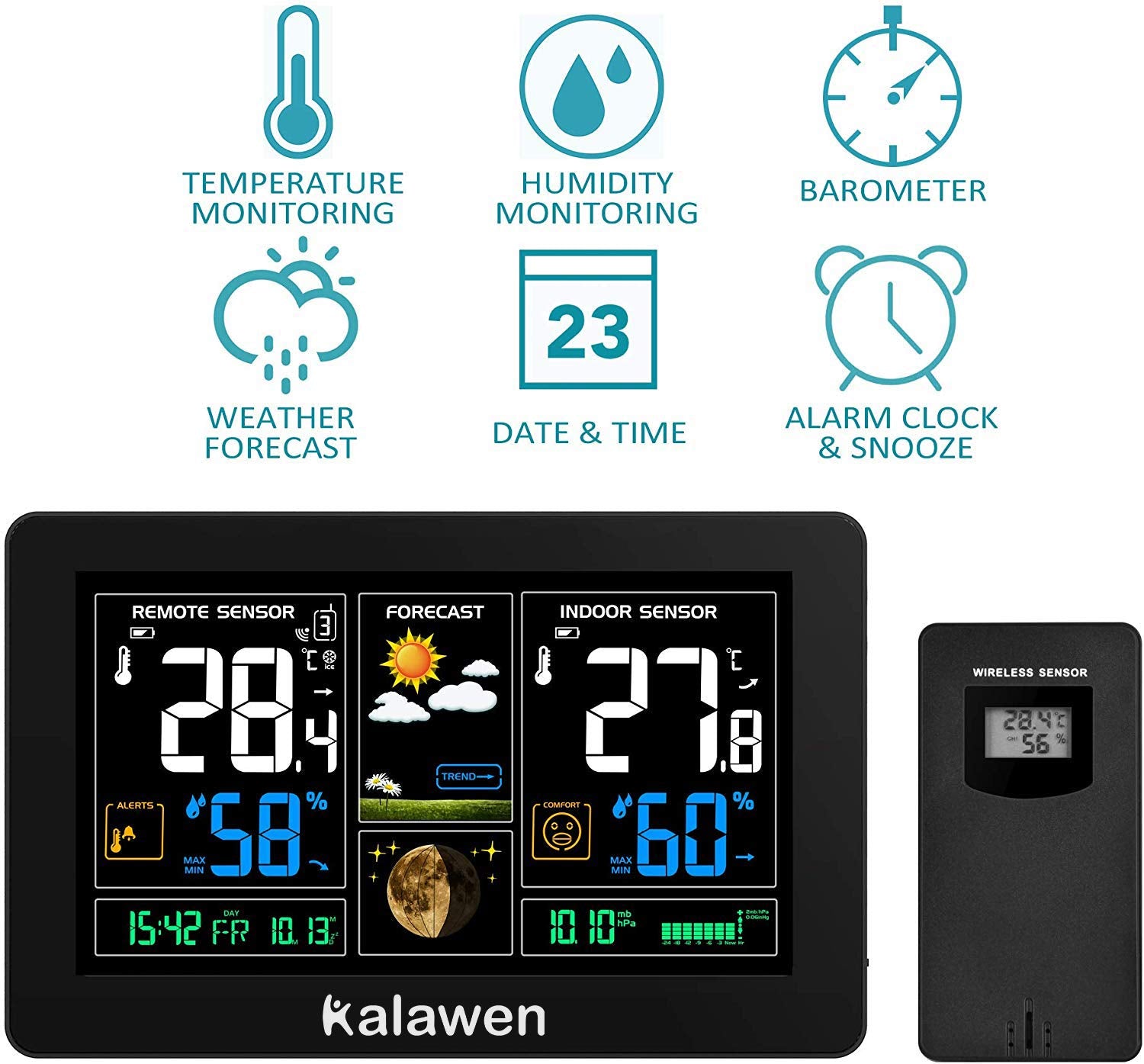 【Convenient and practical】The Kalawen weather station with weather alarm comes with a sensor that captures data in real-time directly outside. They are based on weather stations monitoring specific climate-related variables, including changes in temperature, humidity, and air pressure, to provide a 12-24 hour forecast tailored to your needs. The mini meteorological station can be mounted on the wall or on a table.