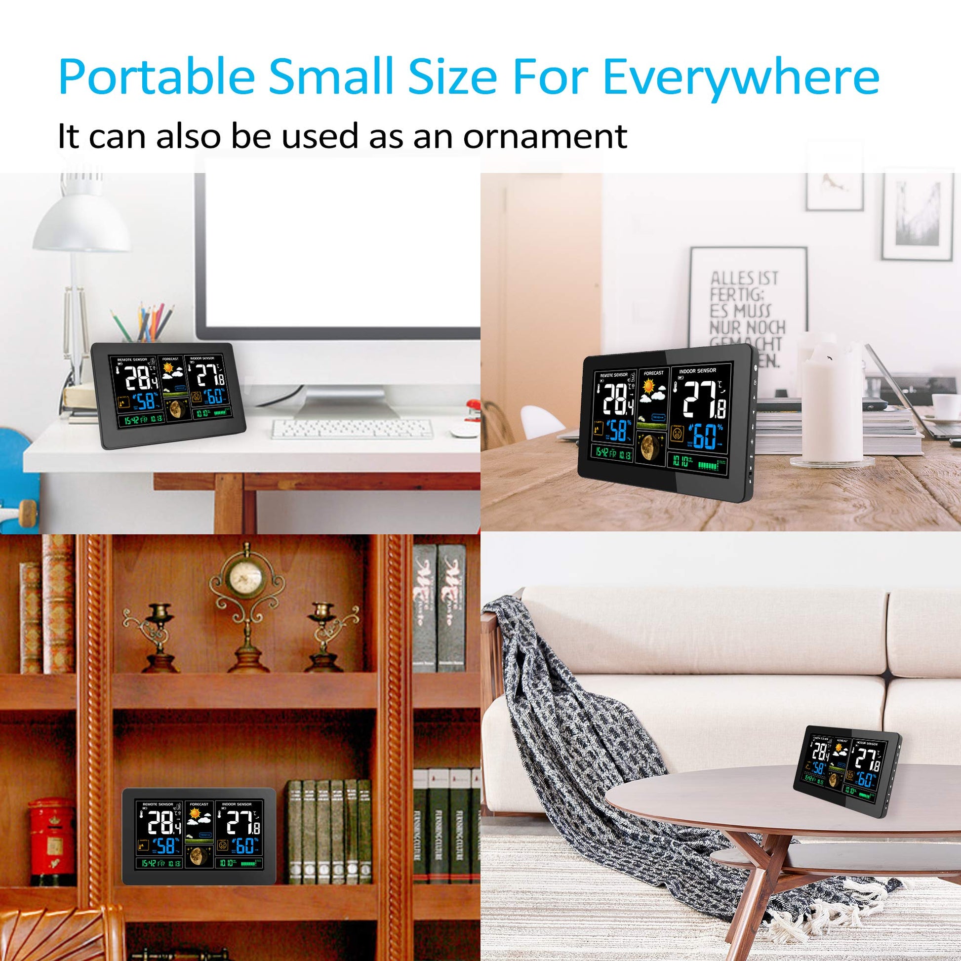 ["9 in 1 Weather Station with Outdoor Sensor】Outdoor temperature and humidity, weather forecast, indoor temperature and humidity, moon phase and date, alarm and snooze, barometer. Our weather station makes it easier for you to know the weather and to have a more comfortable and pleasant daily life.