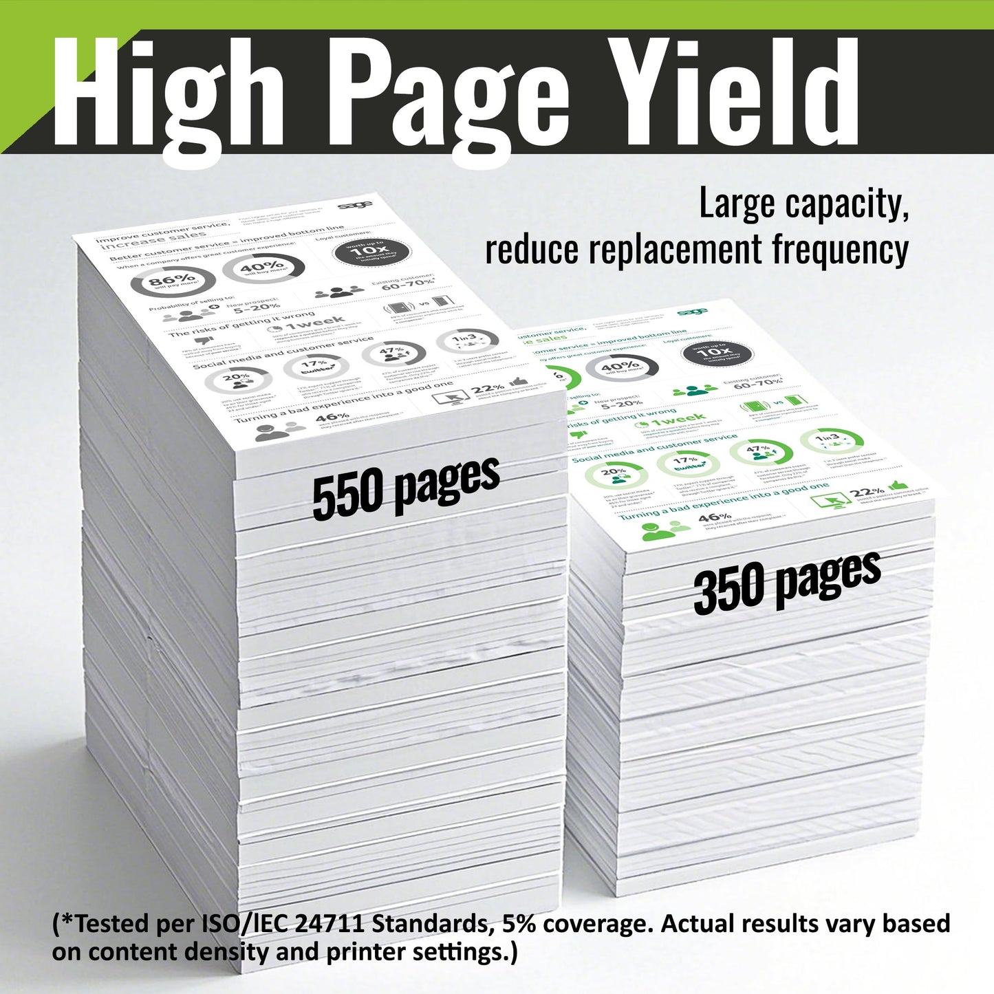 High page yield, more prints: Black: 550+ pages, Color (C/M/Y): 350+ pages. (Tested according to ISO/IEC 24711 standards, 5% coverage)