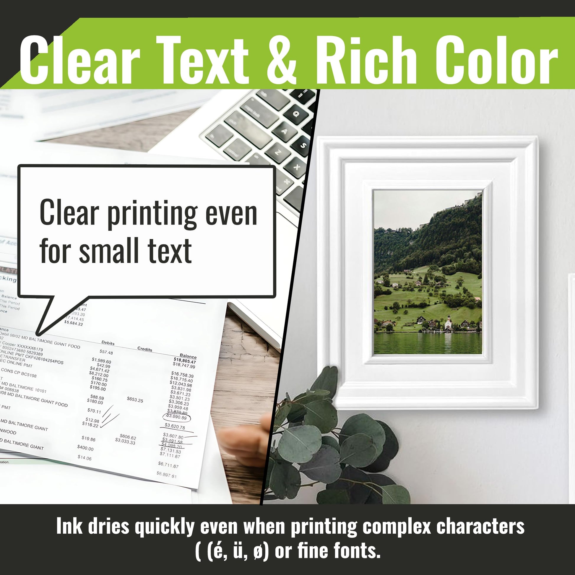 Works perfectly on printer paper, photo paper, glossy paper, matte paper, label paper, and card/heavyweight paper. Guaranteed print quality: Up to 98% smudge resistance, quick-drying ink, even with complex characters (é, ü, ø) or fine fonts. Delivers vibrant, realistic colors for documents and photo prints. The advanced clog-free formula ensures long nozzle life.