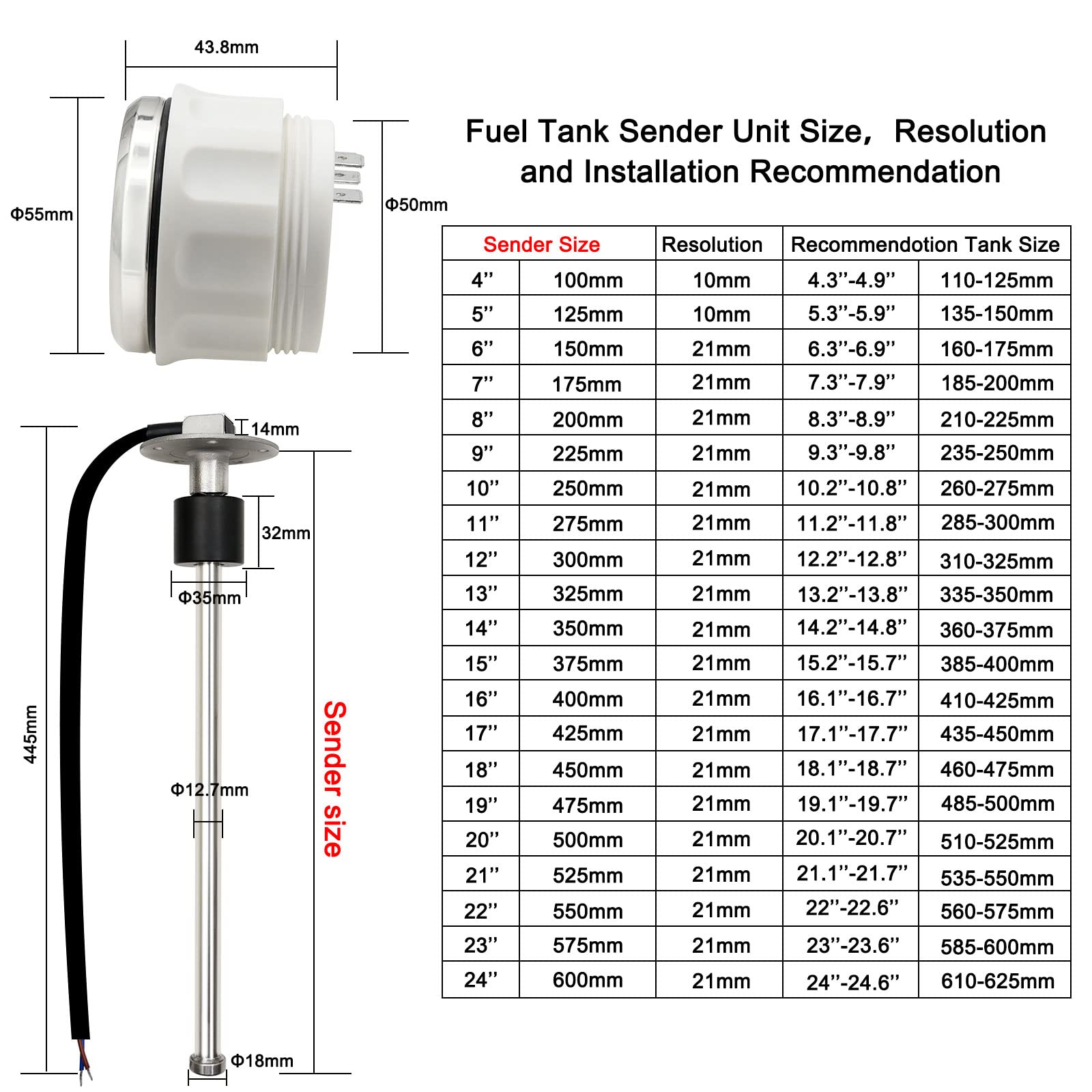 "Wide application: This fuel level gauge is compatible with most European Standards (0-190 Ohm) sending units. Applicable for motorhomes, agricultural vehicles, diesel vehicles, suitable for fuel sending unit for diesel/gasoline level monitoring. Fuel tank sending unit can support fuel level gauge and water level gauge for boat/motorhome/truck. Perfect for measuring and displaying the amount of fuel in your boat or vehicle tank.",