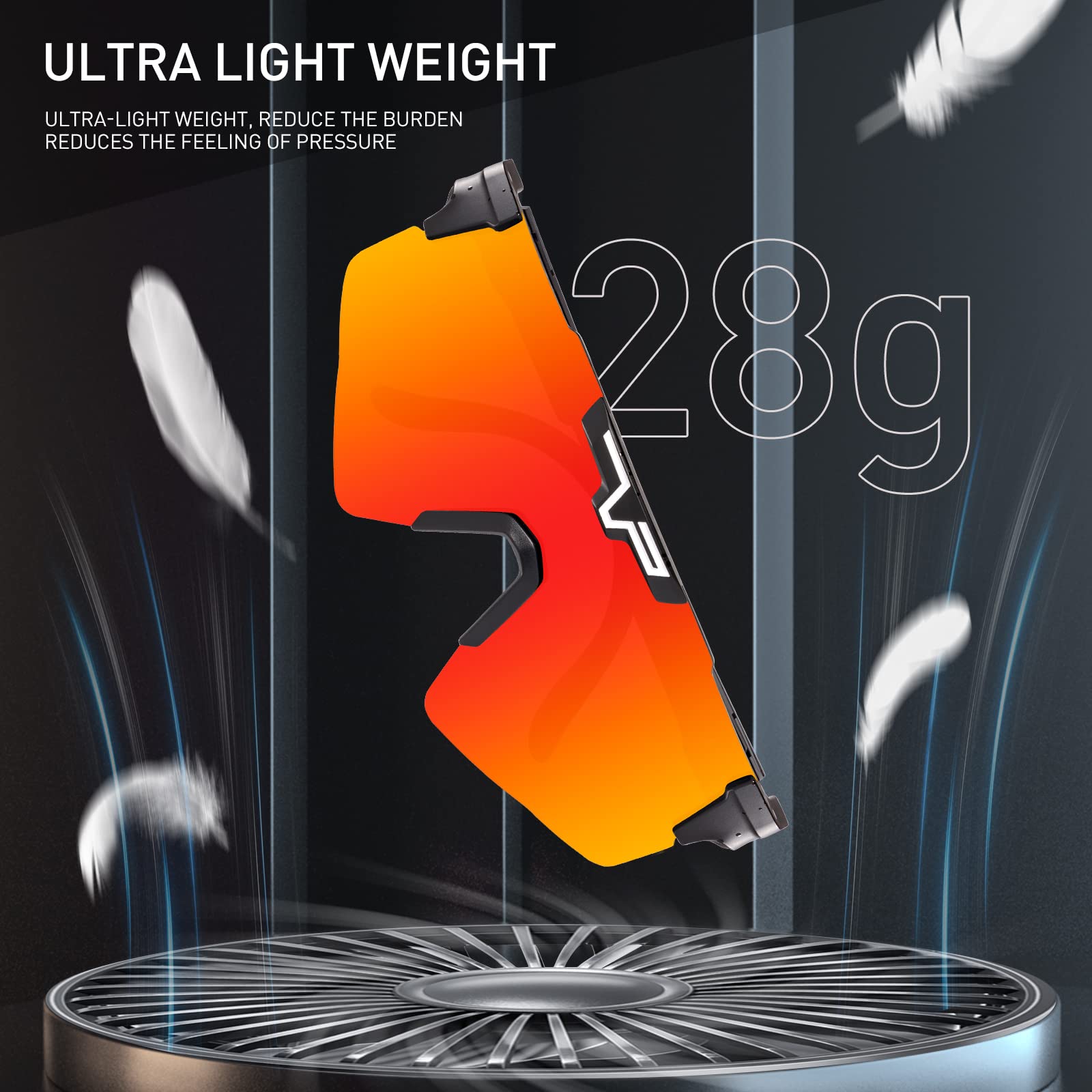 ["TR90 frame and rubber nose pads"] The lightweight and sturdy TR90 frame weighs only 28 grams for the entire cycling glasses. Equipped with a hydrophilic rubber nose pad, the glasses provide good grip even in moisture and ensure they do not slip during intense movement.