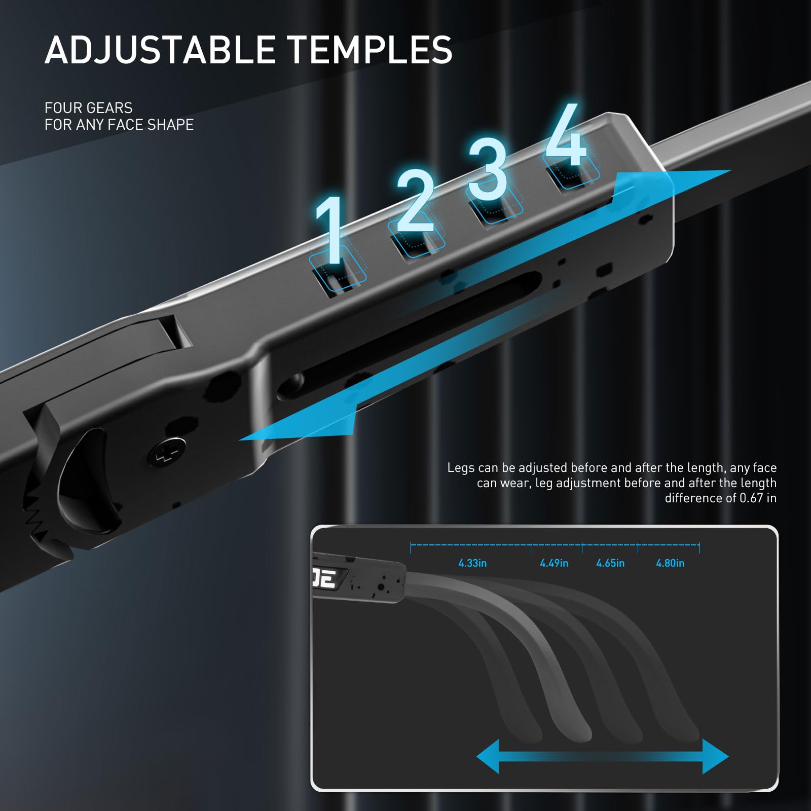 ["Adjustable 8-stage temples"] The hidden design of the temples allows for extension or shortening by 4 stages and height adjustment in 4 stages for an optimal fit according to the facial shape. The ergonomic frame always ensures the best height for the glasses and is suitable for all face shapes.