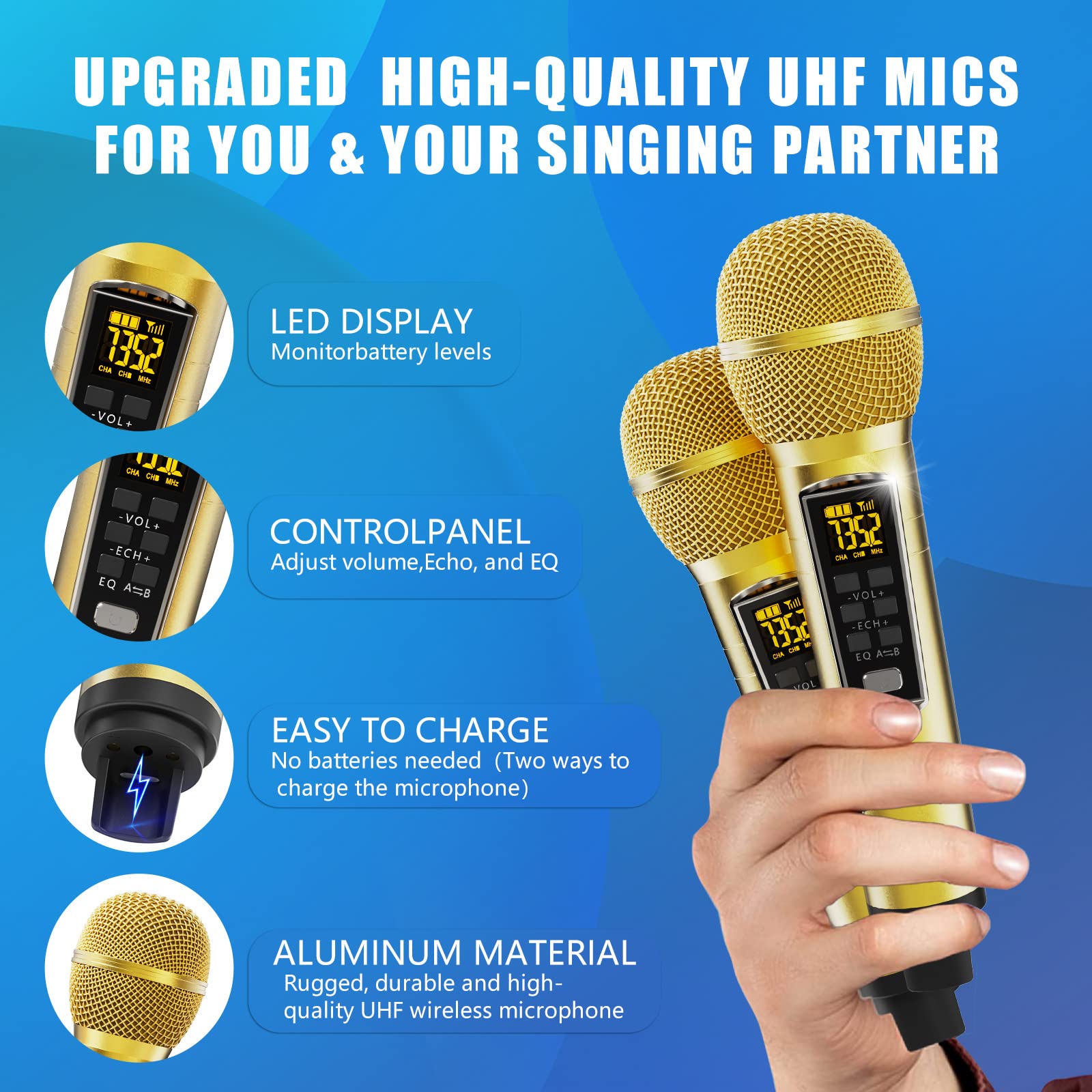Karaoke machine for adults and kids, portable Bluetooth speakers with 2 UHF wireless microphones Karaoke speaker PA system with colorful gradient LED lights for home parties - Gold
