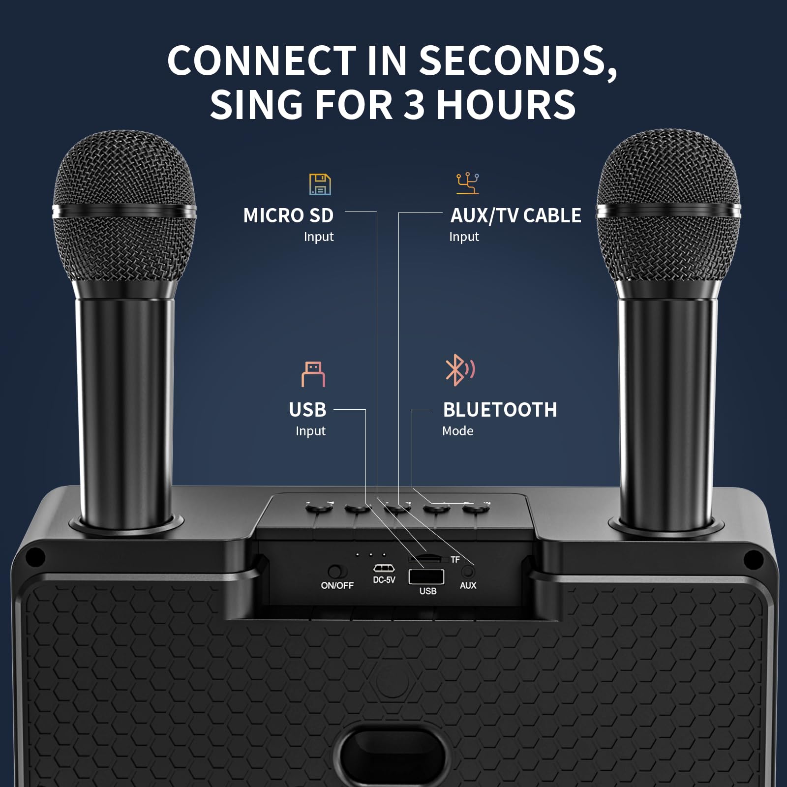 ["Excellent Karaoke Sound】The portable karaoke machine is equipped with 2*15W premium full-range speakers, crisp highs, precise mids, and deep bass for experiencing rich, vivid, and lifelike sounds. Realize a surround sound that provides shocking audio-visual effects. Perfect for parties, karaoke with family, weddings, gatherings, and outdoor activities. A perfect Christmas gift for kids and adults.","All-in-one Bluetooth Speaker System】Multifunctional portable PA system features the latest Bluetooth 5.0 chip, ensuring seamless connection with smartphones/tablets for music playback. Karaoke machine for the TV with everything you need included! Your professional karaoke equipment includes 2 wireless microphones, AUX cable & charging cable/plug, a smart device screen holder, a manual, and a 60-day warranty. Ideal choice for karaoke at home.","Dual Wireless UHF Microphones】A Bluetooth karaoke machine with 2 microphones that will double the memories for every boy and girl. The 2 portable, rechargeable, wireless microphones for karaoke each have their own display; adjust volume, echo, and EQ for perfect karaoke pitch control. Every word of yours will be perfect! It would automatically connect when both are turned on. An ideal gift choice for your kids who are falling in love with performance and music for speech or vocals.","Easy & Play to Go】The powerful battery of the portable karaoke machine could give you up to 3-4 hours of playtime. Moreover, the speaker acts as a charging station, and the USB port allows power bank function to charge your smartphone. It weighs 1.26 kg and is lightweight, portable, and compact. You can easily take it anywhere for fun, and it is the perfect choice for parties, beaches, weddings, outdoor gatherings, and indoor activities.","Multiple Connectivity & Bluetooth 5.0】Your favorite hits can become karaoke songs on this amazing Bluetooth karaoke speaker! Karaoke machines have easy connectivity via Bluetooth 5.0/USB port/microSD card through many external devices like iPhones, Android phones, iPads, TVs, PCs, etc. The AUX cable can be used to connect to the TV and sync lyrics, allowing you to enjoy the ultimate karaoke machine at home.","Colorful Disco Lights】There are vibrant and color-changing LED lights on the front of the karaoke speaker. Press the 'LED' button to turn all lights on/off with one click. It has 7 light modes that can change color with the music beat. The colorful LED lights create a pleasant and romantic party atmosphere for you. You can use it for both formal and casual occasions."]